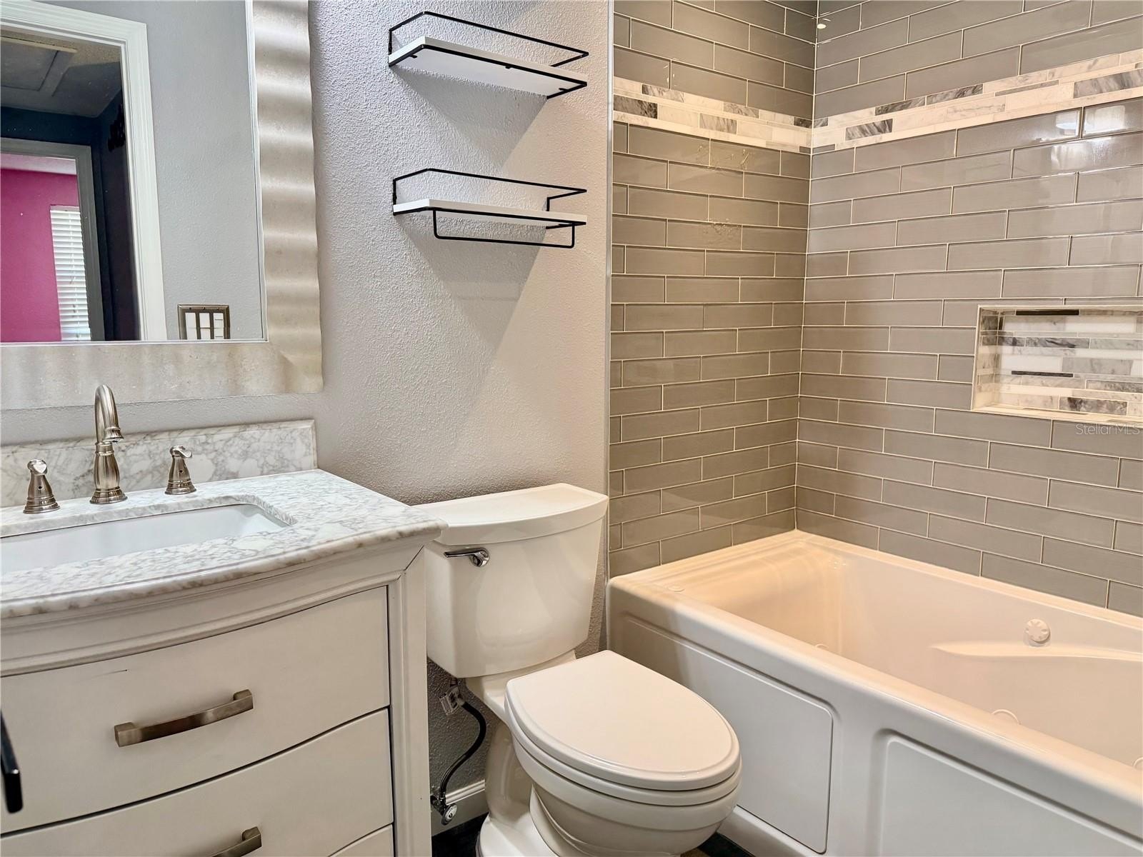 Step inside to discover luxury vinyl plank flooring flowing seamlessly throughout, setting an elegant tone from the moment you enter. The kitchen impresses with gleaming stainless-steel appliances and stunning granite countertops in soft shades of white and grey — a timeless palette that is both sophisticated and welcoming. Both bathrooms have been luxuriously renovated, with the second bath featuring a relaxing jacuzzi tub, perfect for unwinding after a long day.