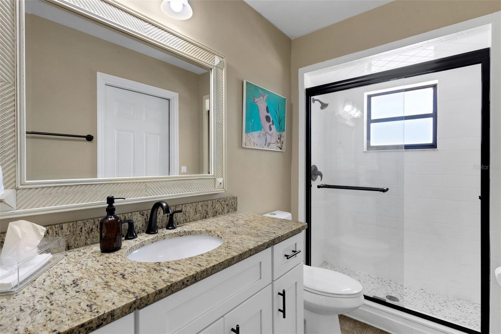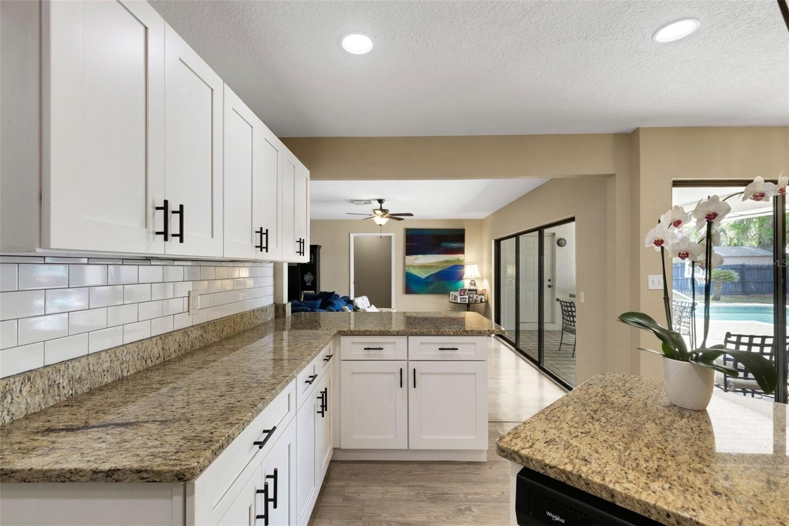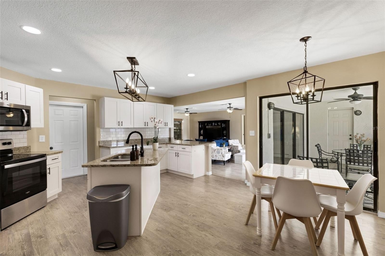 The kitchen is both functional and stylish, featuring granite countertops, stainless steel appliances, a subway tile backsplash, center island, breakfast bar, abundant cabinetry, a closet pantry, and a spacious dinette area—all thoughtfully designed for everyday living and gatherings alike. Sliding glass doors from the dinette lead directly to the covered porch, creating a seamless indoor-outdoor connection.