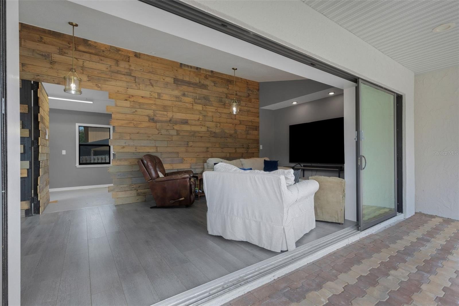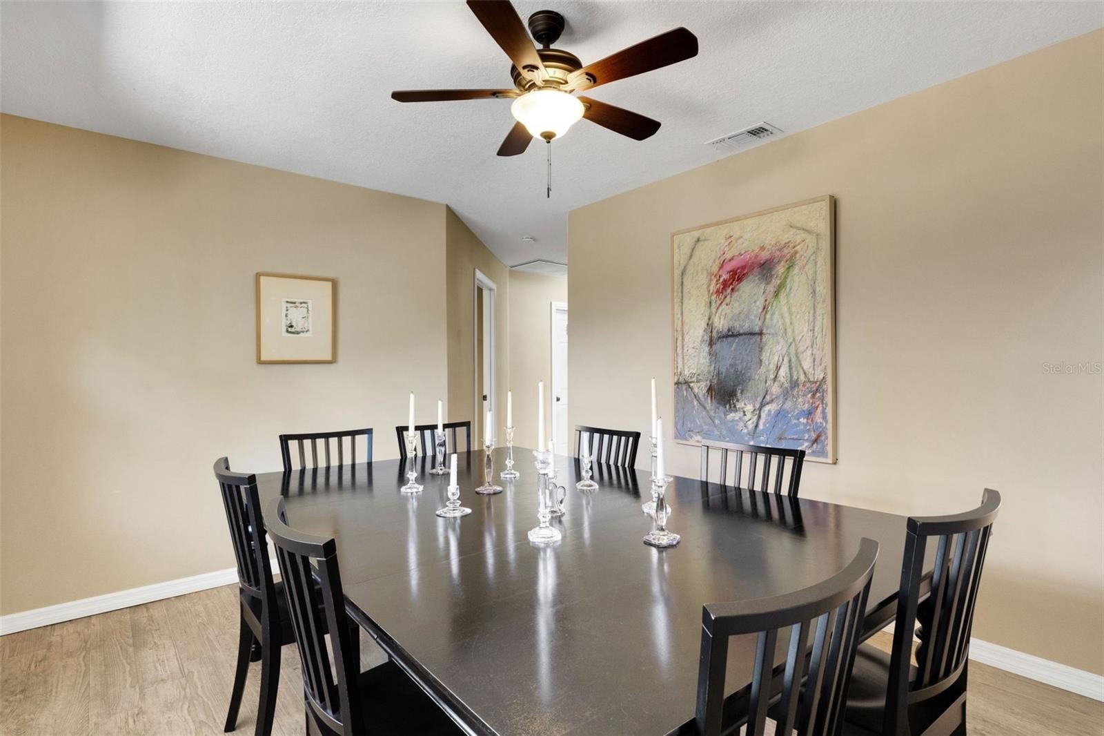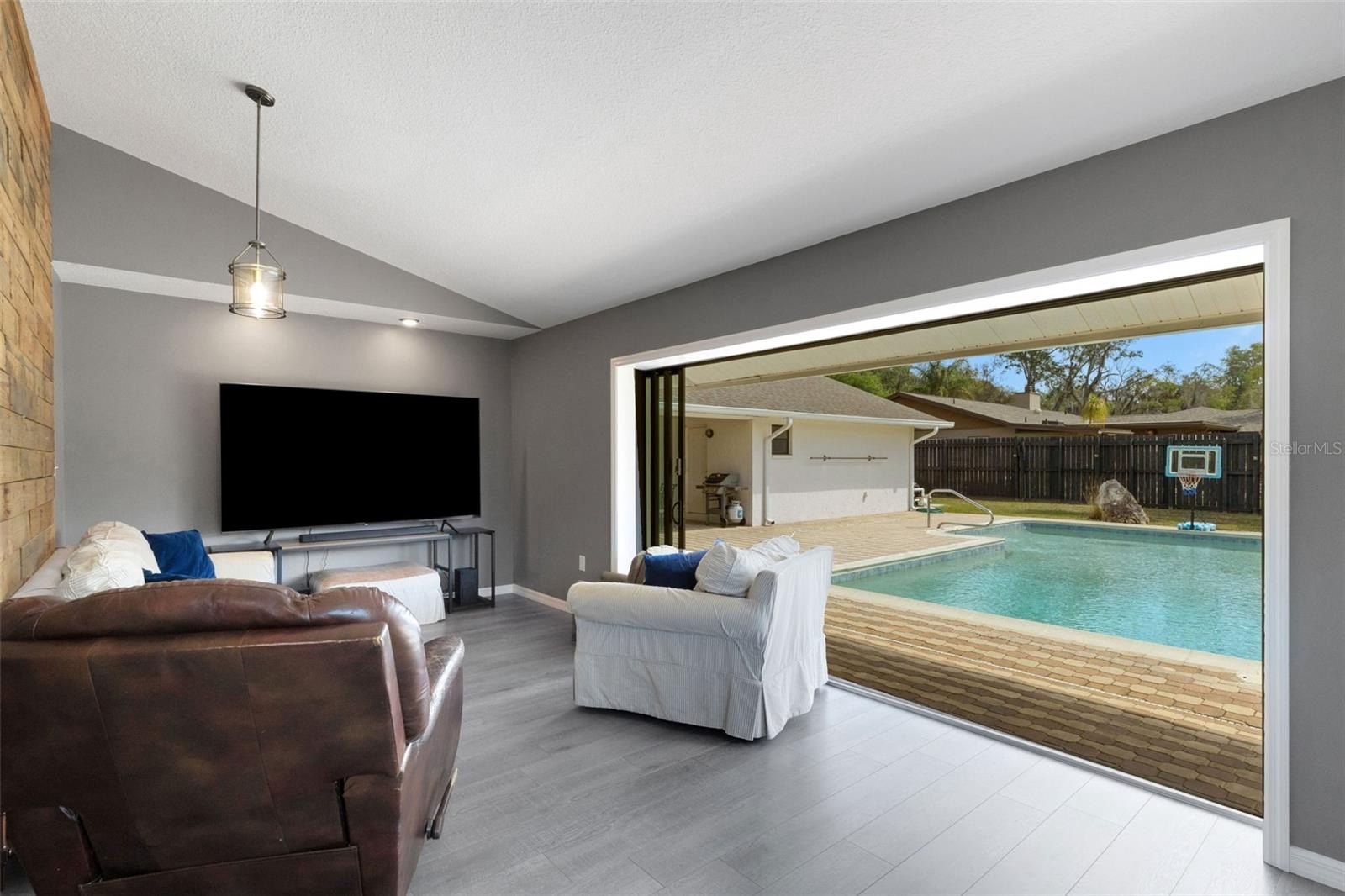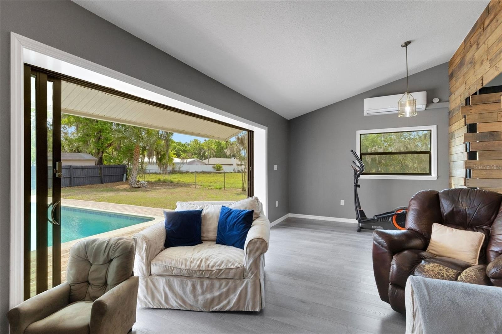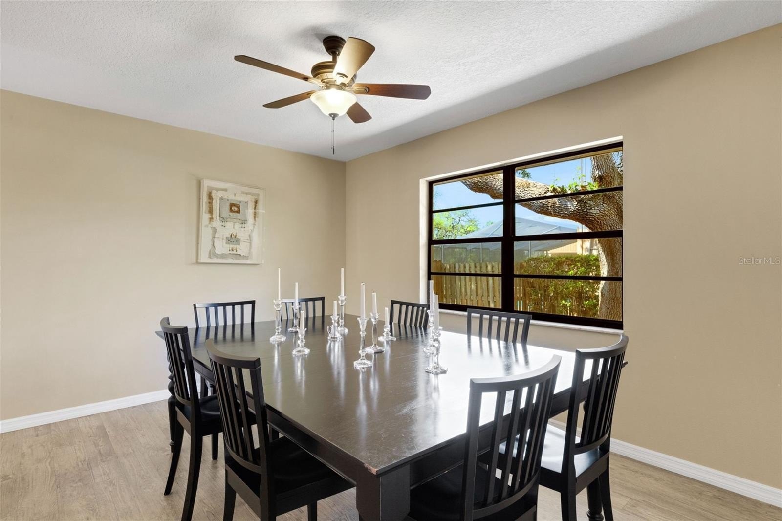 Inside, you’ll find a spacious layout featuring a formal dining room and an inviting living room centered around a charming wood-burning fireplace, creating the perfect setting for both everyday living and entertaining. The living room is filled with natural light and showcases a full wall of sliding glass doors overlooking the covered lanai, pool, private backyard, and peaceful green space beyond, enhancing the home’s open and airy feel.