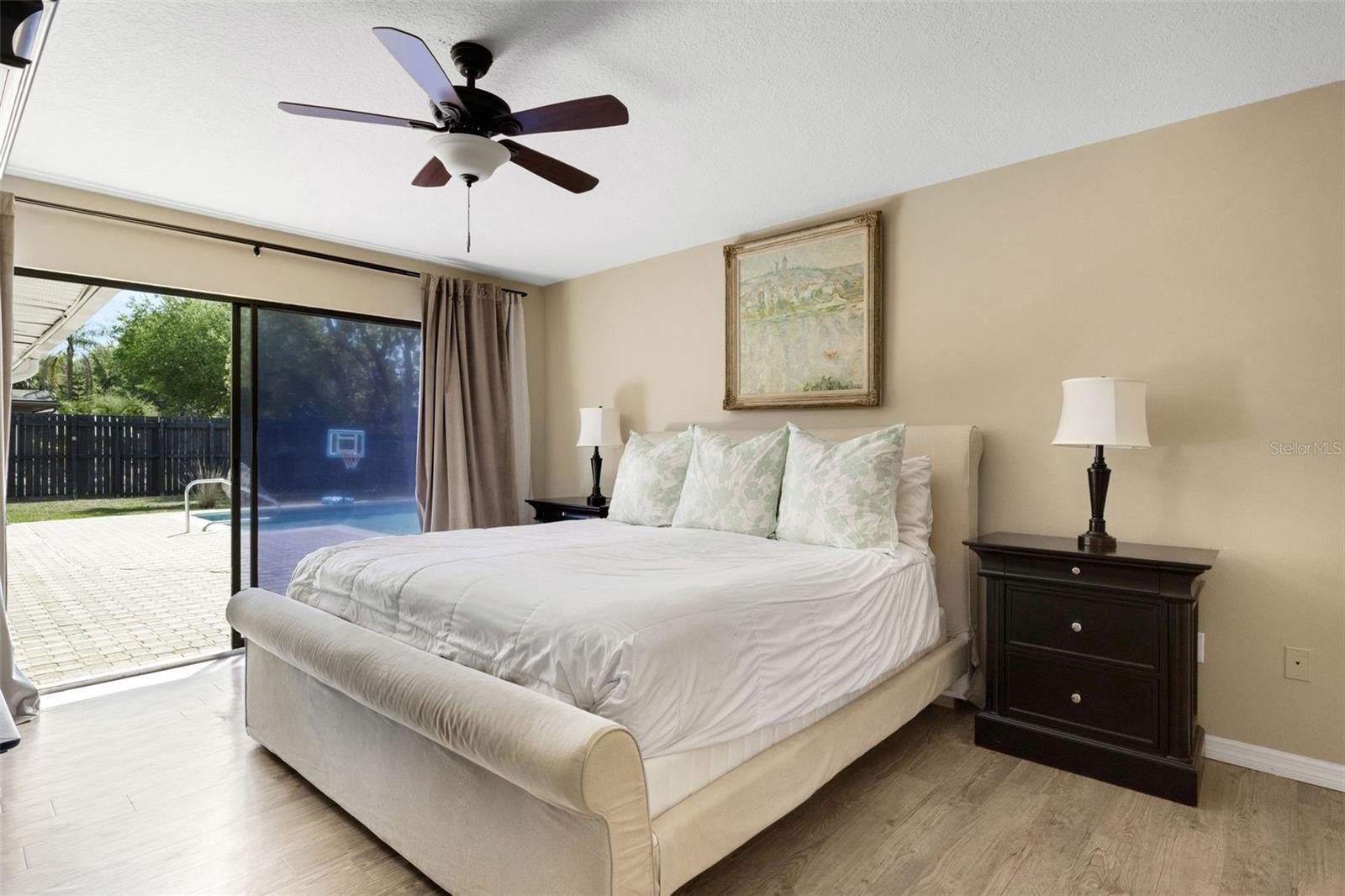The primary suite offers a relaxing retreat with double vanities, granite countertops, a walk-in closet, and private access to the pool area through sliding glass doors.