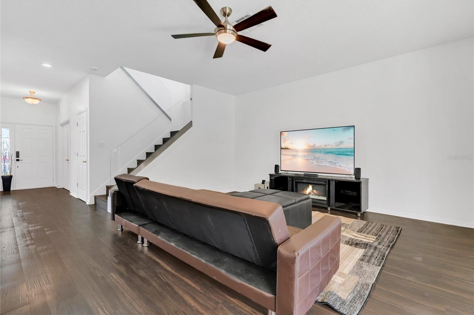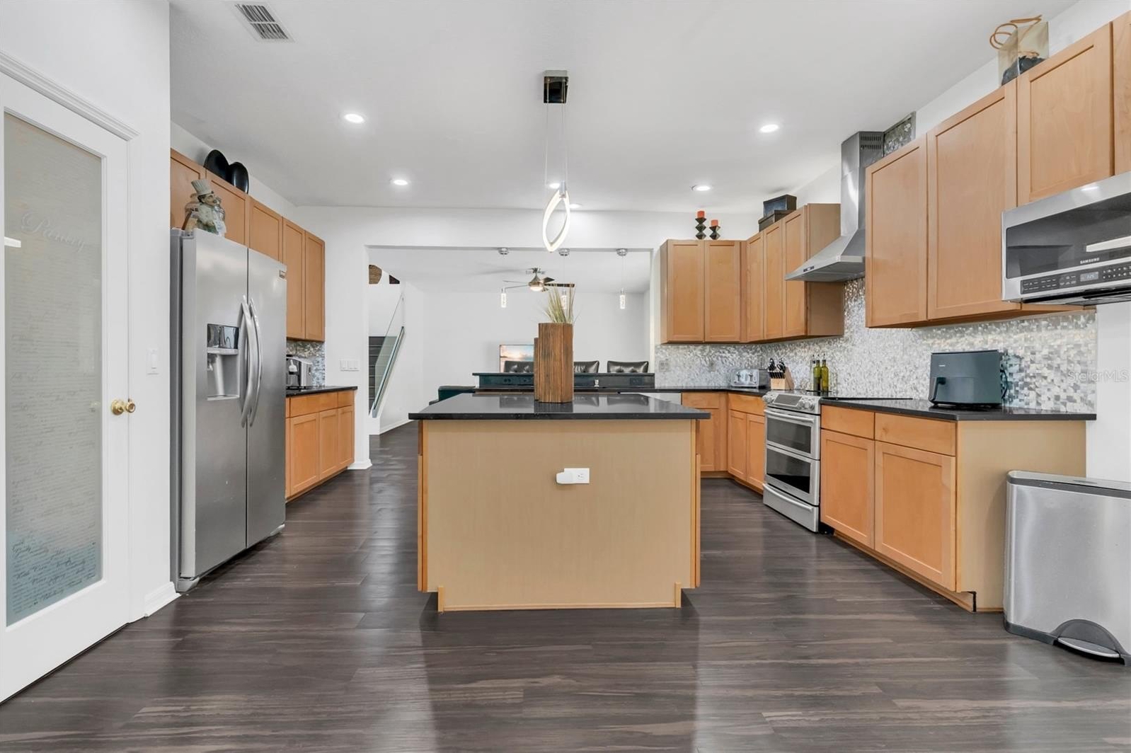 Continuing through the foyer, the layout opens into a spacious great room and downstairs family room, also with installed surround sound, which seamlessly flows into a secondary living area highlighted by three floor-to-ceiling sliding glass doors. This open-concept space connects to a breakfast nook and modern kitchen appointed with granite countertops, 42” Maple cabinetry, stainless steel appliances, an oversized walk-in pantry, and a large center island, perfectly suited for hosting and everyday living.