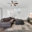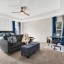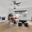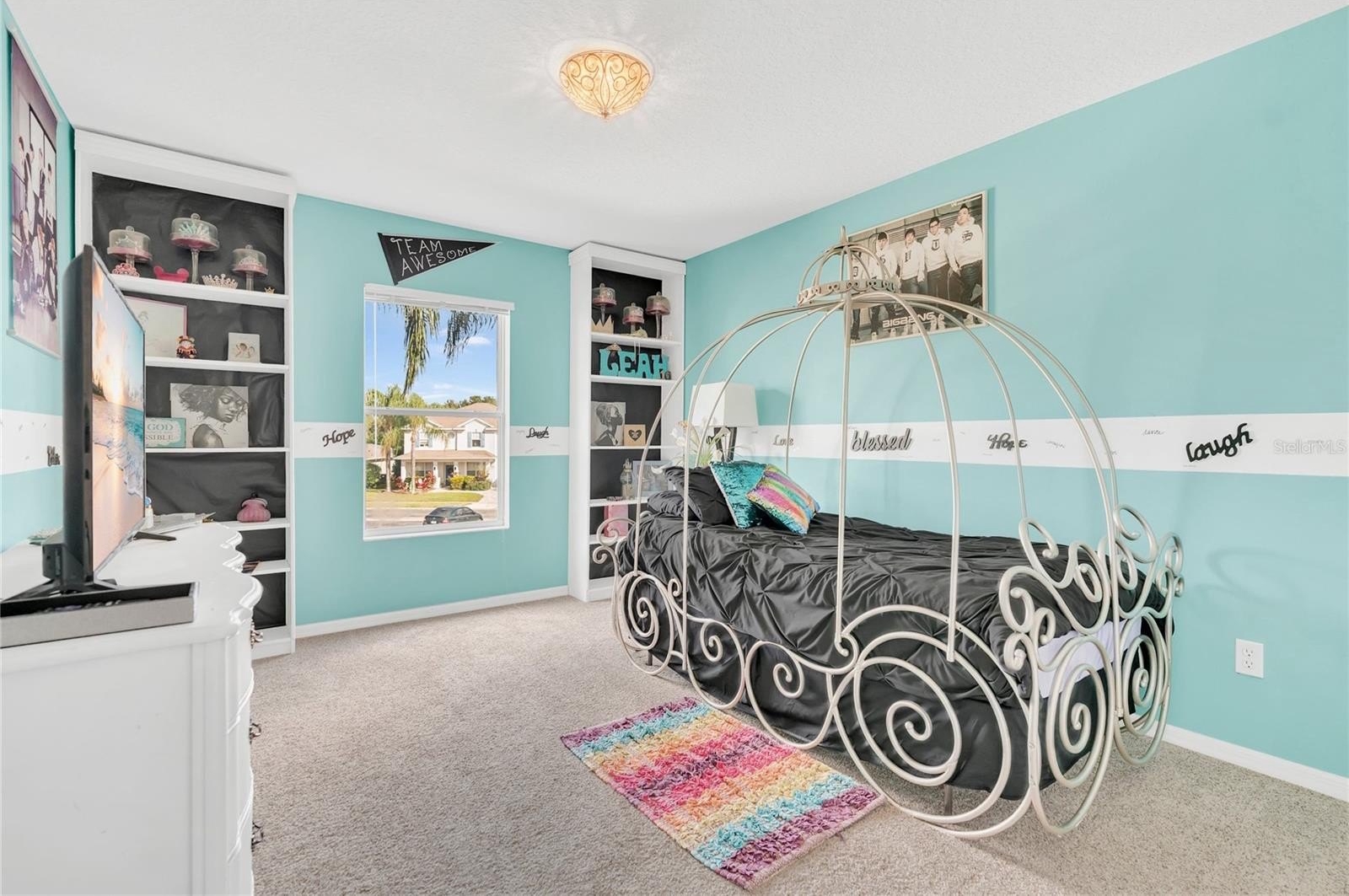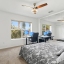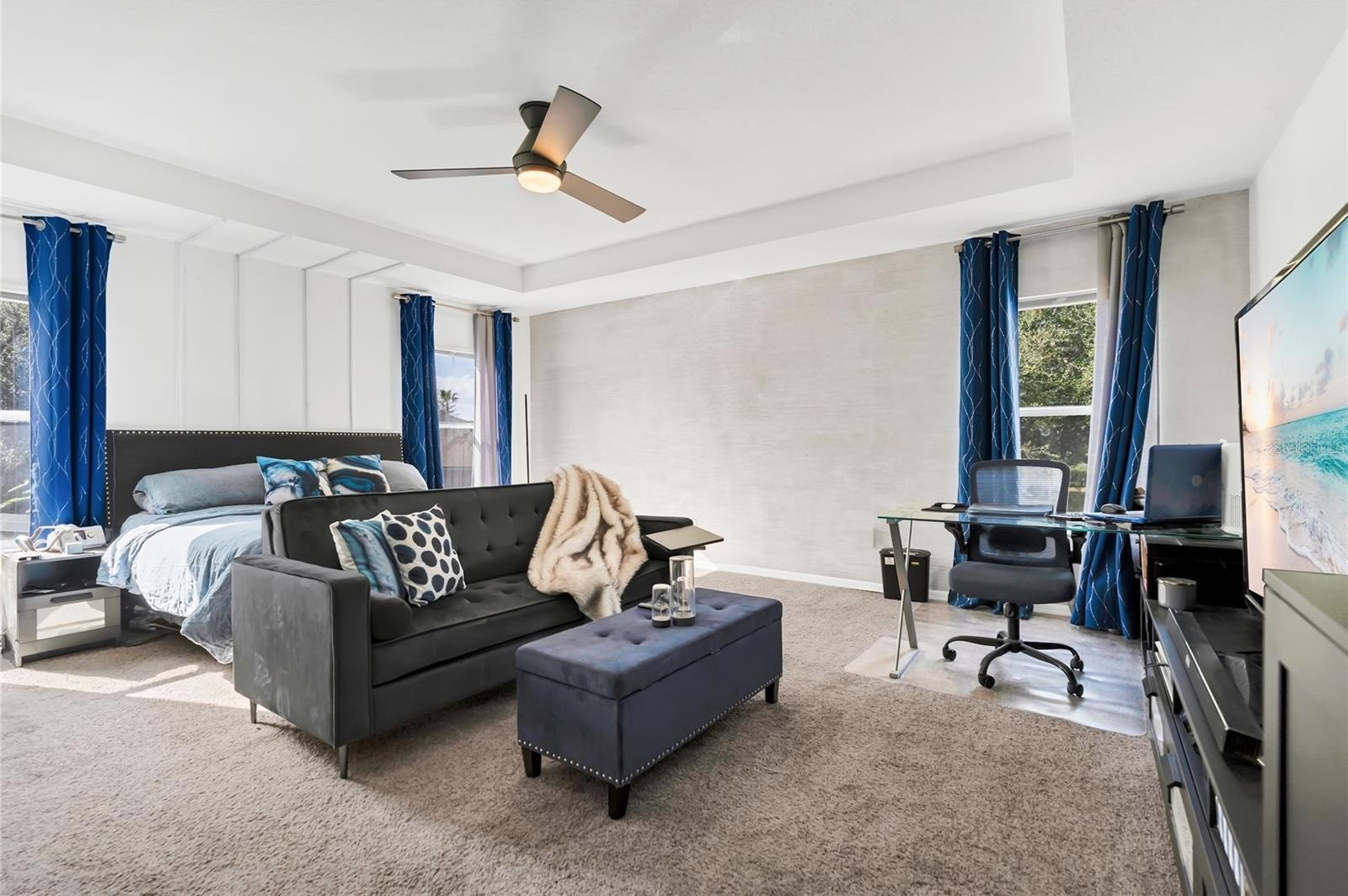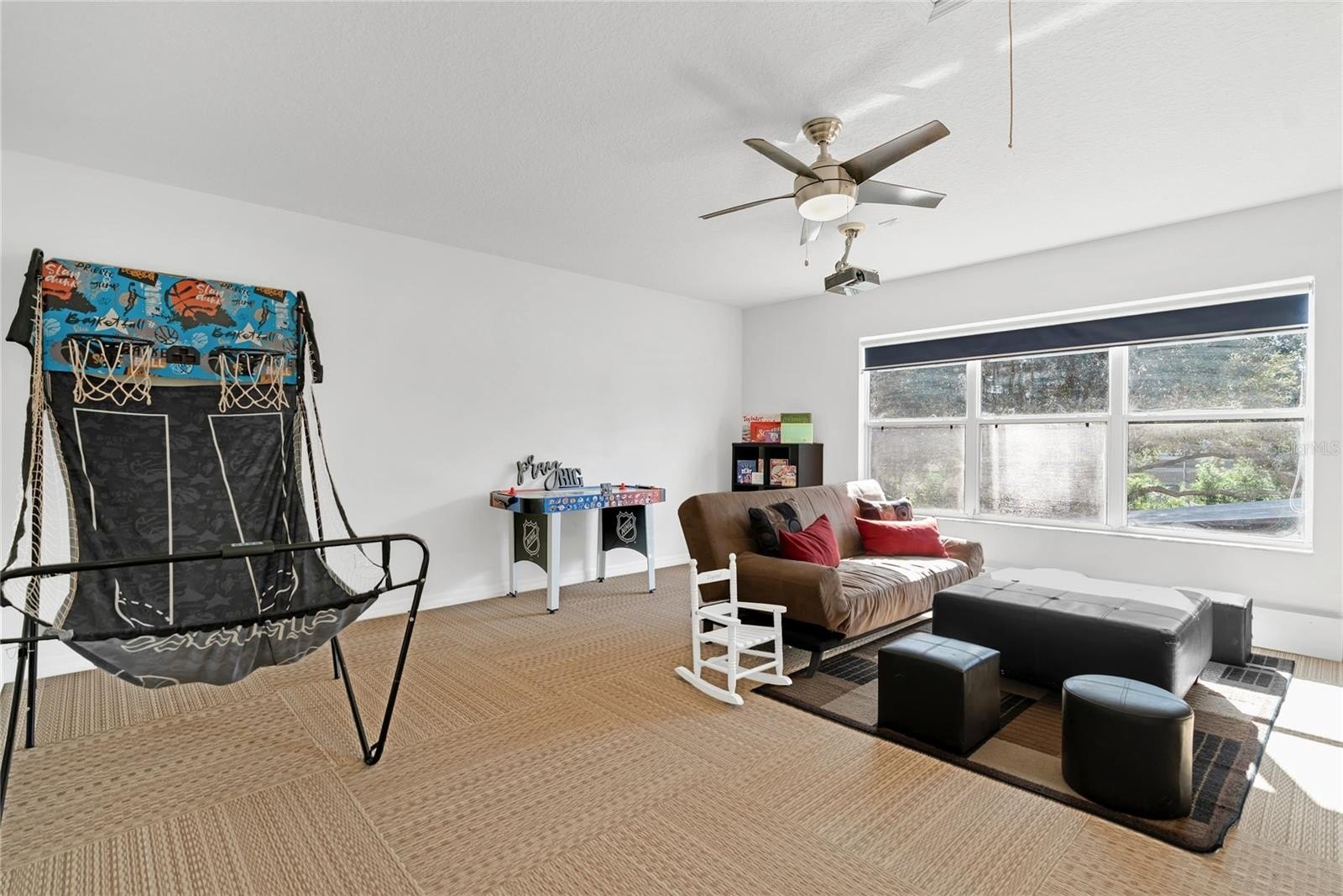 Ascending the elegant glass-banister staircase, the second level offers more than just sleeping quarters. An enclosed flex space/game room, wired for a projector and surround sound, features a 126” painted screen, creating an exceptional entertainment area. The upper level also includes generously sized bedrooms and a luxurious primary suite with tray ceilings, a spa-style jetted bathtub, separate walk-in shower, and two walk-in closets.
