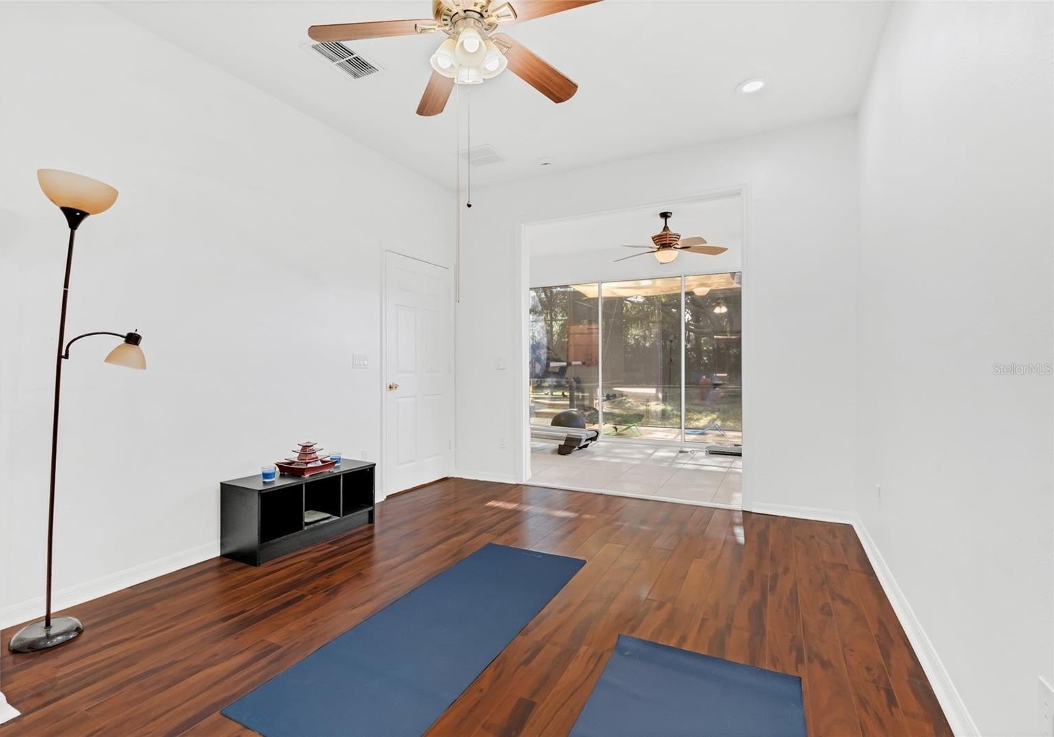 Just beyond the kitchen is an additional first-floor primary suite, ideal for in-law living, featuring widened doorways for wheelchair access and a permitted enclosed 15’ x 10’ living room. This private retreat includes two walls of floor-to-ceiling sliding glass doors overlooking the backyard, expansive patio, and pool area.