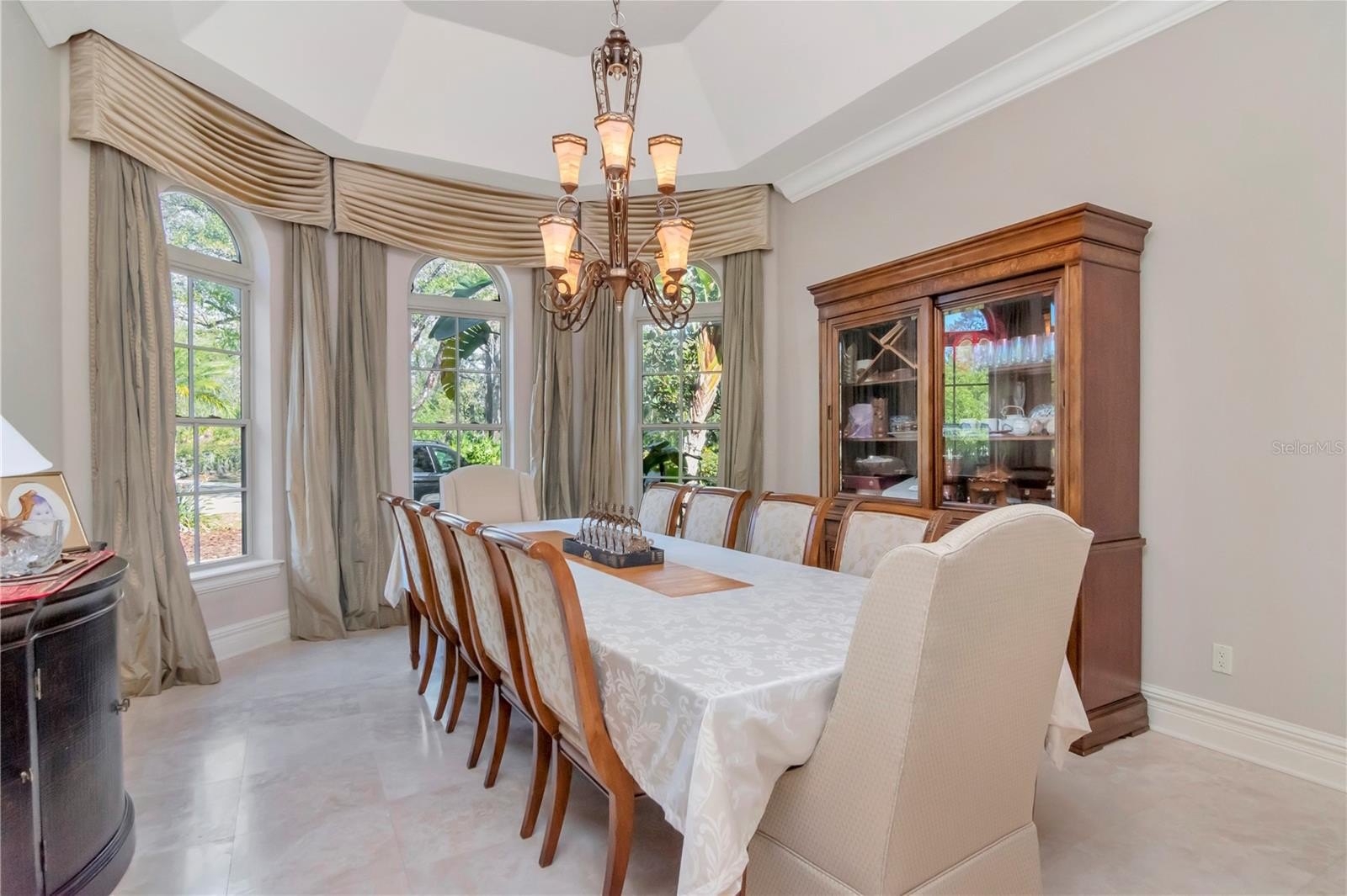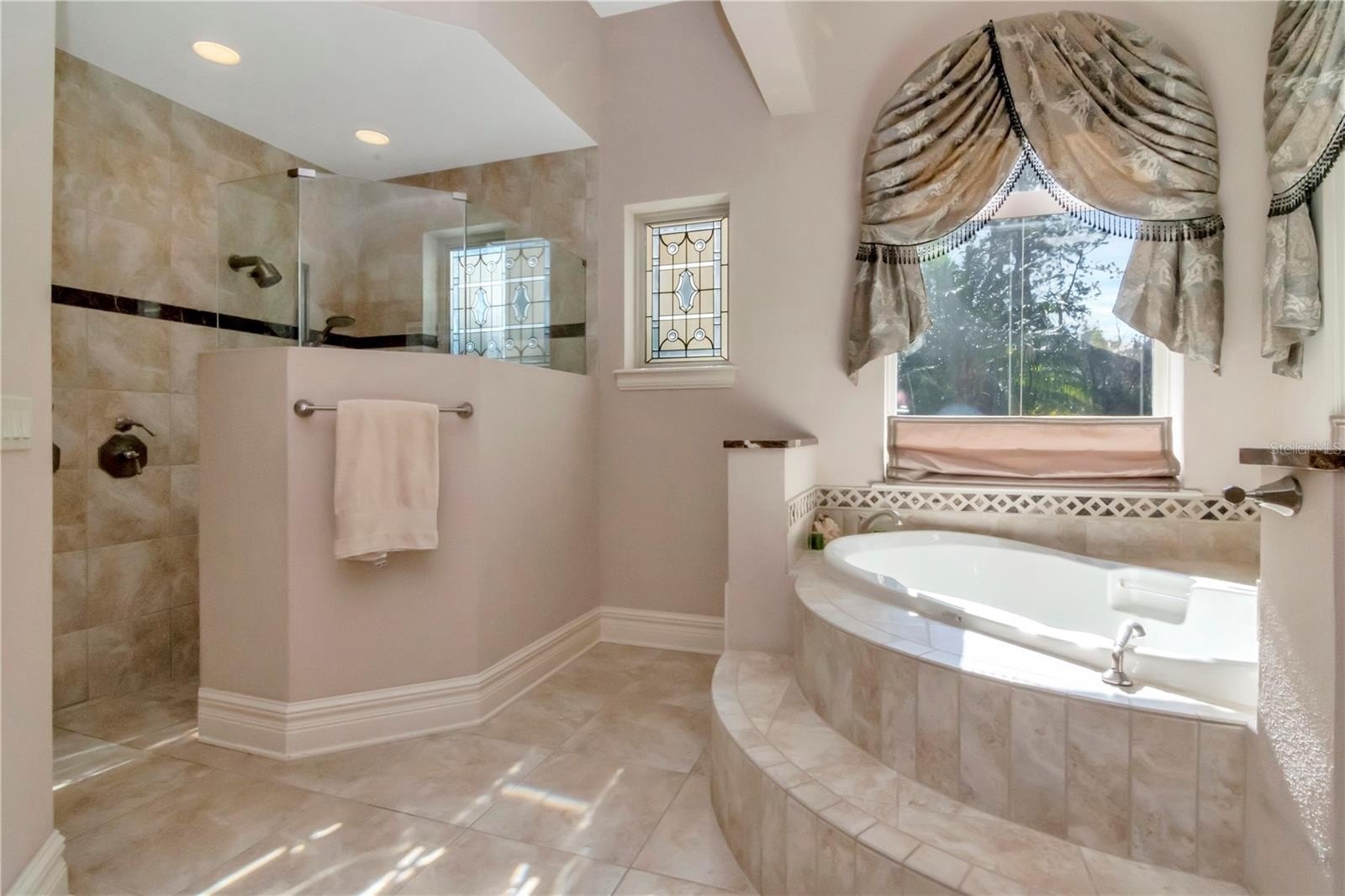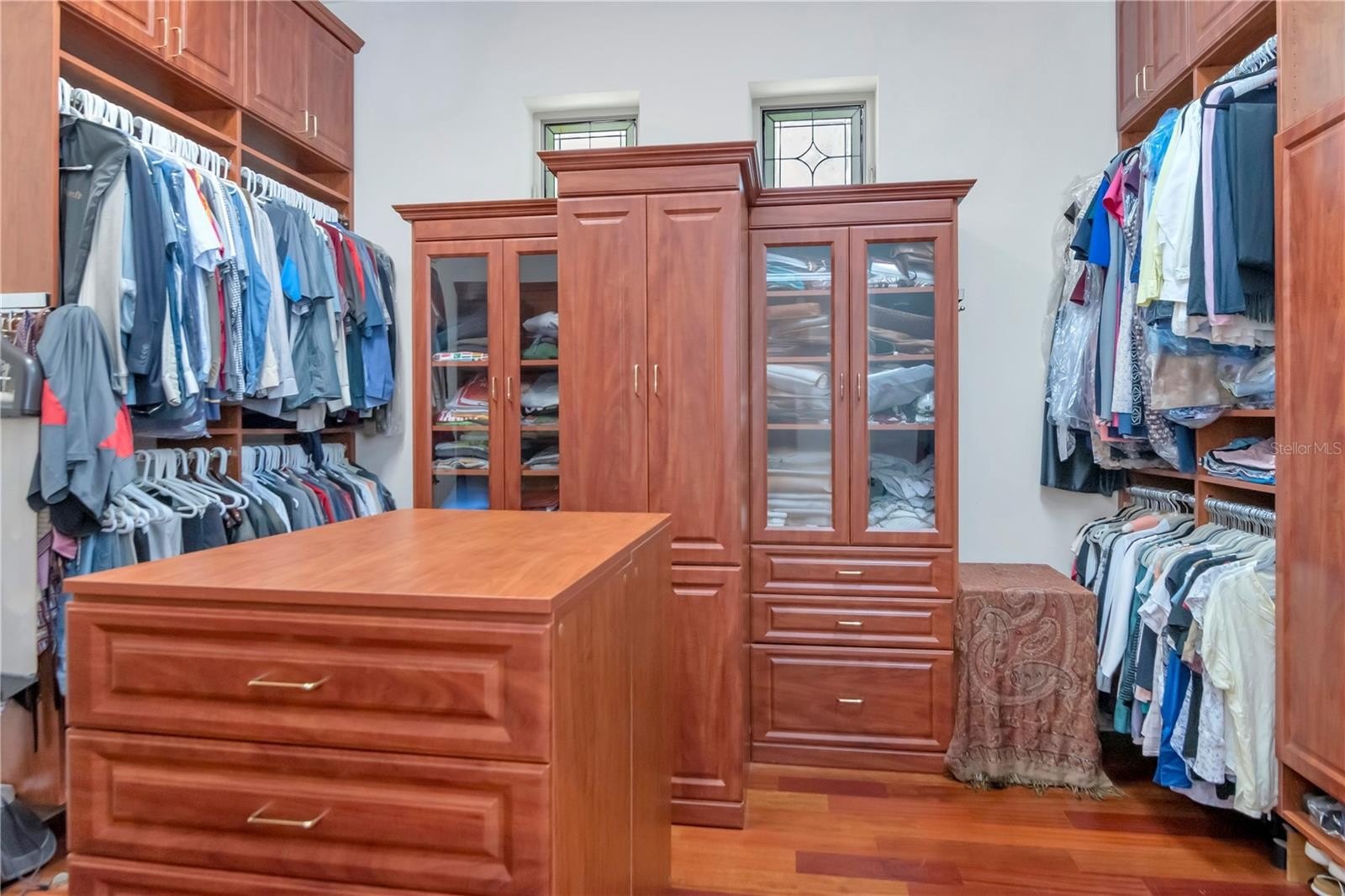 The focus of the open floor plan is the family room with 19-foot ceilings and hardwood floors. The living room features a gas fireplace, 15-foot ceilings and stunning views of the pool and conservation beyond. Both the dining and living rooms have travertine flooring and custom ceiling designs. A dedicated private office provides an ideal work-from-home retreat. The primary suite is a true sanctuary with lanai access, a luxurious spa-style bath featuring dual granite vanities, custom cabinetry with crown detail, soaking tub, and walk-in shower with dual shower heads. The custom walk-in closet includes built-in dressers and shoe storage. All closets throughout the home are custom designed, and secondary bedrooms are oversized, featuring hardwood floors and bathrooms with granite countertops and undermount sinks. Two of the bedrooms share a Jack n’ Jill bath while the other two secondaries have en suite bathrooms.