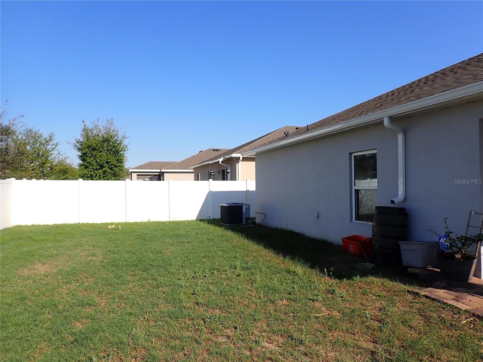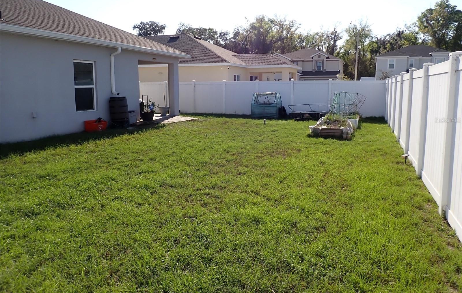 Continuing in the home opens into a spacious kitchen and living area designed for both everyday living and effortless entertaining. The kitchen features GE stainless steel appliances, solid-surface countertops, an eat-at bar, and a generous double-door pantry. There’s even room to add a breakfast table if you like. The living room flows seamlessly to the covered patio, creating a comfortable indoor-outdoor connection. Outside, you’ll find raised garden beds, sprinklers, and a fully fenced yard—perfect for gardening, pets, or simply relaxing.