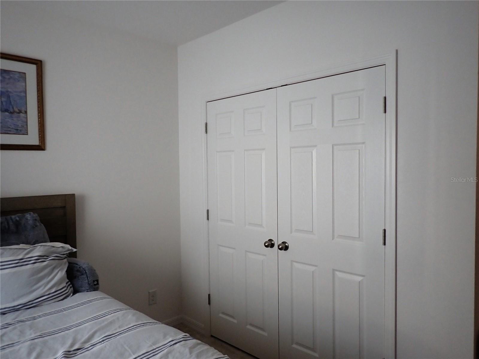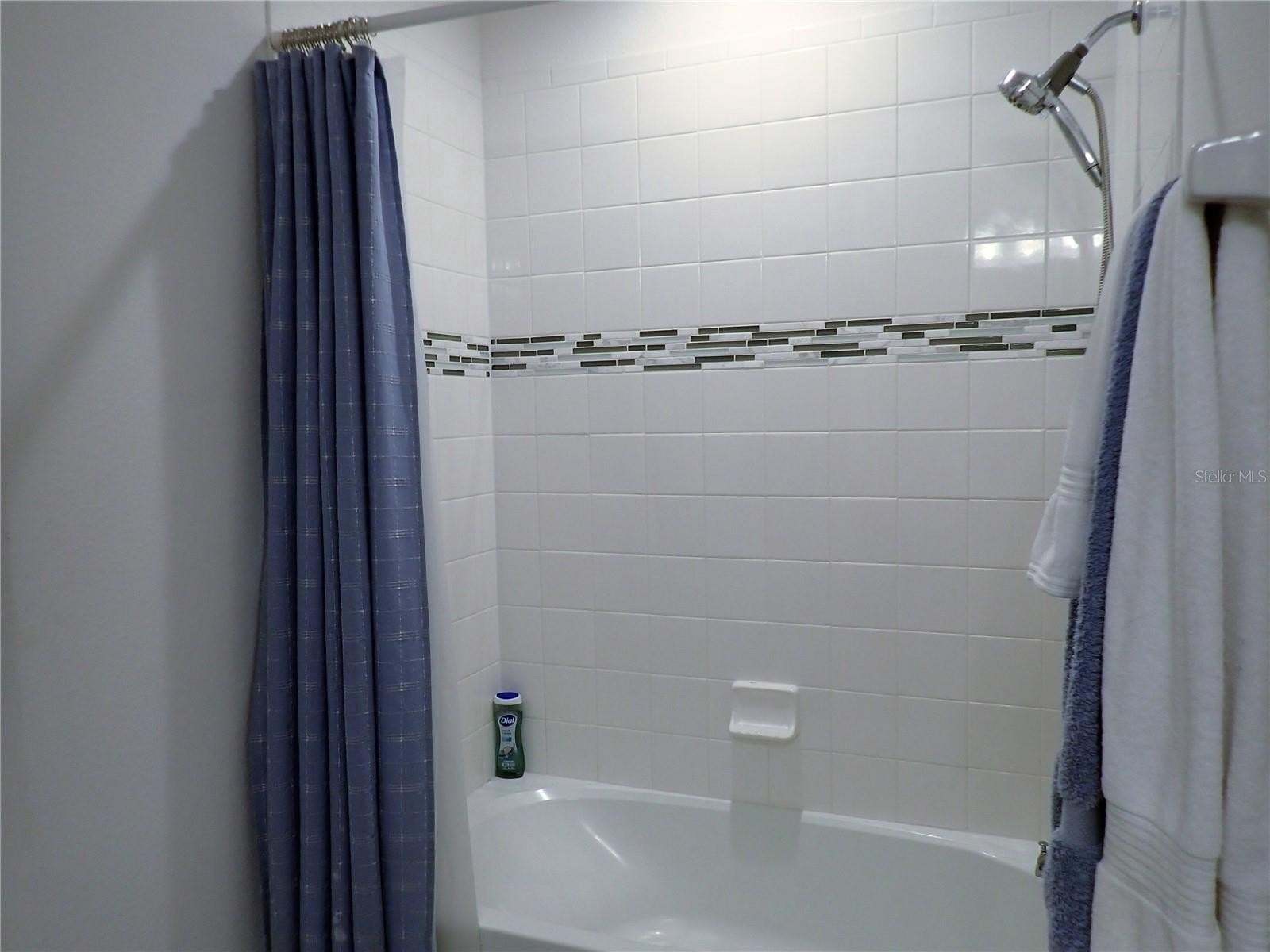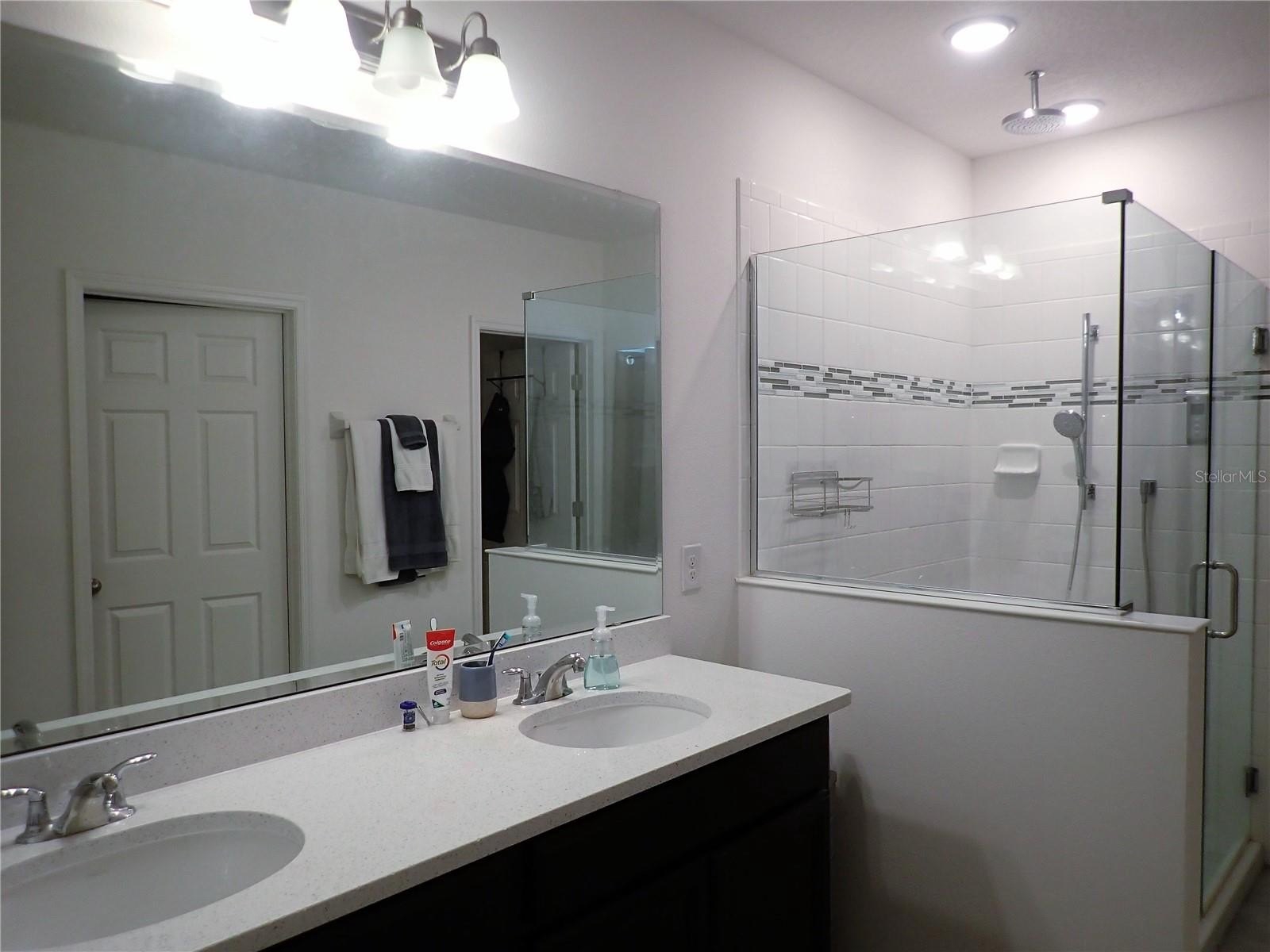 The primary suite is privately tucked at the back of the home and offers a peaceful retreat. It includes a large walk-in closet with organizer system, a private water closet, double vanity, and a spacious shower with a rain head and LED temperature control for a spa-like experience. Bedrooms two and three are generously sized with great closet space and share a large, bright bathroom featuring a double vanity and shower/tub combo.