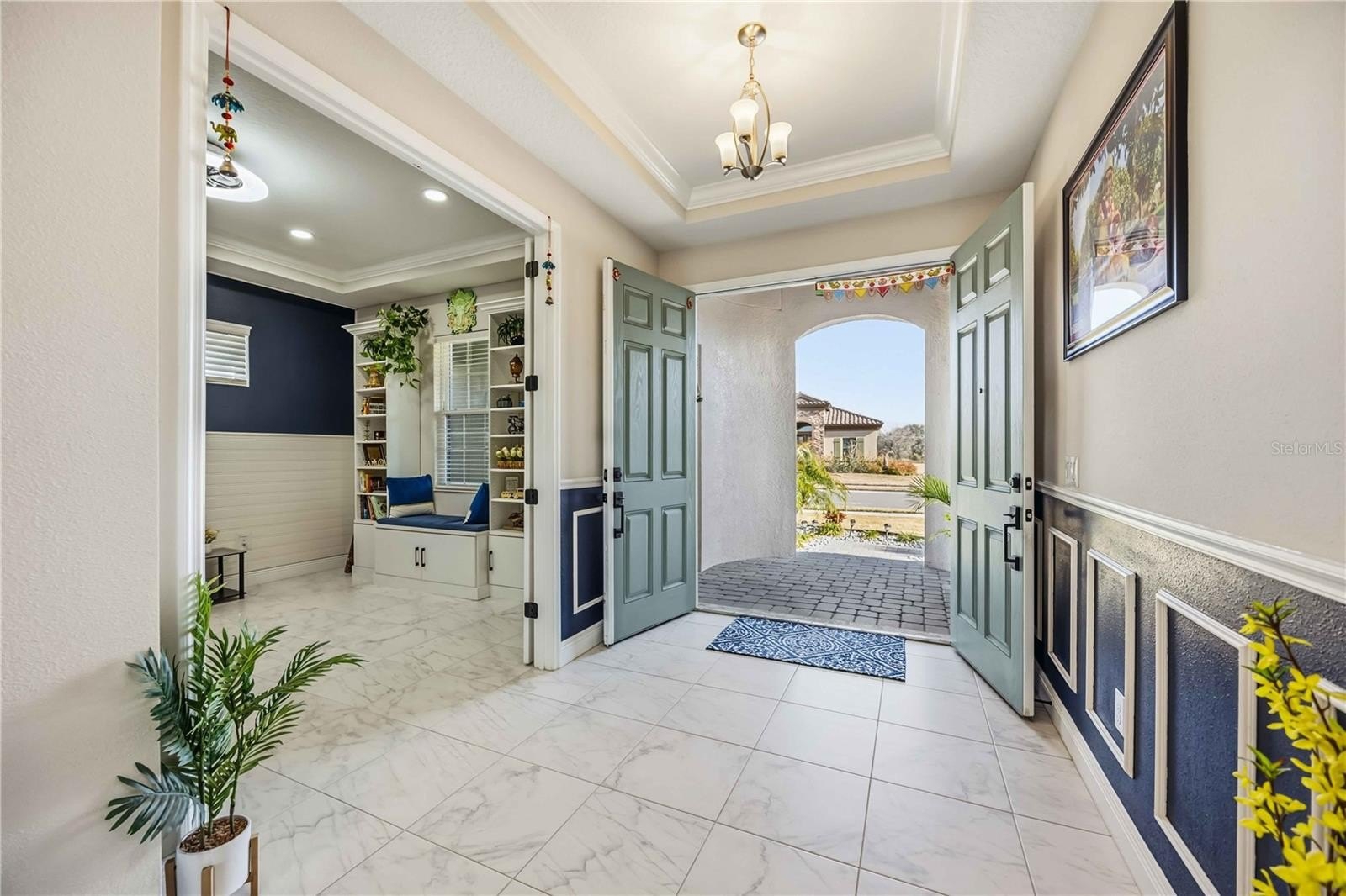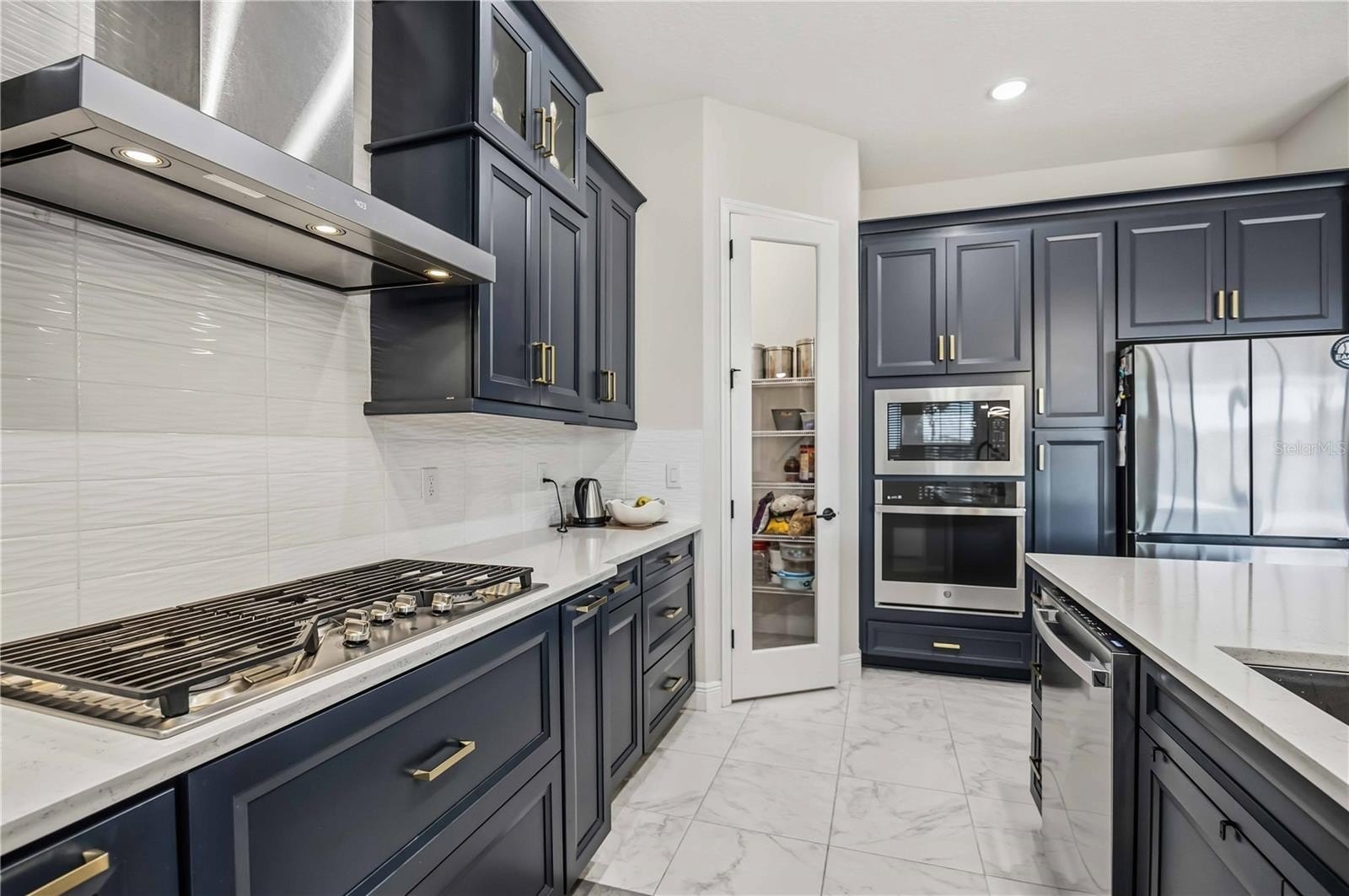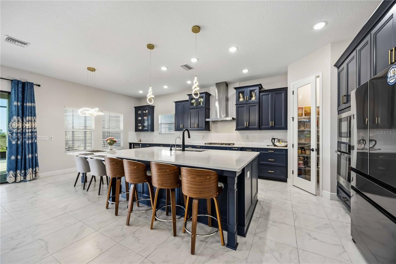 Step inside through the double door entry to find a home adorned with the finest finishes & showcasing 10' ceilings. There’s no carpet here—only luxury tile and vinyl plank flooring throughout. The gourmet kitchen is a chef's dream, complete with the extended, upgraded island, additional wall cabinets with a wine refrigerator, and top-of-the-line stainless GE Profile appliances. Cook with ease on the gas cooktop under a vented hood, wall unit oven, & microwave while a glass door walk-in pantry ensures ample storage. Stylish high-level quartz counters and bar seating provides space for entertaining.