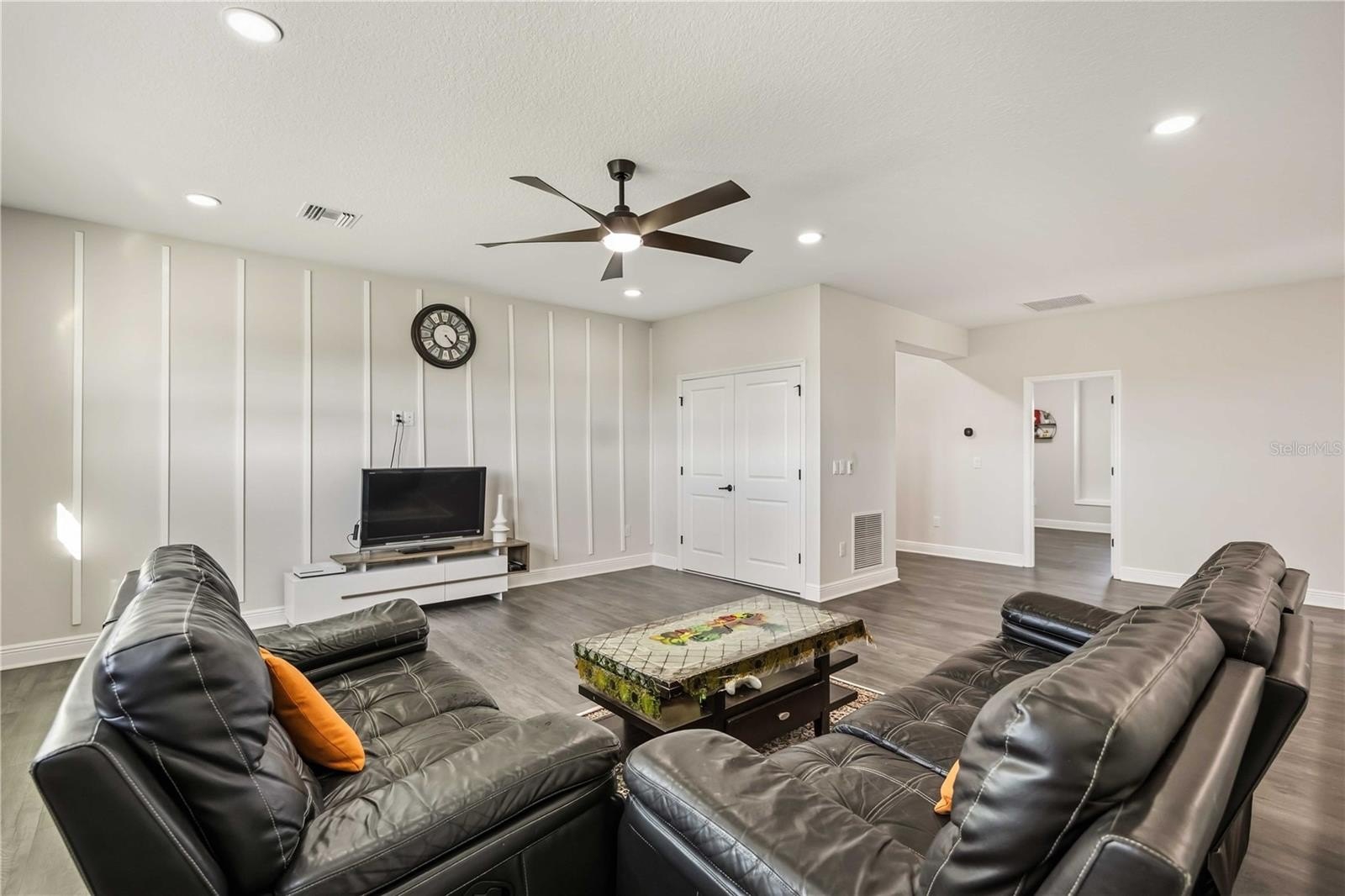 The open-concept great room flows seamlessly to an expansive lanai through an 18-foot sliding glass door, perfect for entertaining or enjoying serene views of the conservation preserve with no neighbors behind. An outdoor kitchen and newly added 40' x 20' lanai extension make it ideal for gatherings or family playtime in a secure environment.