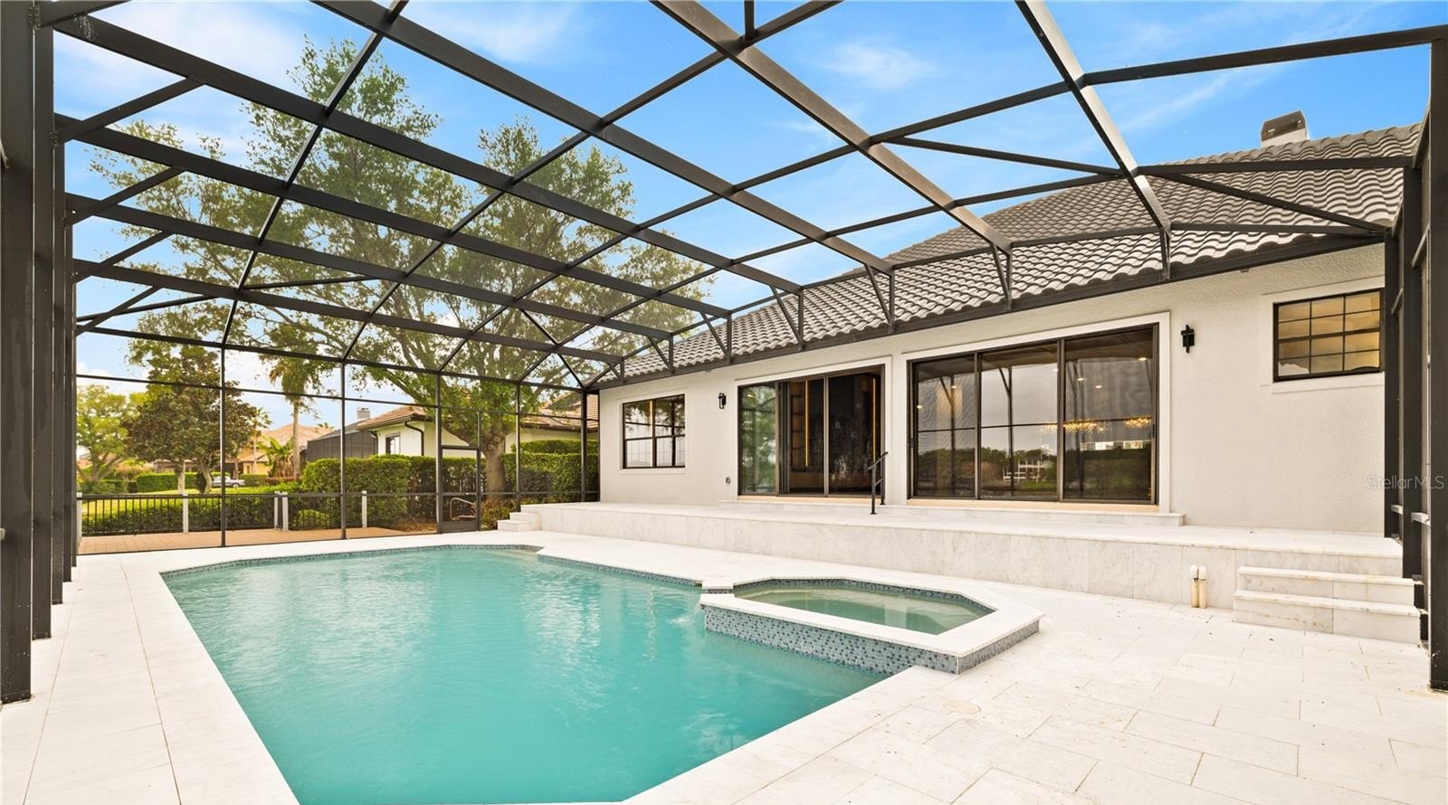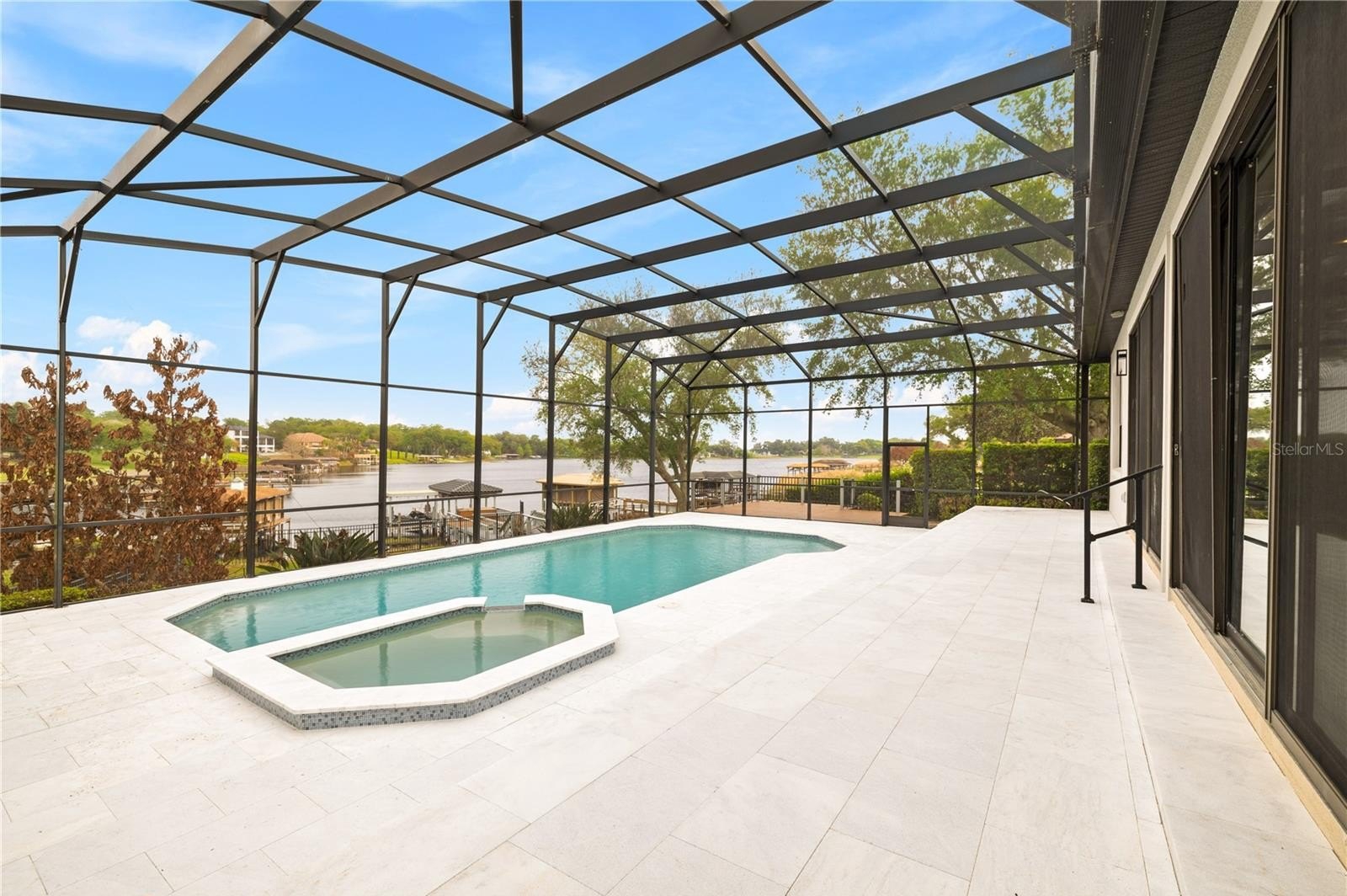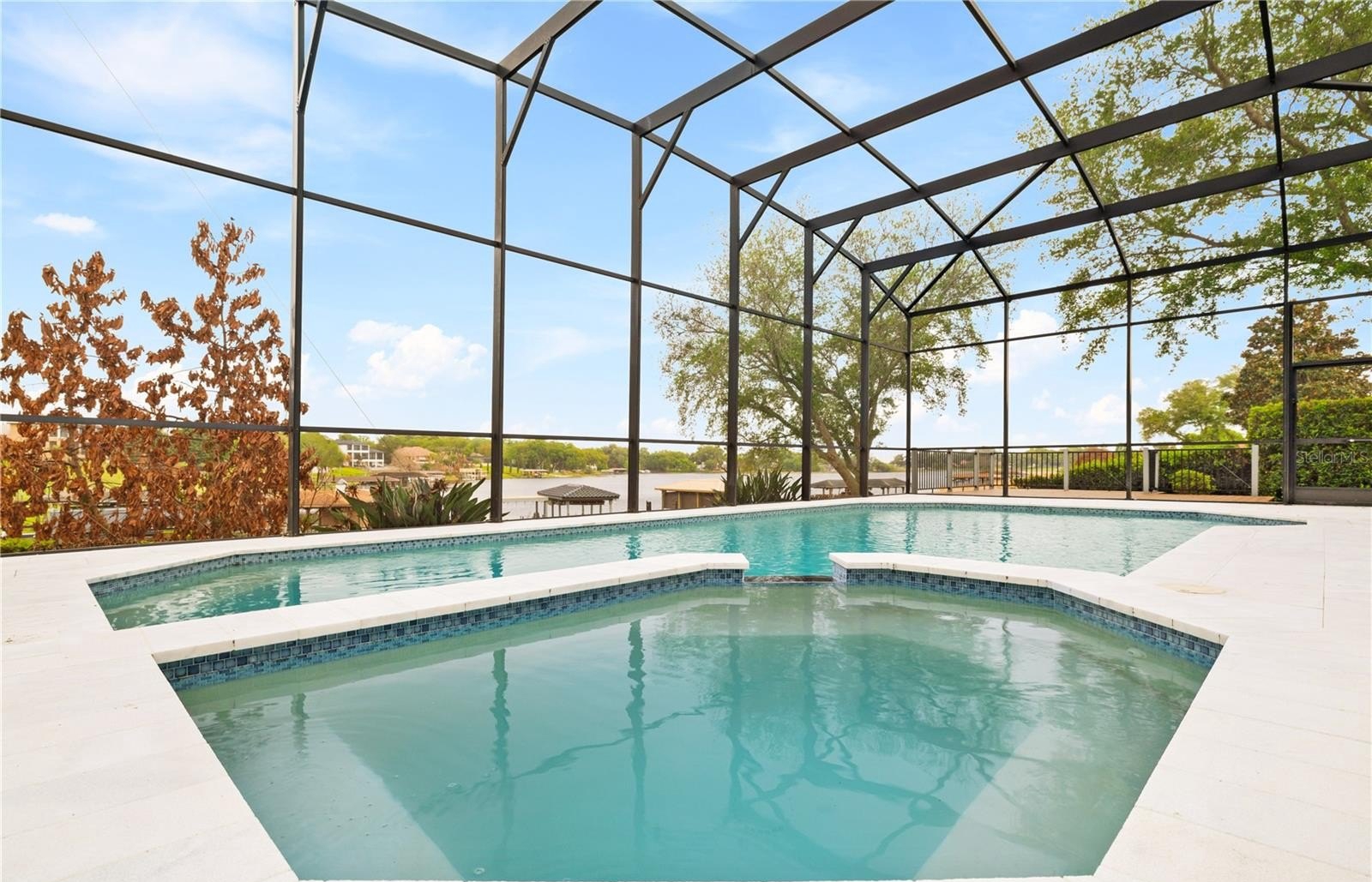 The primary suite offers a private retreat with abundant natural light, custom closets, and a spa-inspired bath featuring a freestanding soaking tub and luxury walk-in shower. Step outside to a screened pool, upgraded travertine deck, and private pier, creating an unparalleled waterfront lifestyle ideal for relaxation and entertaining.