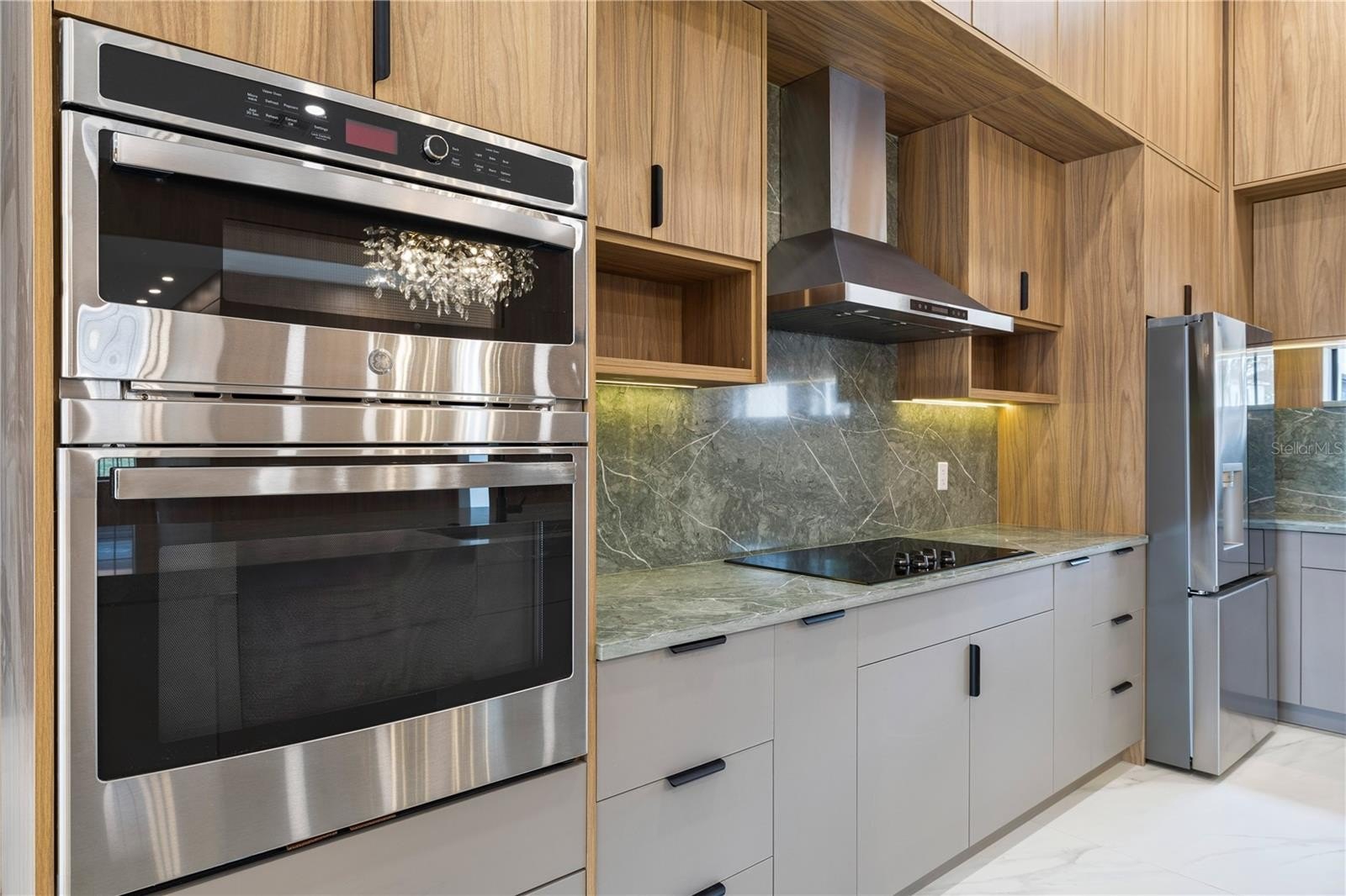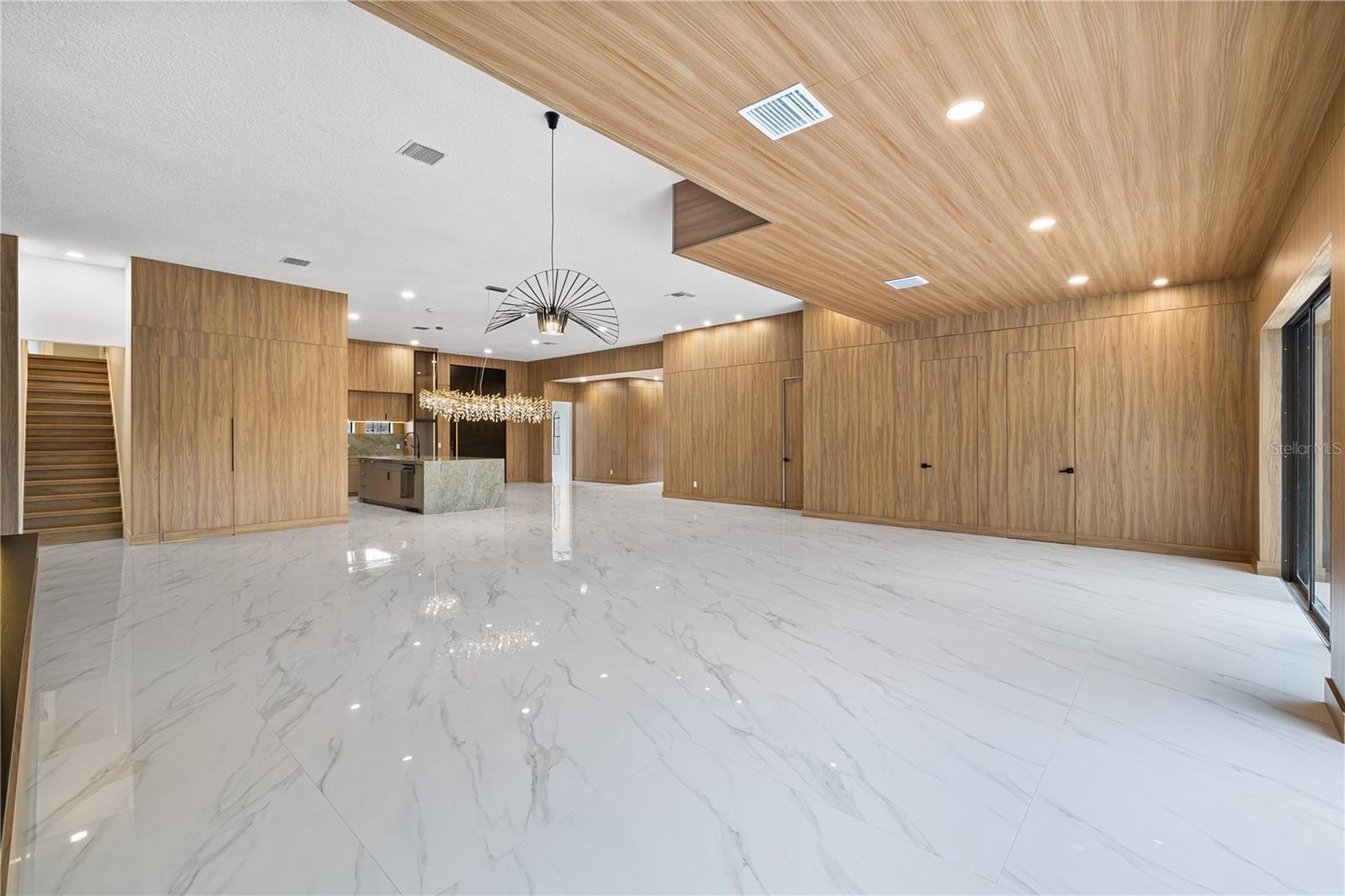 Designed for effortless entertaining, the open-concept layout showcases a chef’s kitchen with a waterfall quartz island, custom cabinetry, premium stainless steel appliances, and a full-slab backsplash, all flowing into an expansive living area with designer lighting and seamless indoor-outdoor access.