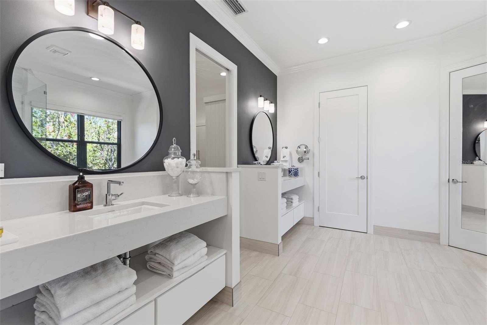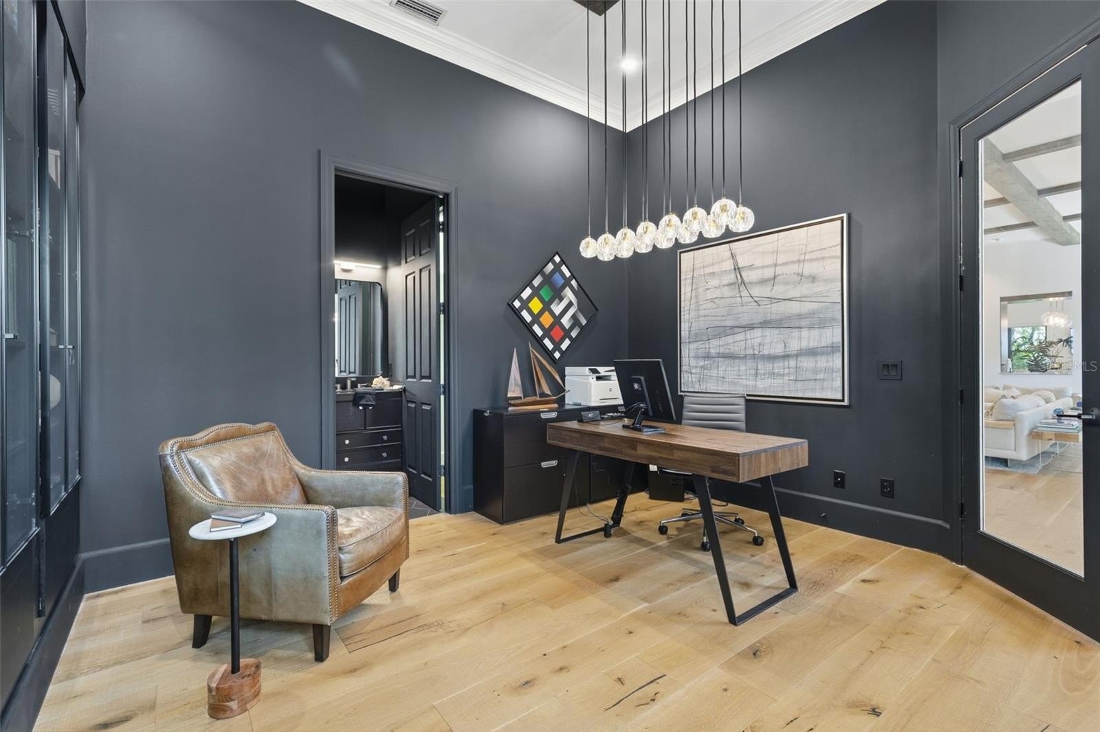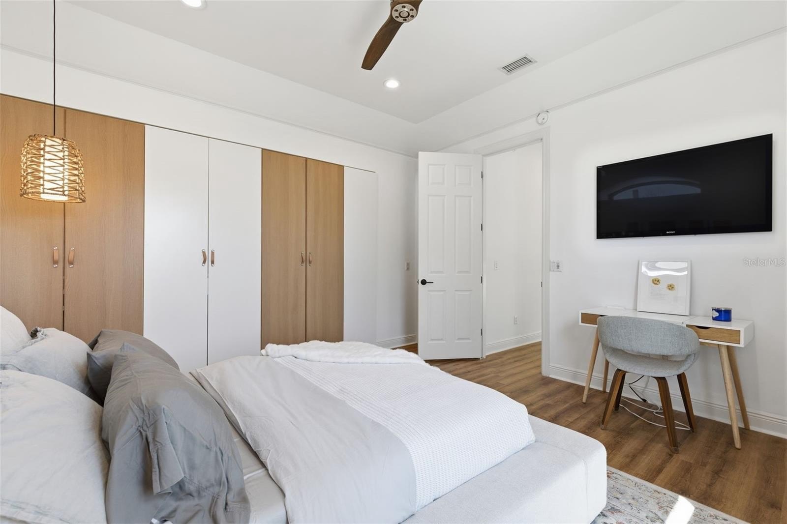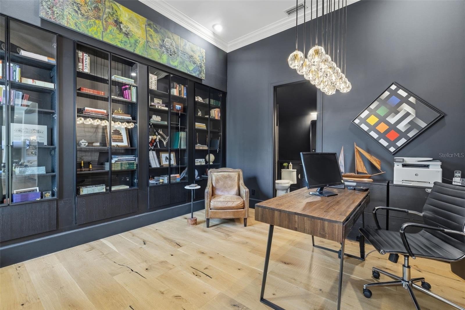 The guest room is located on the first floor and is currently used as an office. It displays built-ins, ensuite bath and walking closet, offering both comfort and flexibility.
