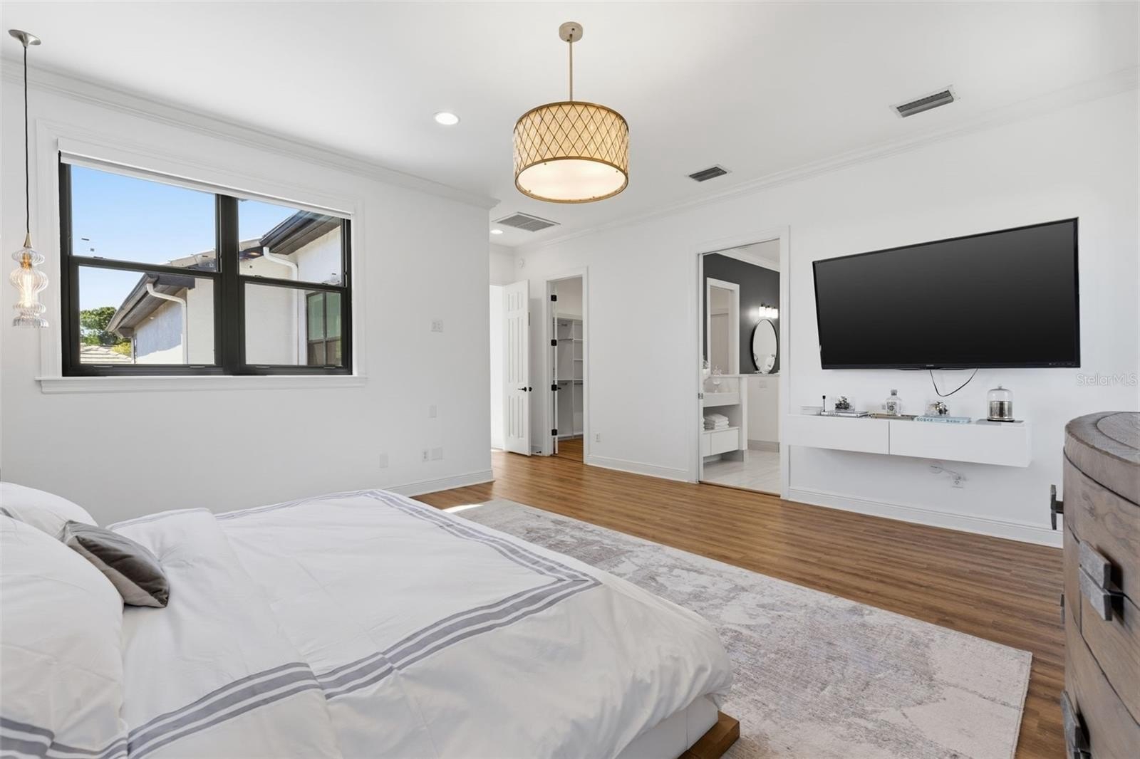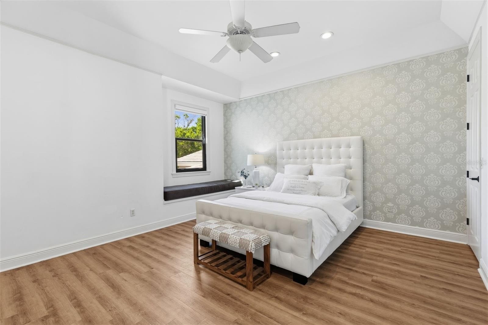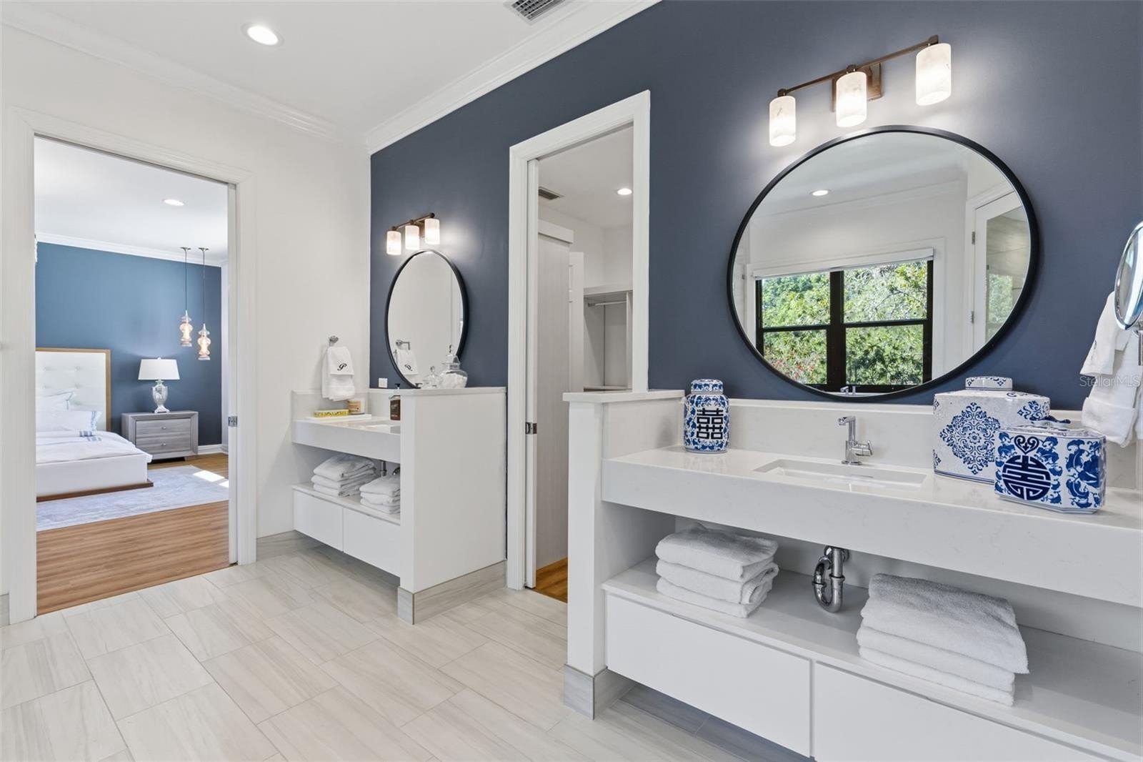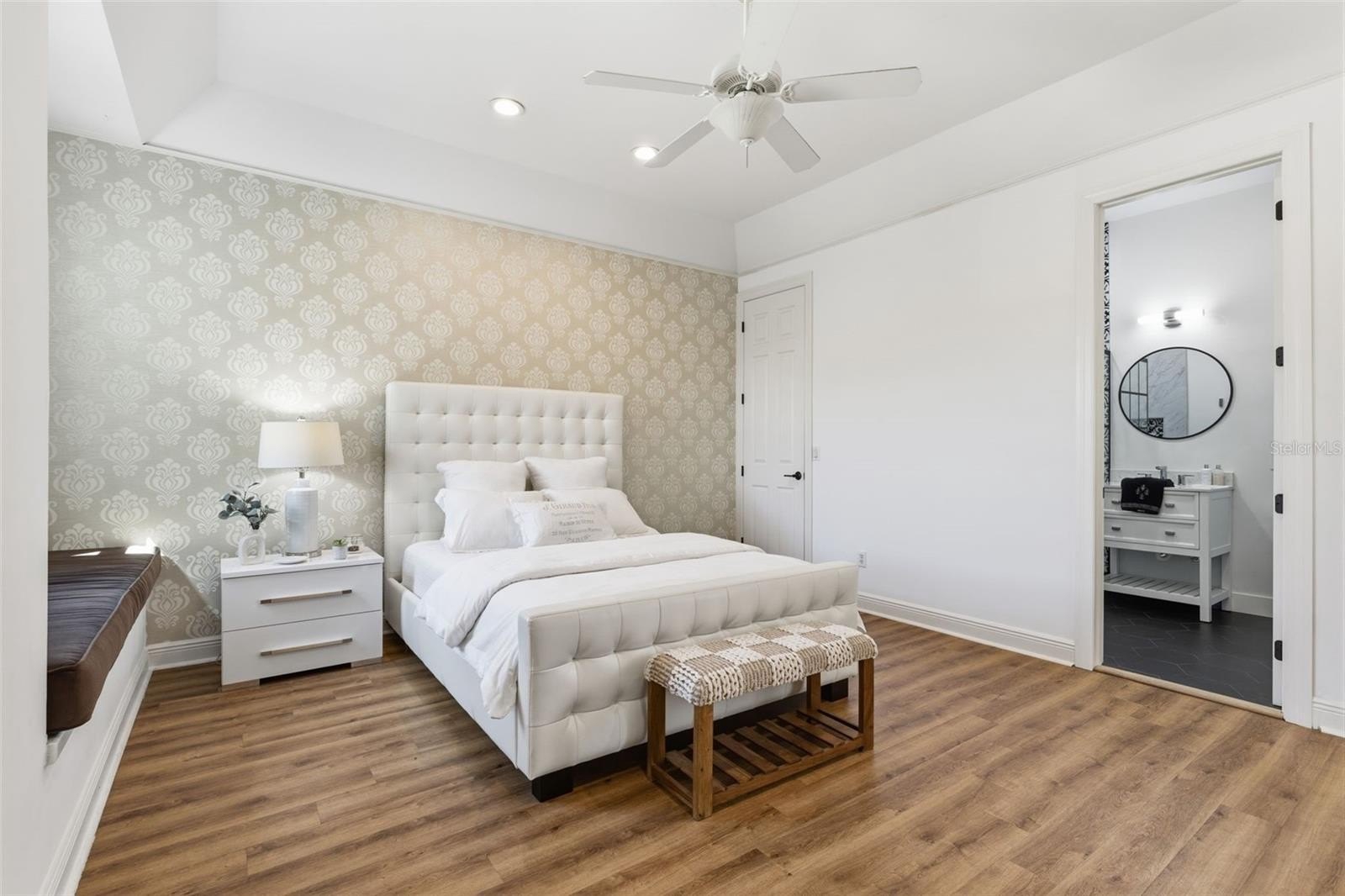 The guest room is located on the first floor and is currently used as an office. It displays built-ins, ensuite bath and walking closet, offering both comfort and flexibility.