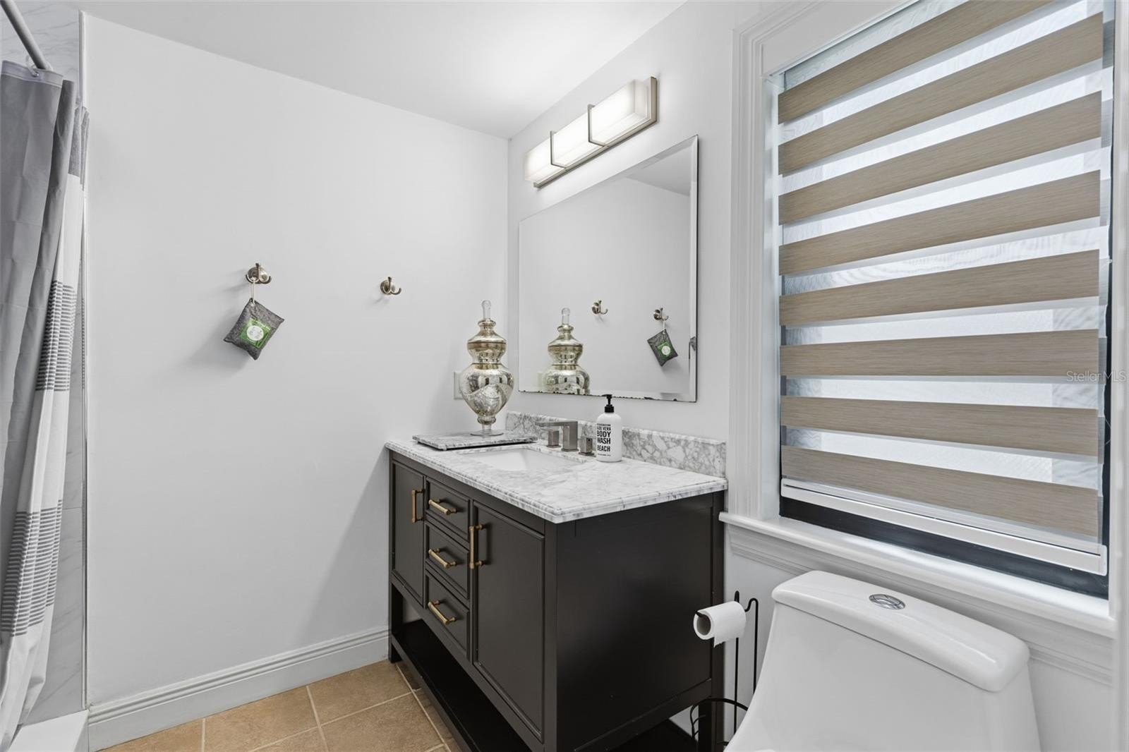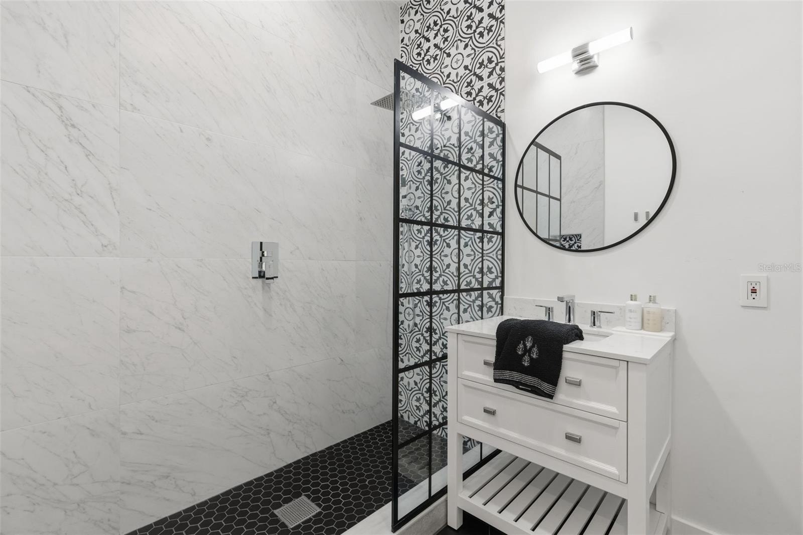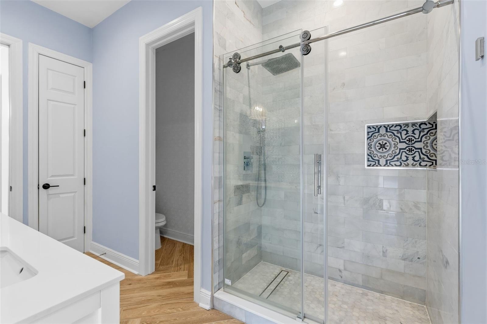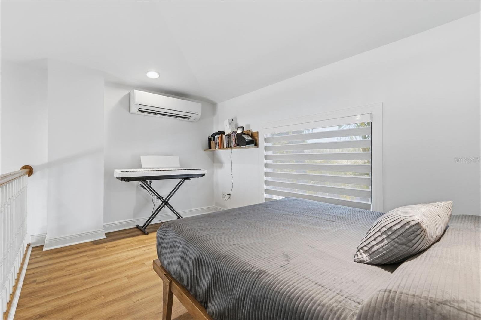 The guest room is located on the first floor and is currently used as an office. It displays built-ins, ensuite bath and walking closet, offering both comfort and flexibility.