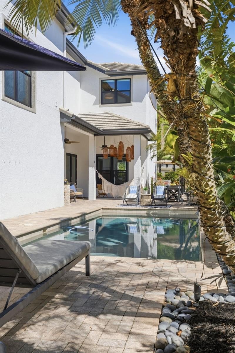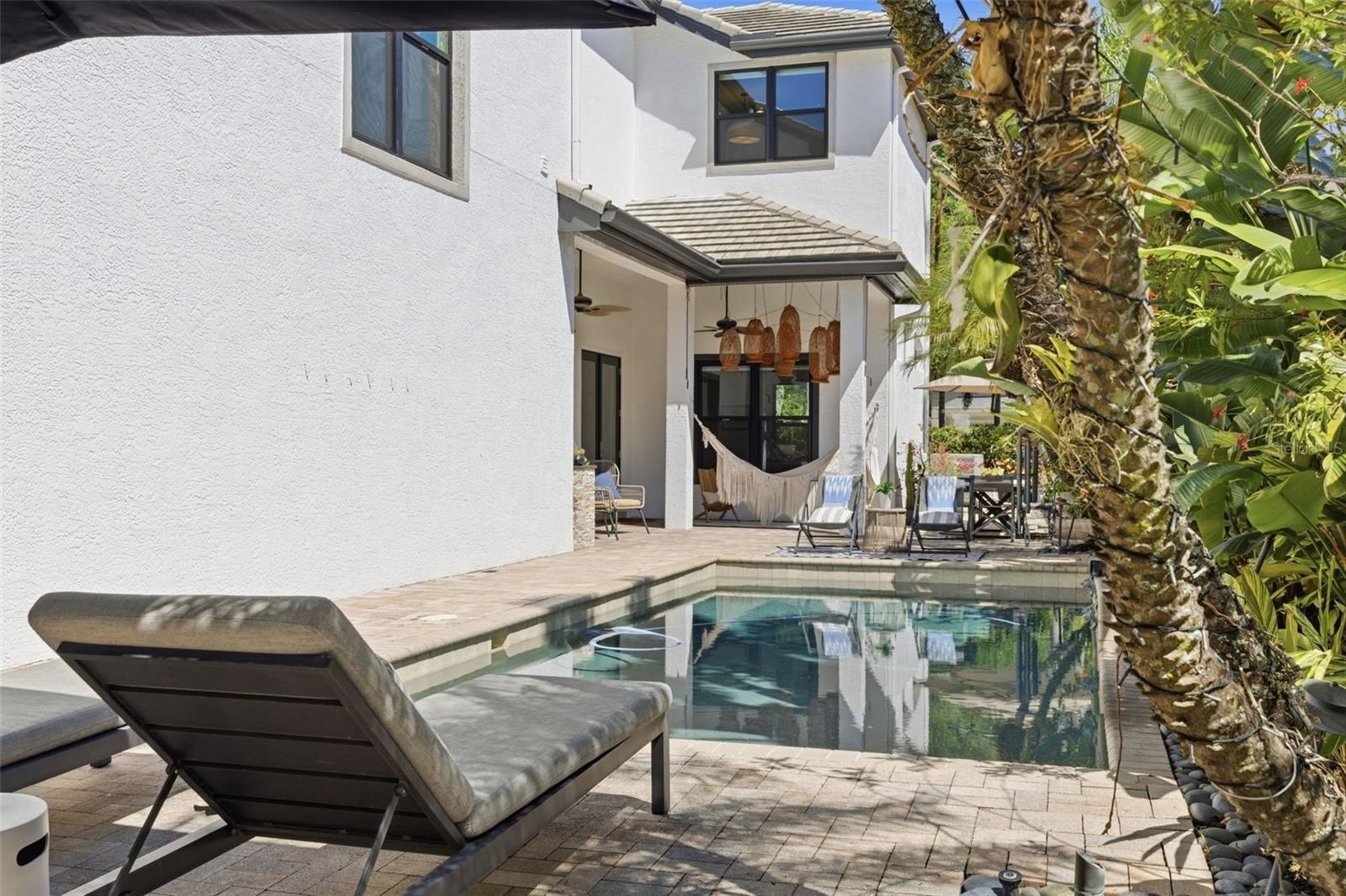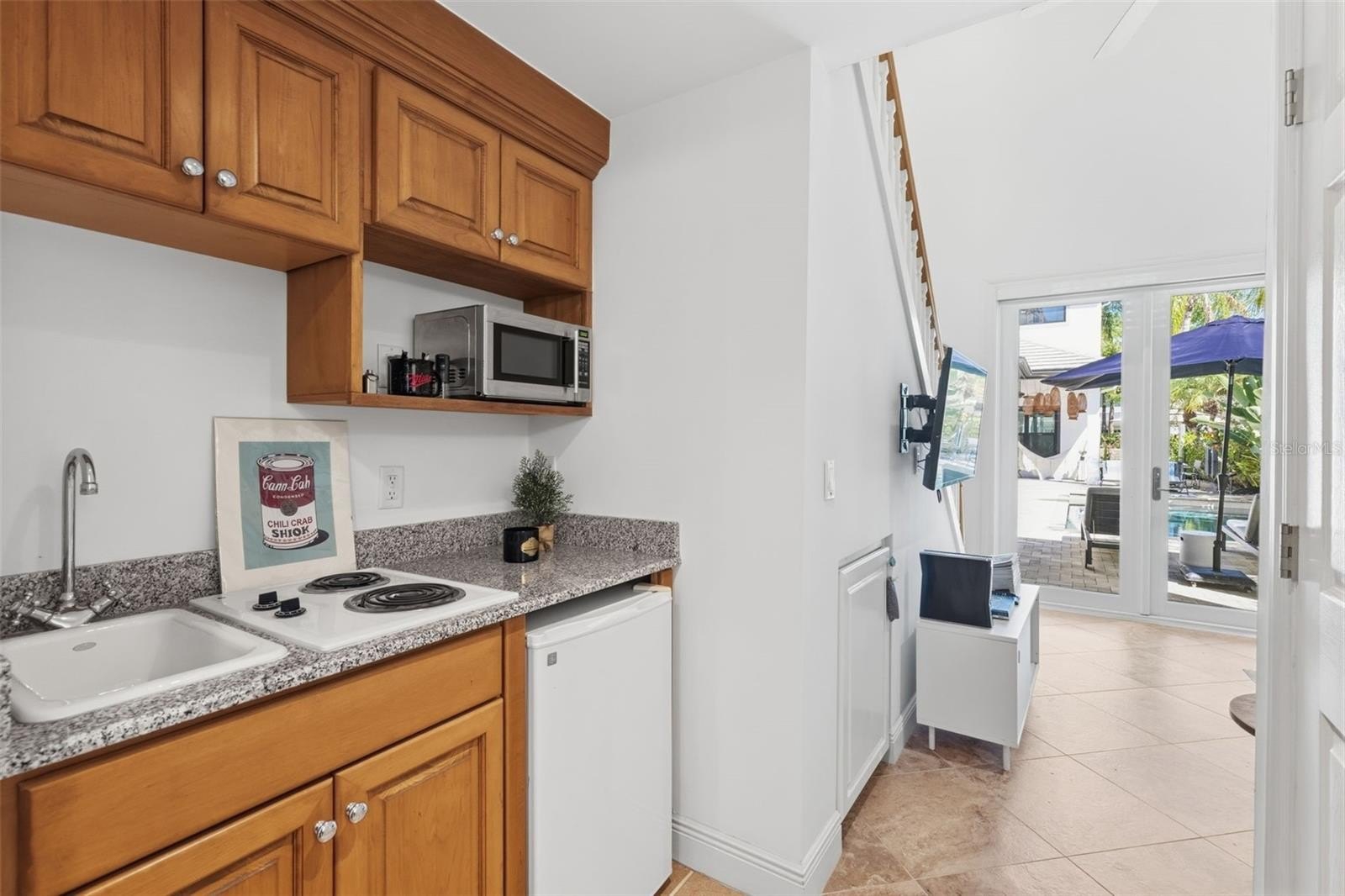 The central courtyard unfolds as a private sanctuary, centered around a saline pool with a paved lanai, and an outdoor grill, ideal for intimate gatherings or quiet repose. The charming casita enhances the property’s versatility, offering a welcoming reception area with travertine flooring, a kitchenette, full bath, two closets, and a loft space adorned with hardwood floors.
