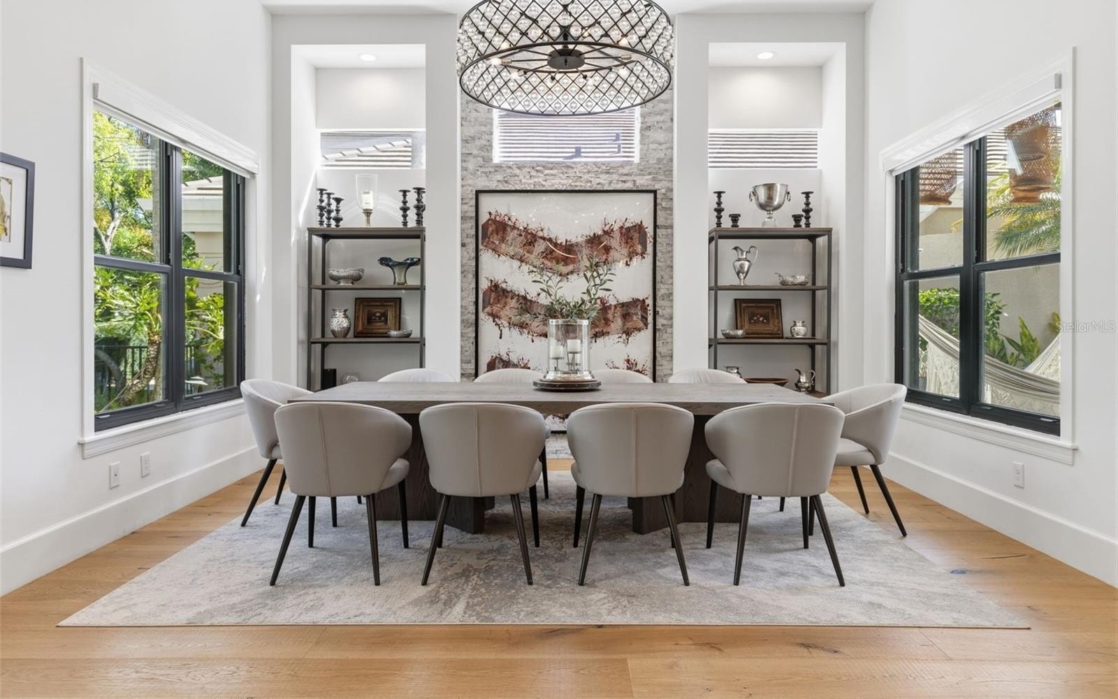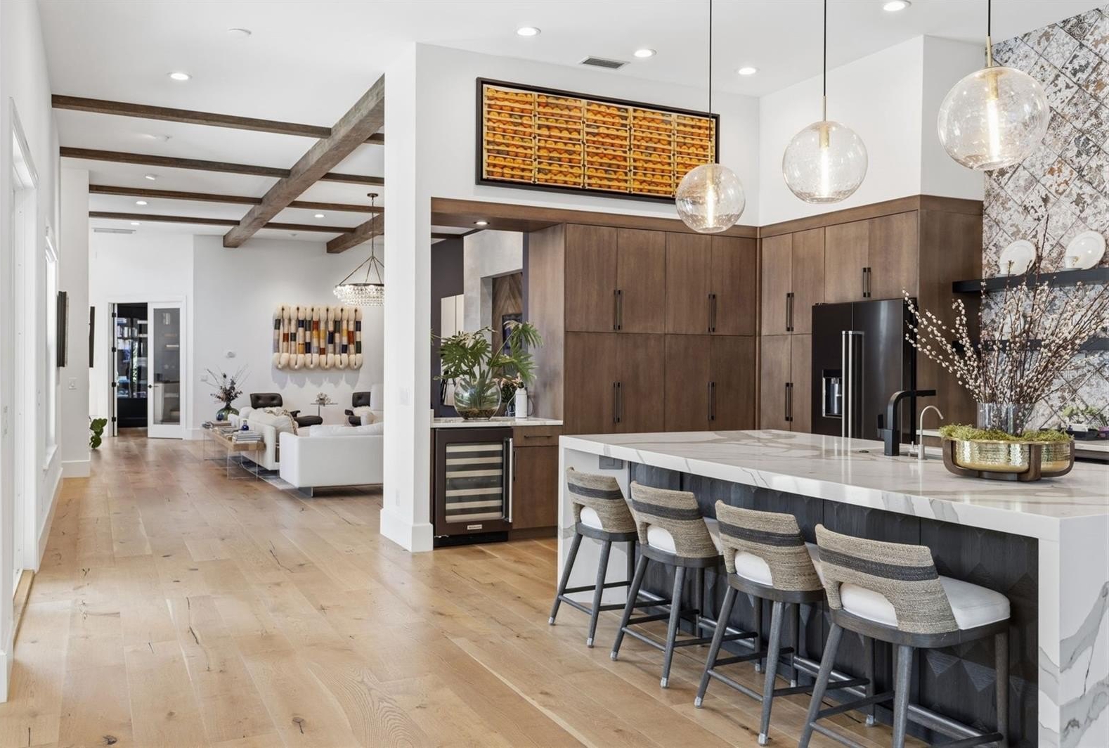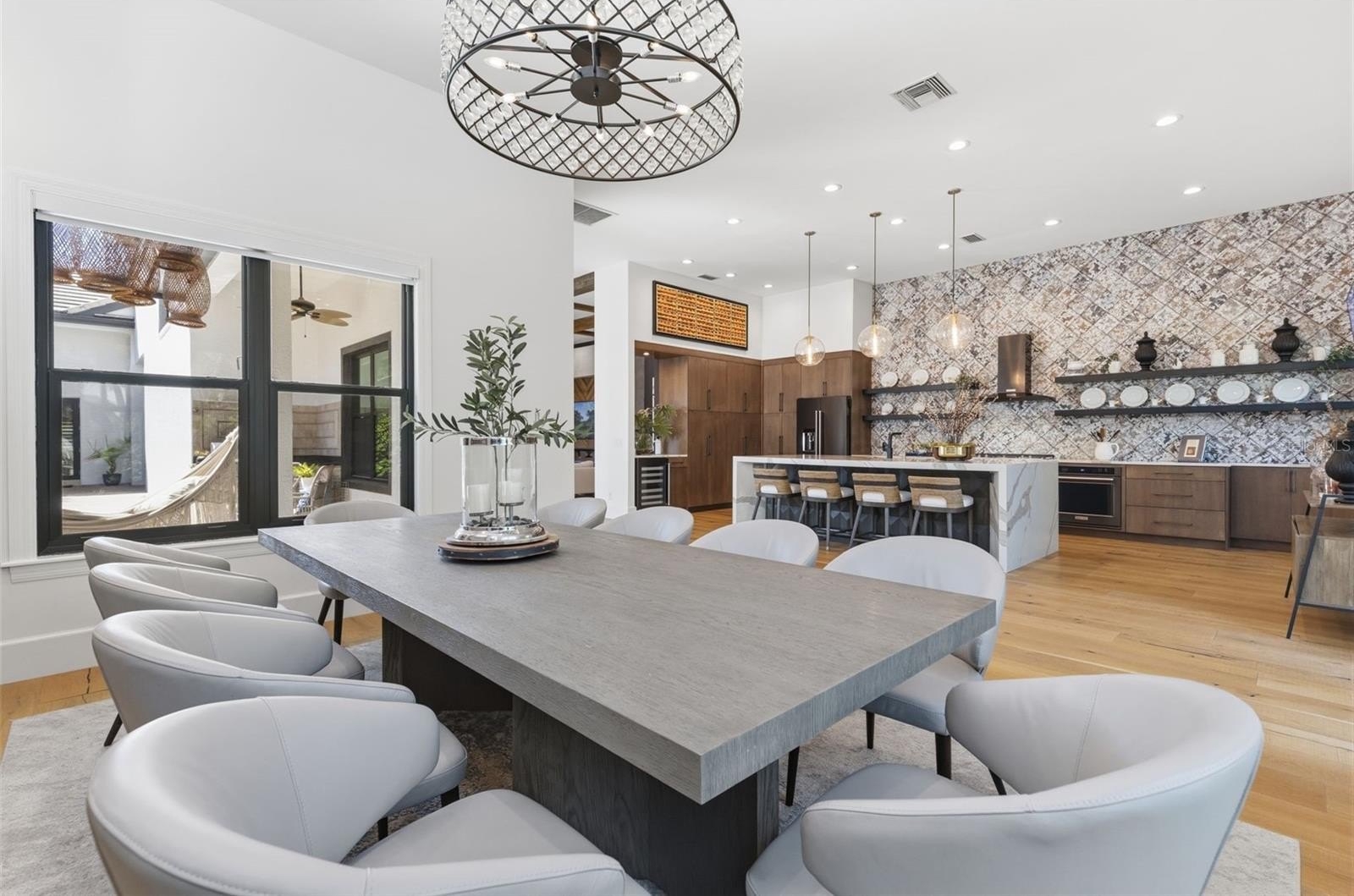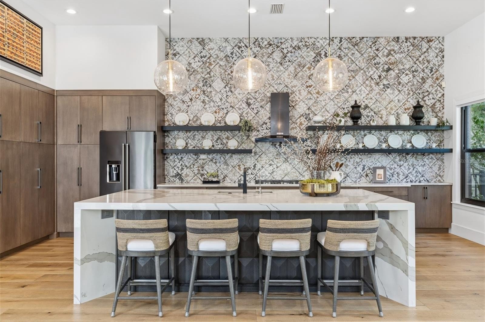 The dining area is both elegant and inviting—spacious on scale, enriched by a stone-accent wall, and bathed in natural light, with seamless access to the outdoor living areas. The gourmet kitchen is a study in both beauty and function, appointed with Levant-designed cabinetry offering intelligent storage solutions, striking quartz waterfall countertops, stainless steel appliances, two ovens, wine cooler, and a refined tile backsplash with floating shelves. From this vantage point, one enjoys tranquil views of the pool and courtyard beyond.