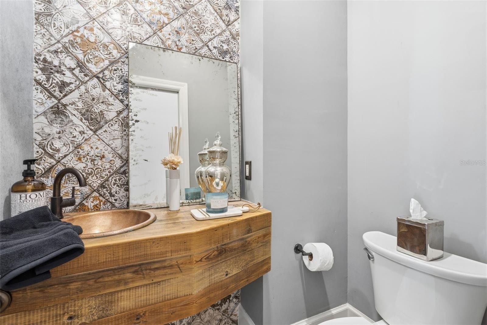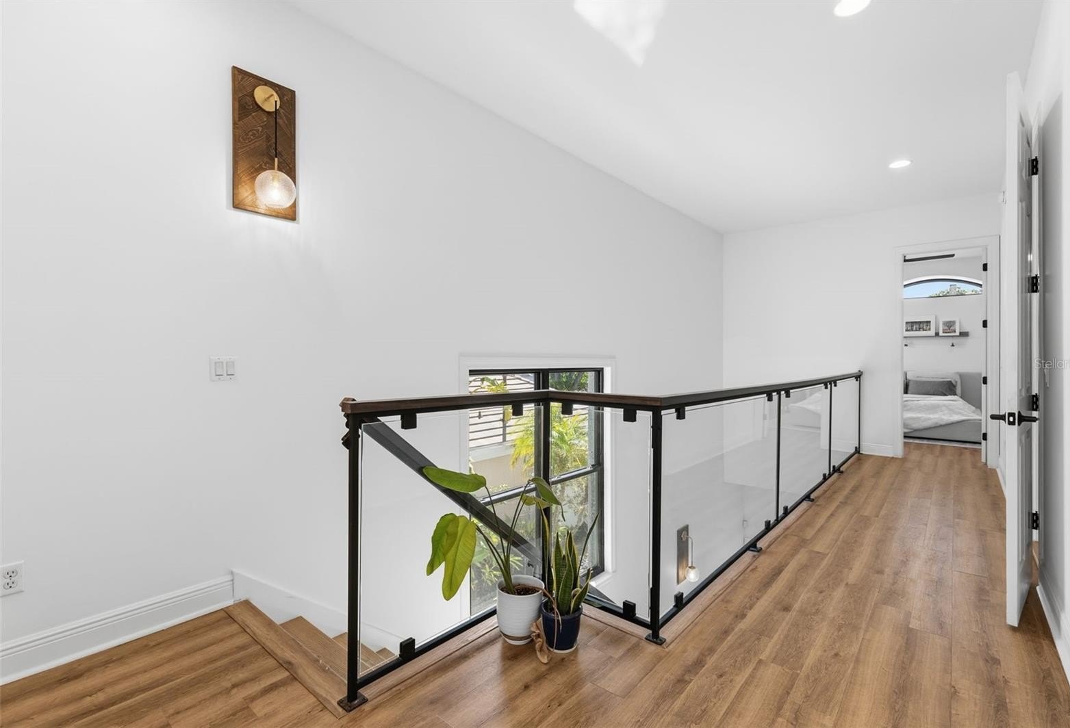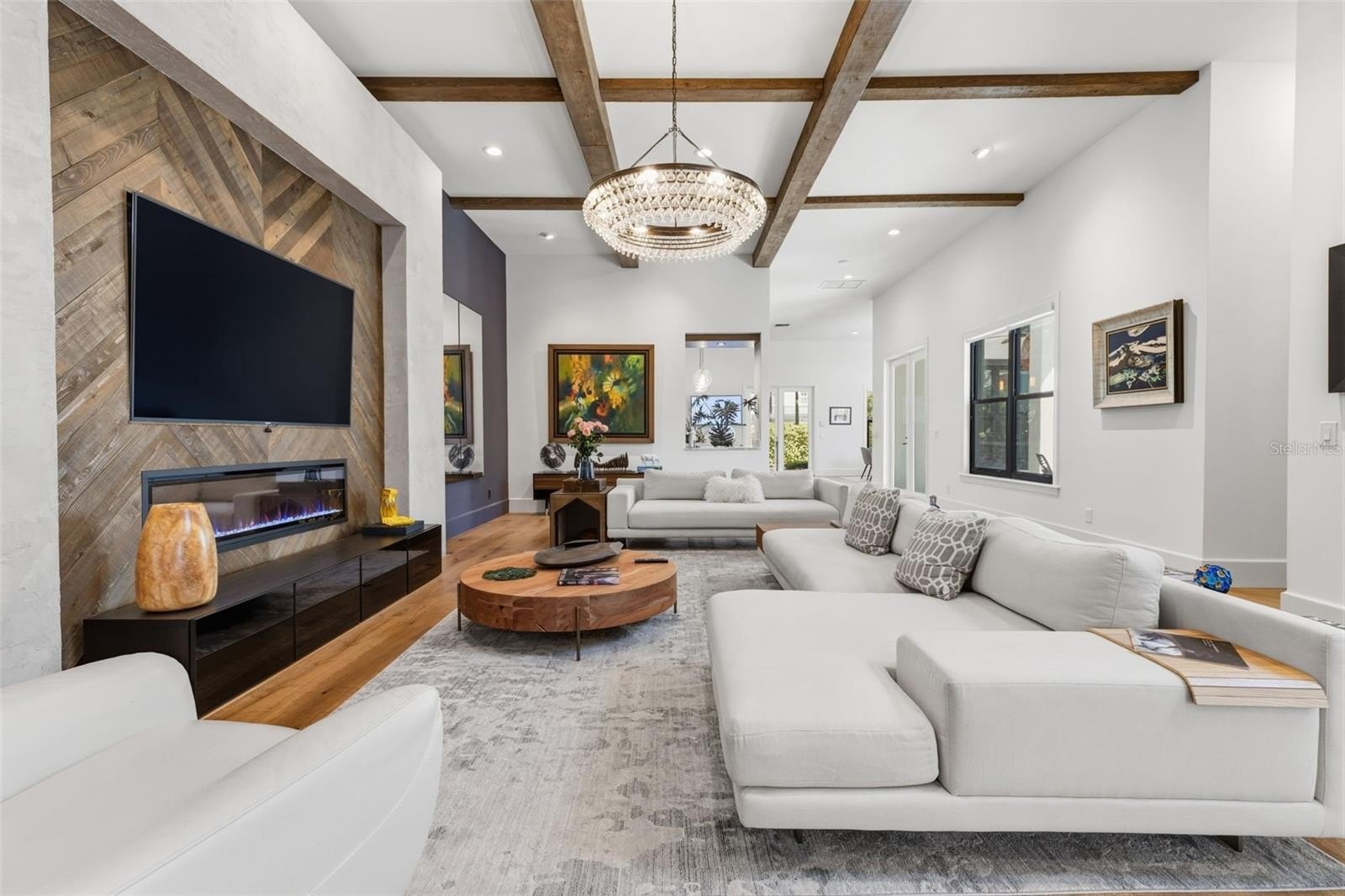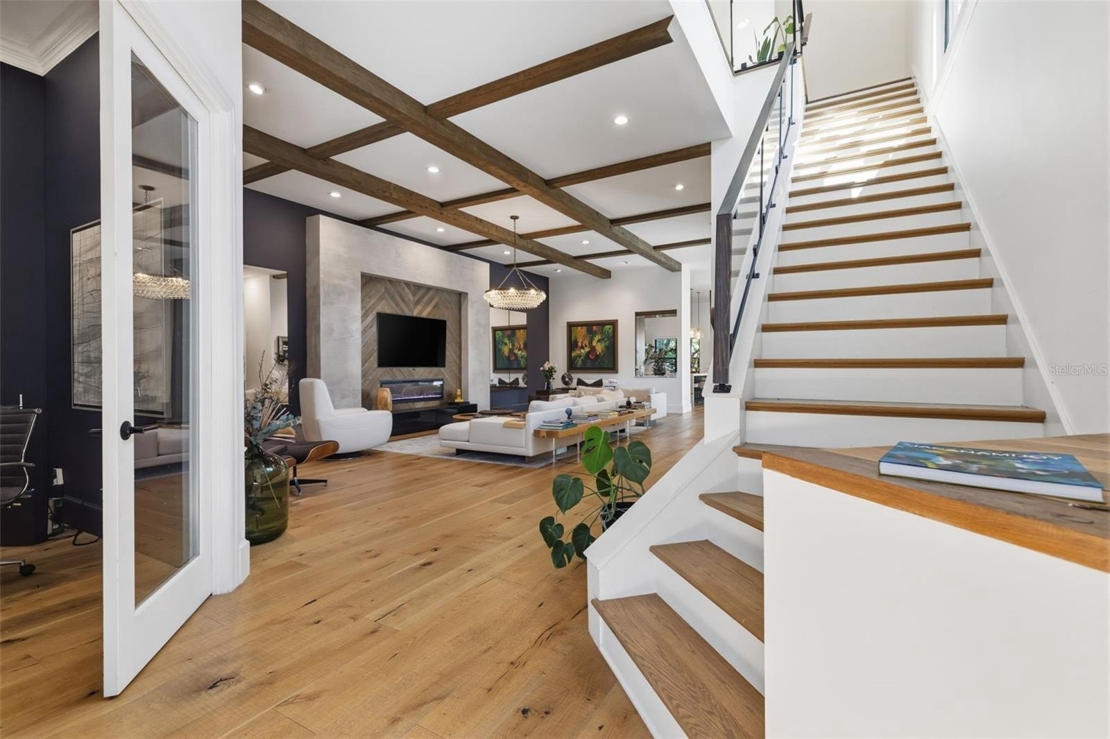 Recently renovated for an elegant, tastefully decorated atmosphere, it boasts soaring 12 ft ceilings throughout the first floor. The living room is finished with wood beams and cozy fireplace on a stone stacked wall, and ample wall space ideal for showcasing art collections. The staircase, appointed with sleek glass panels and oak, incorporates a discreet storage closet and is complemented by a well-positioned powder room.