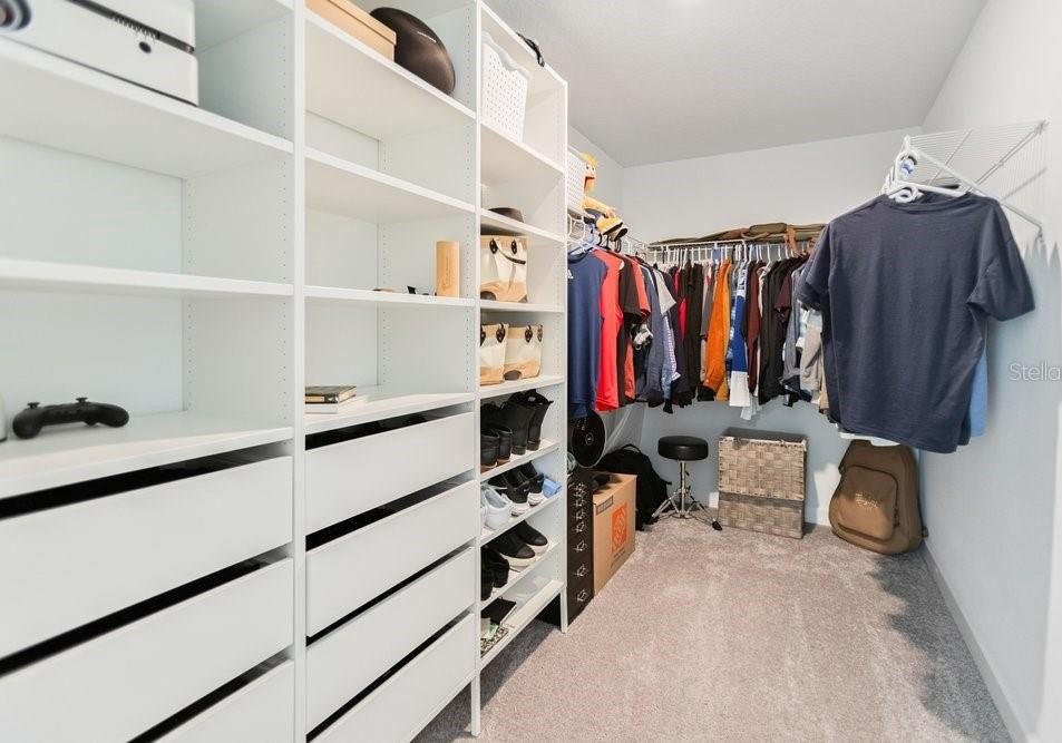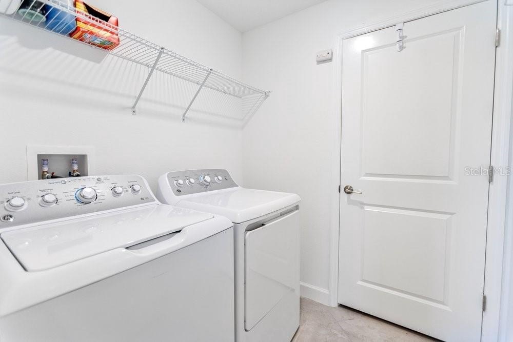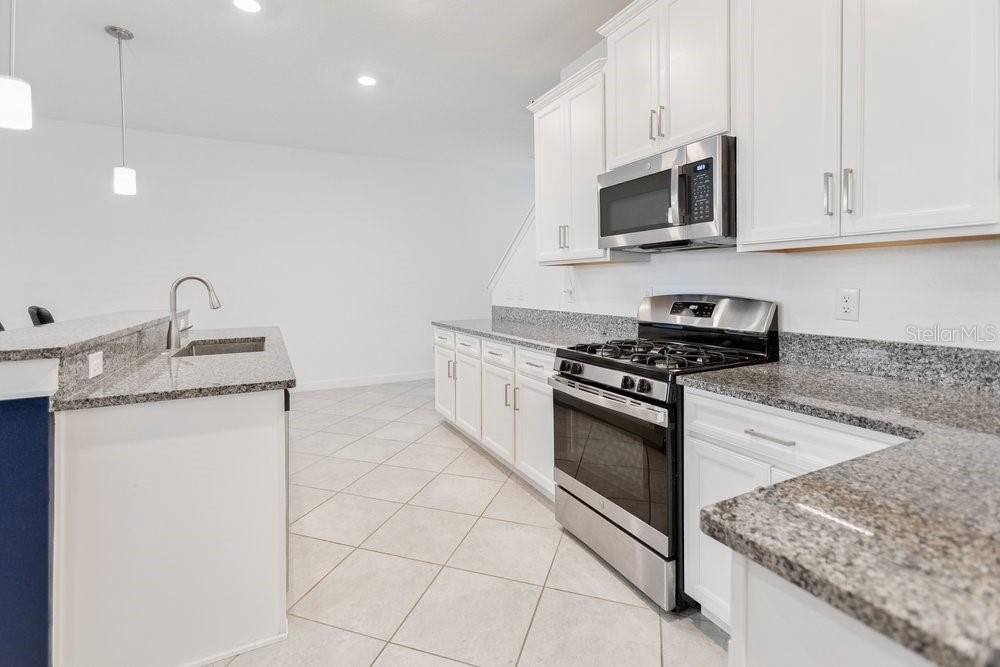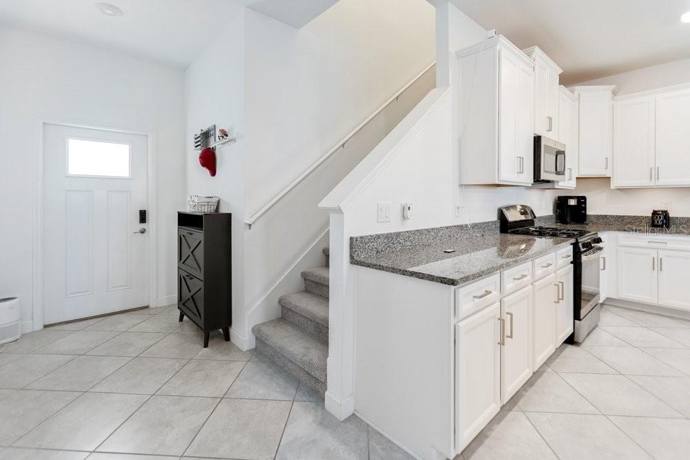 The kitchen is beautifully appointed with white wood cabinetry, crown moldin, rich dark granite countertops, and stainless-steel appliances. Including a new upgraded Samsung Bespoke Refrigerator. The main level also includes a convenient half bathroom, a large pantry closet, and additional under-stairs storage. Step outside to the screened lanai for effortless indoor-outdoor living, and enjoy the two-car garage with built-in shelving, offering excellent organization and storage.