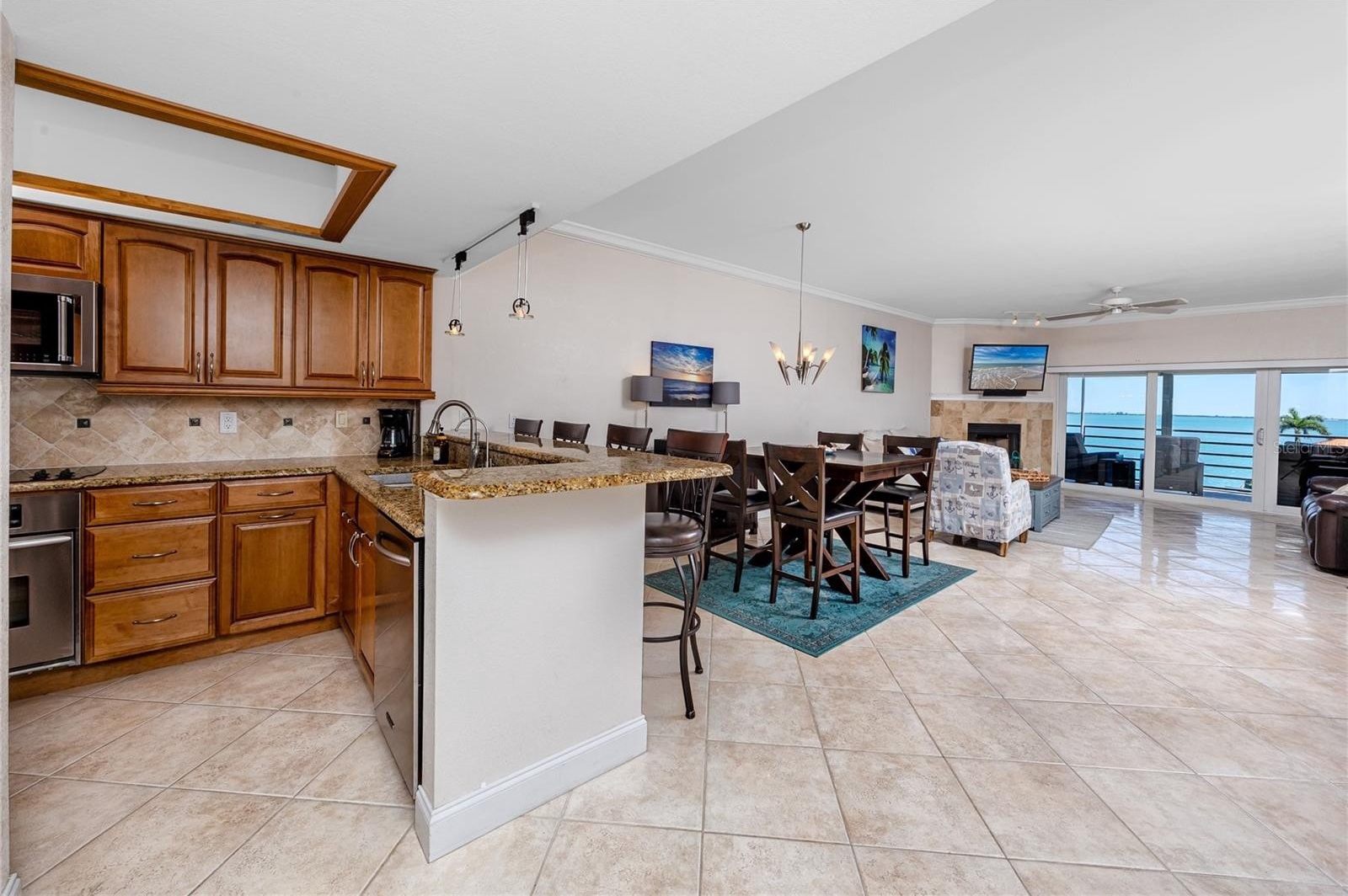Experience refined waterfront living in this top-floor residence in desirable Tierra Verde’s Anchor Cove.This spacious residence showcases sweeping water views from the kitchen, great room, and primary suite, all opening to an expansive 9’ x 26’ balcony, the perfect place to relax and enjoy passing dolphins and coastal wildlife, complete with dual ceiling fans, a large storage closet, and electric hurricane shutters.Elevated ceilings and an open-concept design create a bright, airy atmosphere throughout the home.