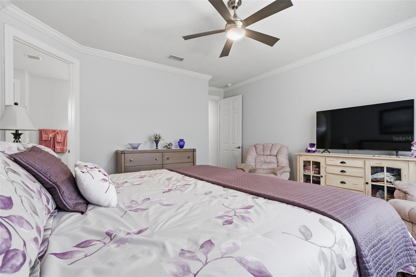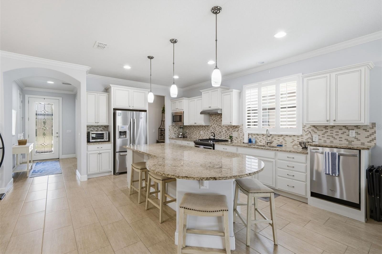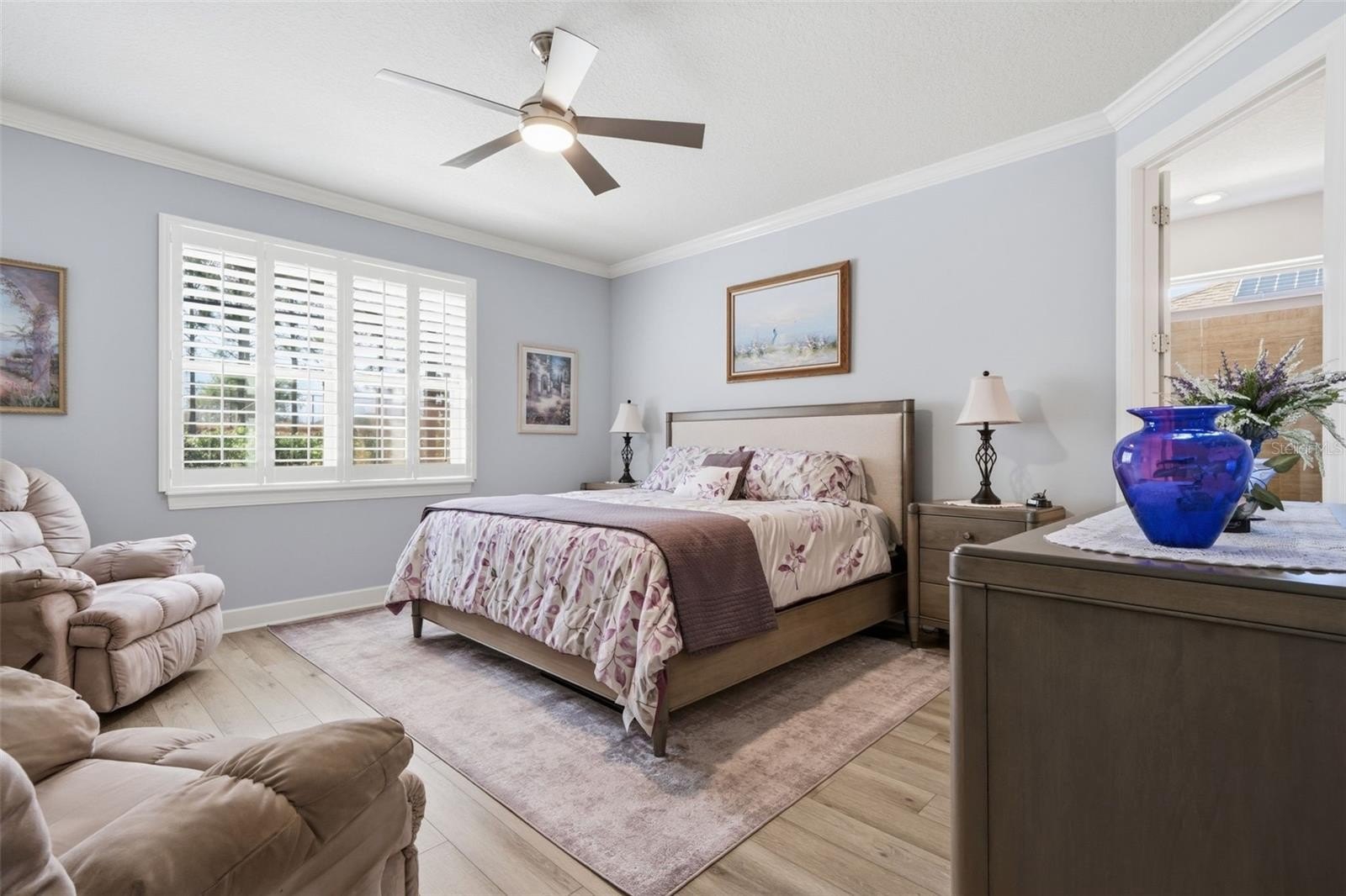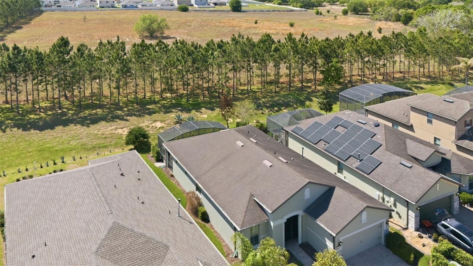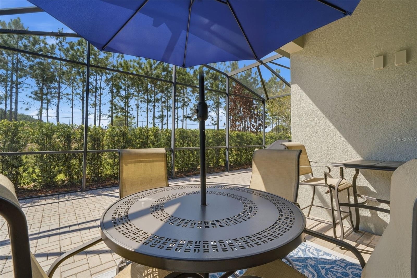 Located in the desired 55+ RESORT STYLE community of Del Webb Orlando, this Martin Ray floor plan situated on a cul-de-sac within walking distance to the Clubhouse has 2 bedrooms, 2 bathrooms, plus a den. Enter this meticulously maintained home through the screened-in front entry through the 8' decorative glass front door. The first thing you will see is the den/office located in the front of the home with beautiful glass French doors. The guest bedroom and bathroom are off to the right side with the guest bathroom featuring a shower/tub combo with tiled walls and granite countertop. The kitchen includes granite countertops, stainless steel appliances, upgraded 42" cabinets with crown molding, built-in cabinet pullouts, backsplash, a large island for all your entertaining needs, a raised dishwasher, and a supersized walk-in pantry. The large master retreat is located in the rear of the home for owner privacy and features a tiled shower with glass doors, double sinks, a linen closet and a large walk-in closet. From the great room you step through large sliding glass pocket doors onto an extended covered lanai with an additional screened-in area with a beautiful tranquil view with no rear neighbors. The large laundry room has cabinets for extra storage and a utility sink, and is located next to the primary bedroom for convenience. The two-car garage with tandem space for a golf cart or extra storage has been upgraded with an epoxy floor and is outfitted with overhead storage. The interior and exterior of the home were recently painted. And best of all a new HVAC system was installed within the last 2 years and includes a 10-year warranty. Other upgrades include plantation shutters throughout, crown molding in the living areas, rounded drywall corners, and updated lighting. The $425 semi-annual HOA fee provides 24x7 staffed security gate and master association-owned private road maintenance. Adjacent to recently renovated 18-hole White Heron Golf Club. The $282 monthly Del Webb HOA fee includes exclusive access to resident-owned 30,000+ SF Montecito clubhouse and amenities. DEL WEBB ORLANDO is a 55+ community with a tavern, indoor walking track, fitness center, indoor and outdoor pools and spas with locker rooms and showers, billiards, ping pong, craft room, and a ballroom for special events. Outdoor activities include pickleball, tennis, bocce, basketball, shuffleboard, community gardening center, an outdoor amphitheater, large brick fire pit and large screened-in gazebo over the water. Miles of biking and walking trails within Ridgewood Lakes gated community. Located conveniently to shopping at Posner Park (4 miles), Disney World, Universal Studios, Orlando & Central FL entertainment nearby. Easy access to I-4, medical facilities, airports & Sunrail Station. Advent Health hospital is 3 miles away.