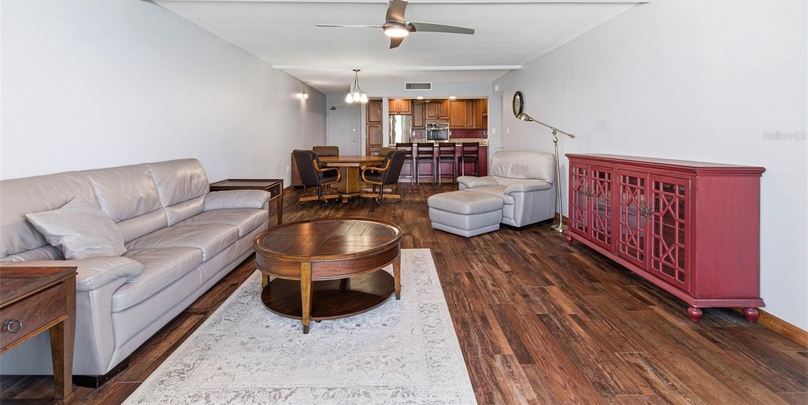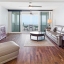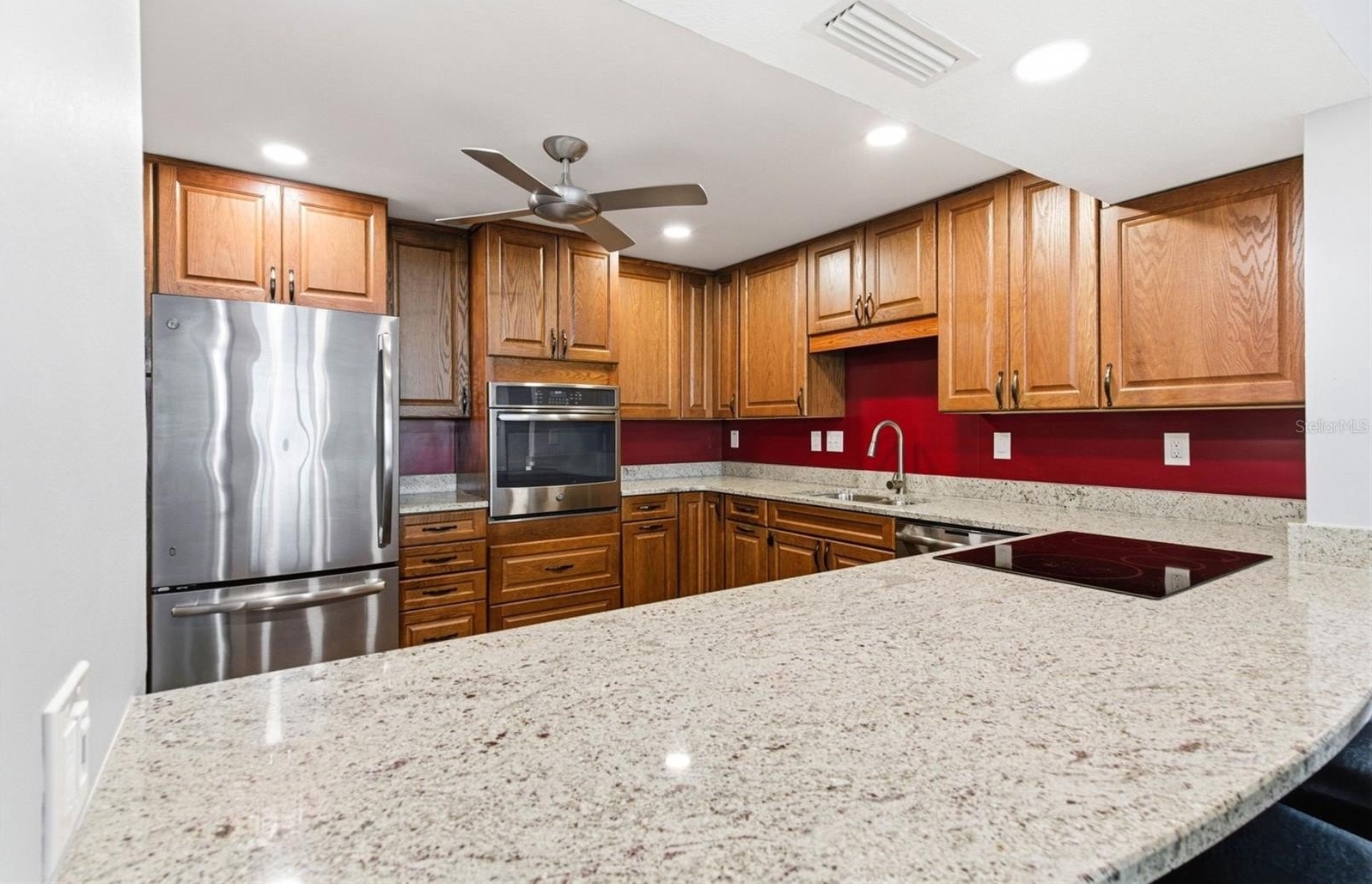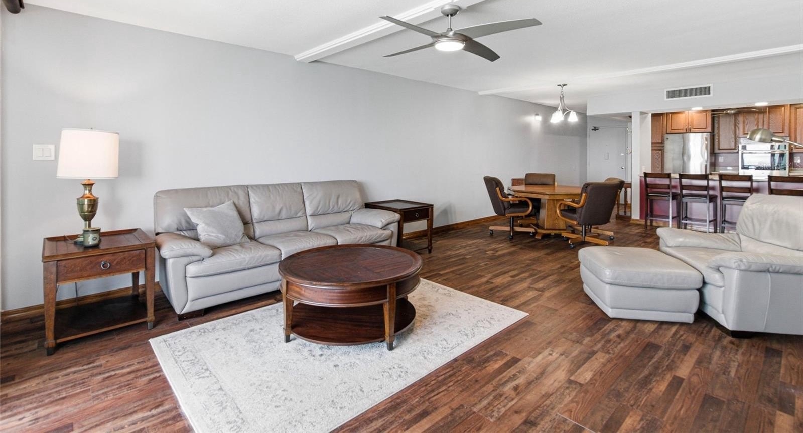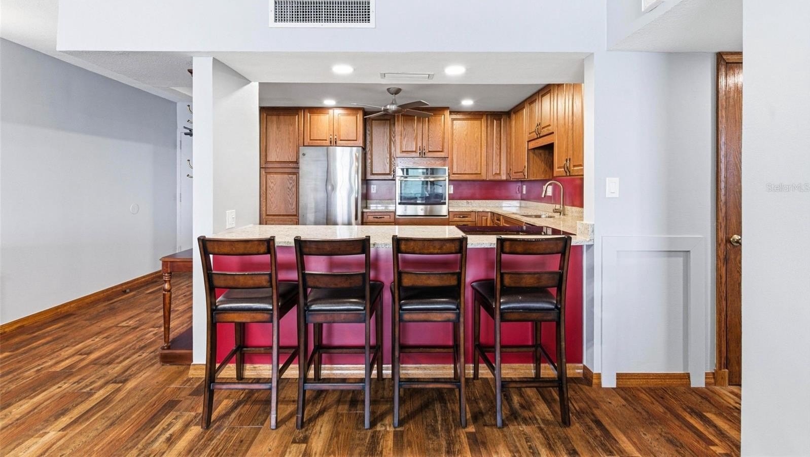As you enter, you're immediately greeted by an open-concept layout that flows effortlessly from the kitchen to the spacious living and dining areas. Sliding doors lead to a large private balcony where daily sunsets paint the sky with breathtaking color. The kitchen is a chef’s dream, featuring granite countertops, stainless steel appliances, custom cabinetry, and a counter-height seating area perfect for casual dining or entertaining.