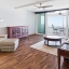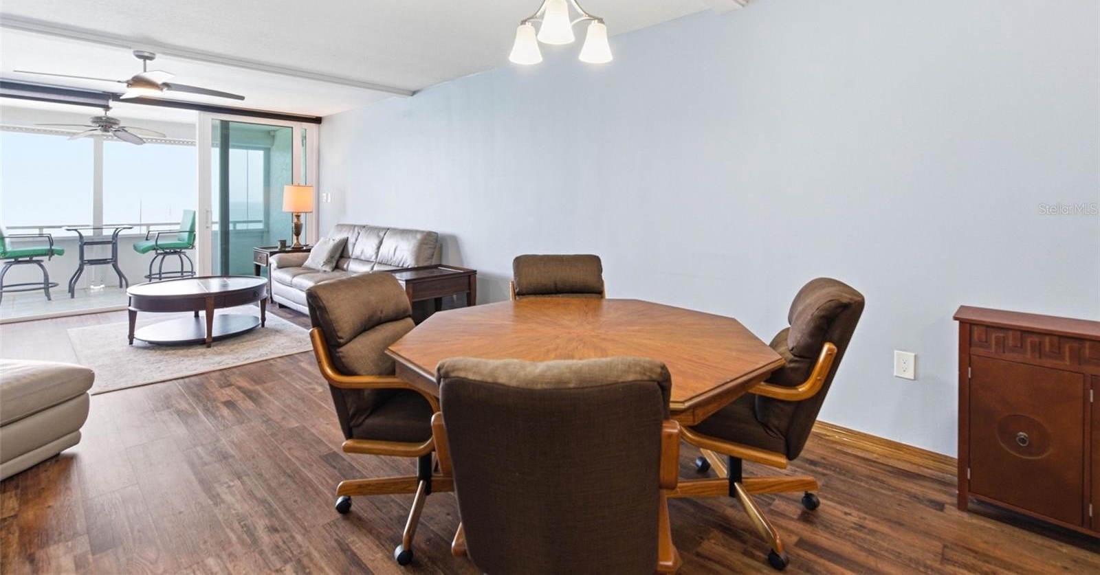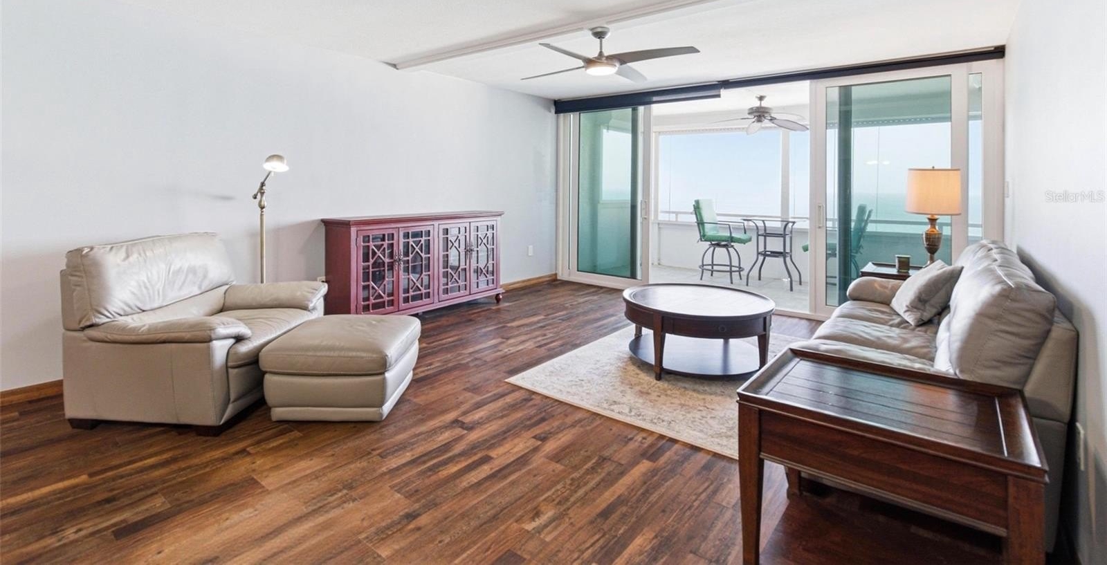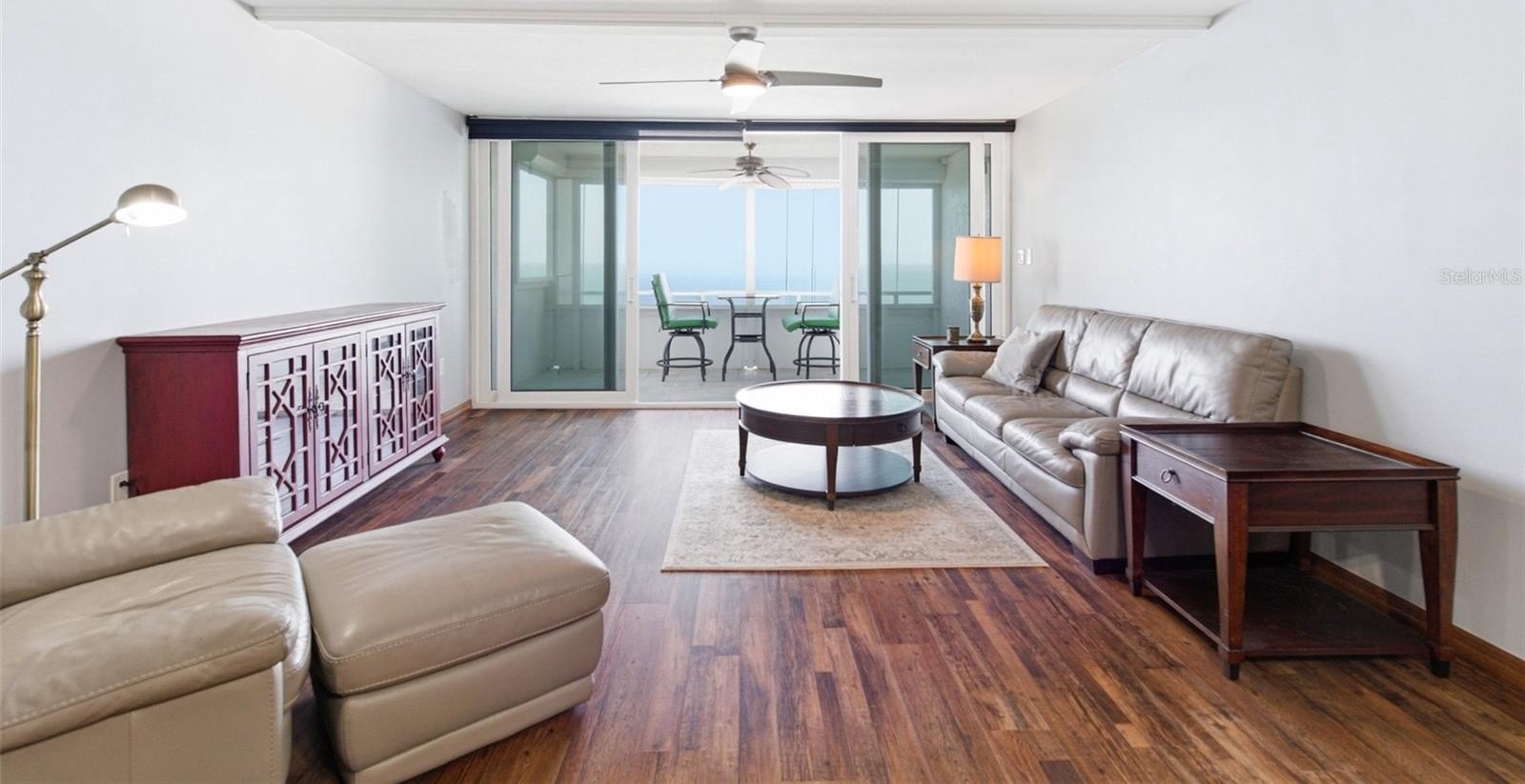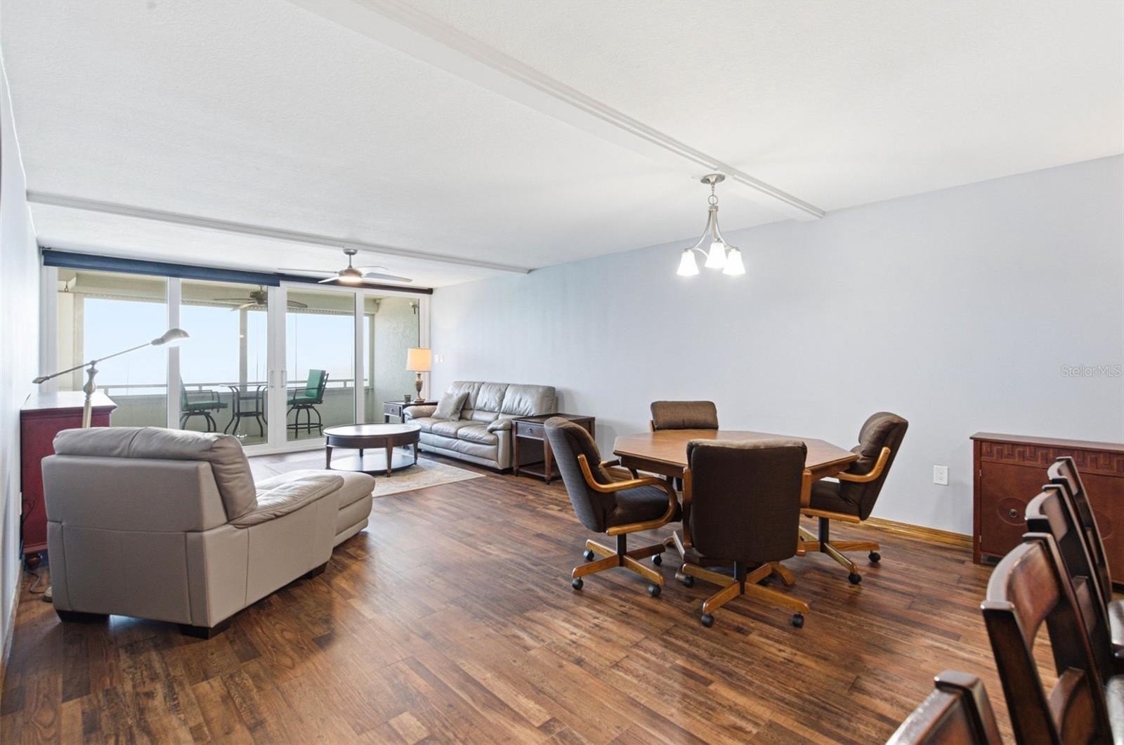 As you enter, you're immediately greeted by an open-concept layout that flows effortlessly from the kitchen to the spacious living and dining areas. Sliding doors lead to a large private balcony where daily sunsets paint the sky with breathtaking color. The kitchen is a chef’s dream, featuring granite countertops, stainless steel appliances, custom cabinetry, and a counter-height seating area perfect for casual dining or entertaining.