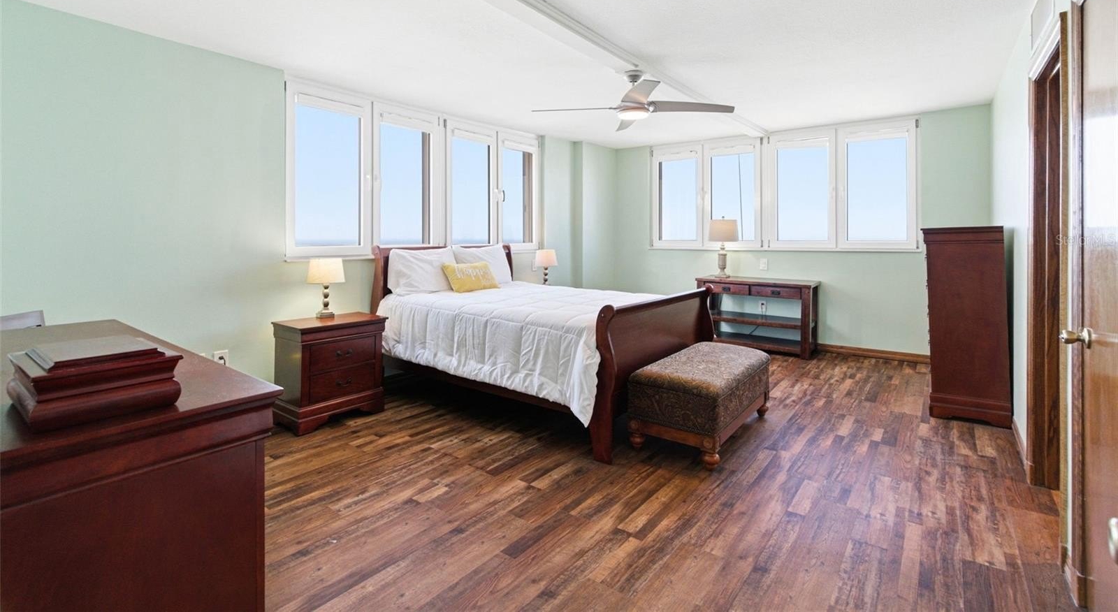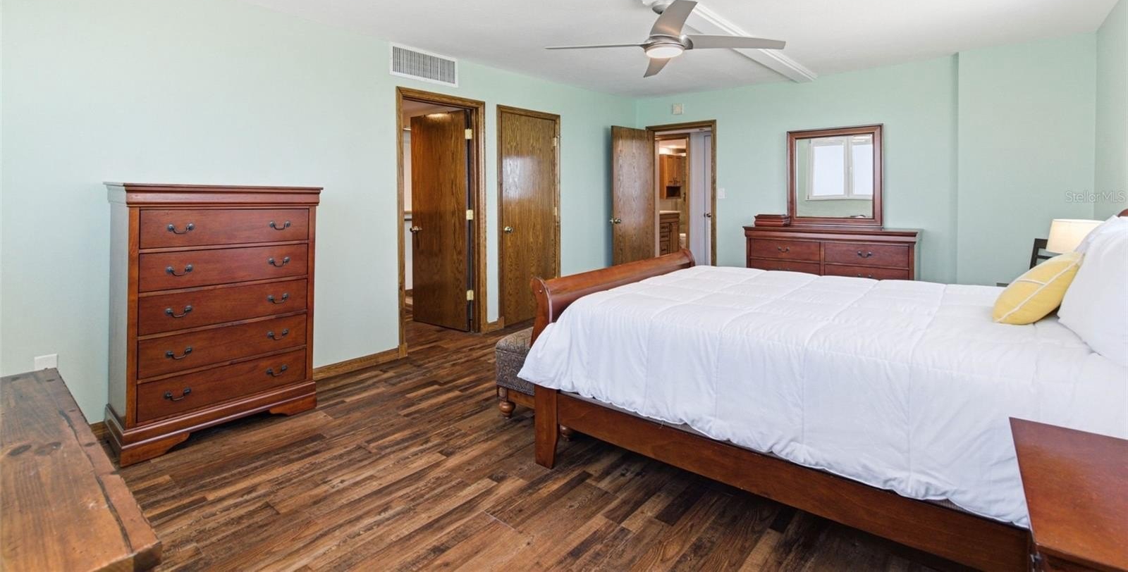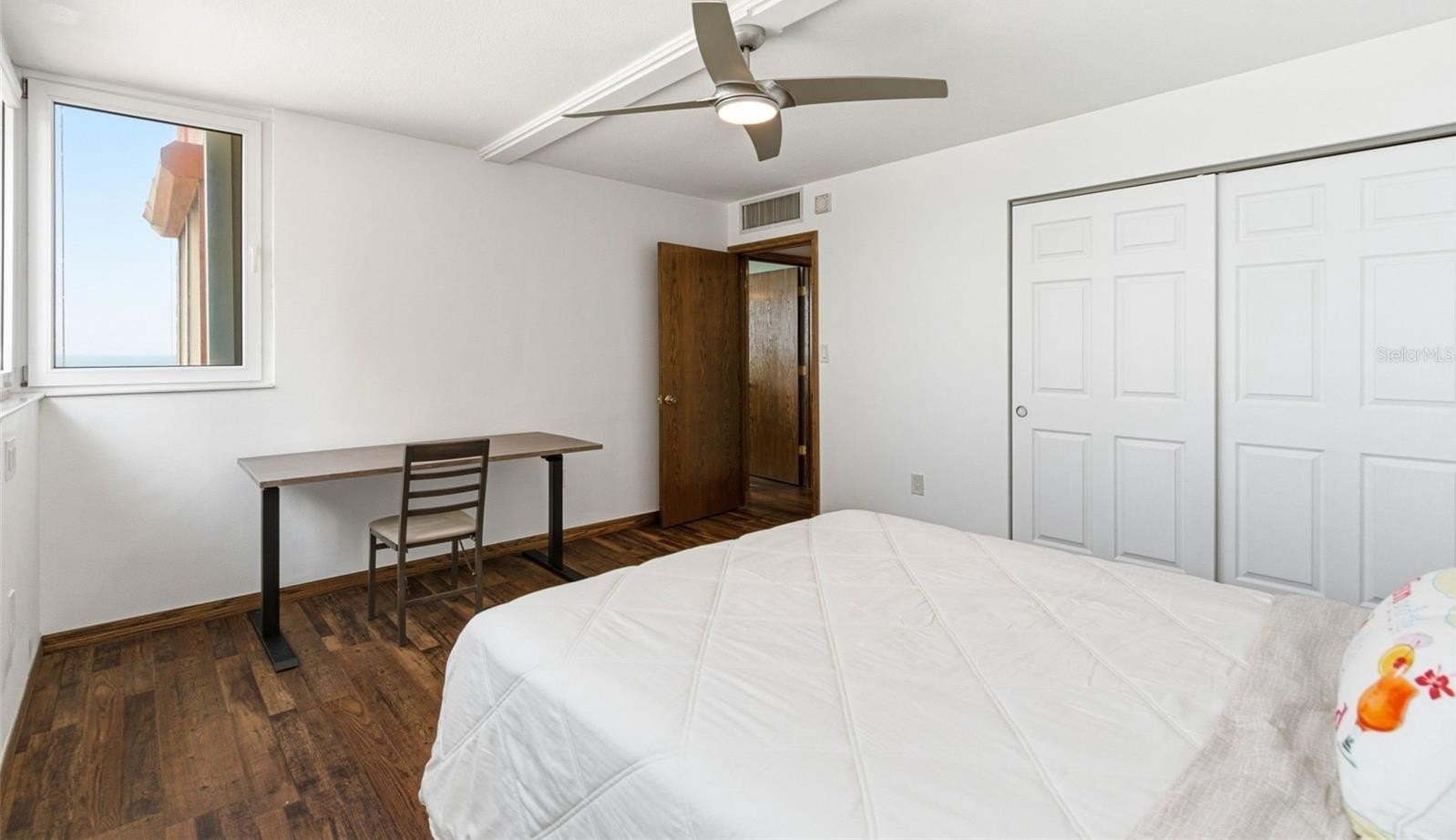 Both bedrooms are generously sized and offer direct water views, with the primary suite boasting an en-suite bath and a walk-in closet professionally designed to maximize space and functionality. Tile flooring runs throughout the unit, creating a clean and low-maintenance living space perfect for full-time residence or a seasonal getaway.