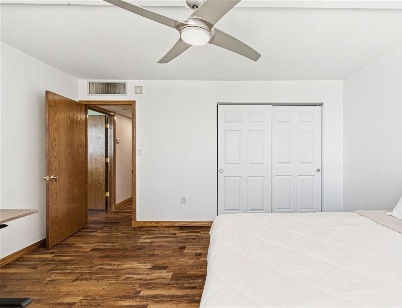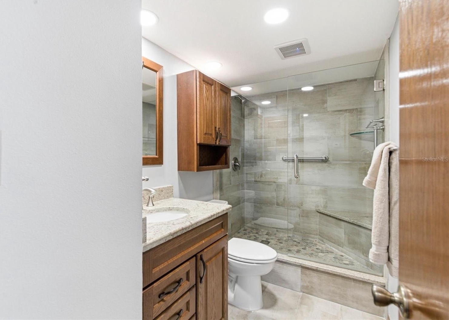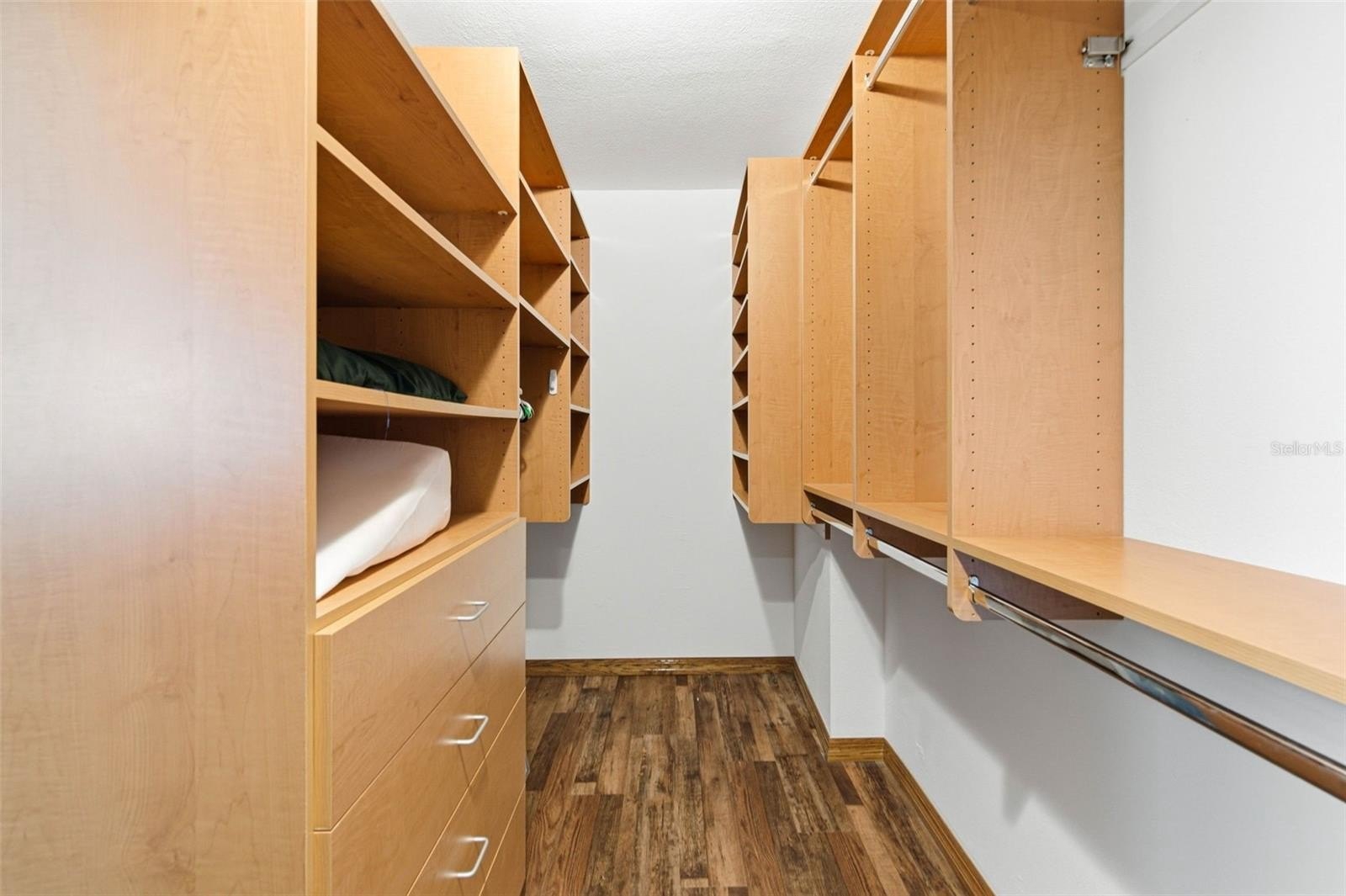 Both bedrooms are generously sized and offer direct water views, with the primary suite boasting an en-suite bath and a walk-in closet professionally designed to maximize space and functionality. Tile flooring runs throughout the unit, creating a clean and low-maintenance living space perfect for full-time residence or a seasonal getaway.