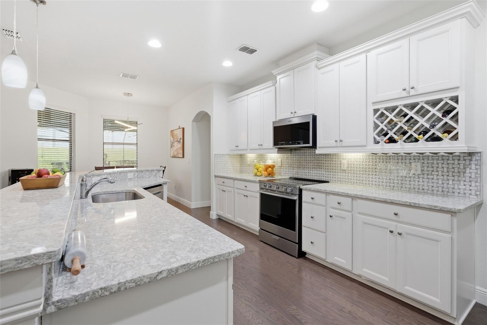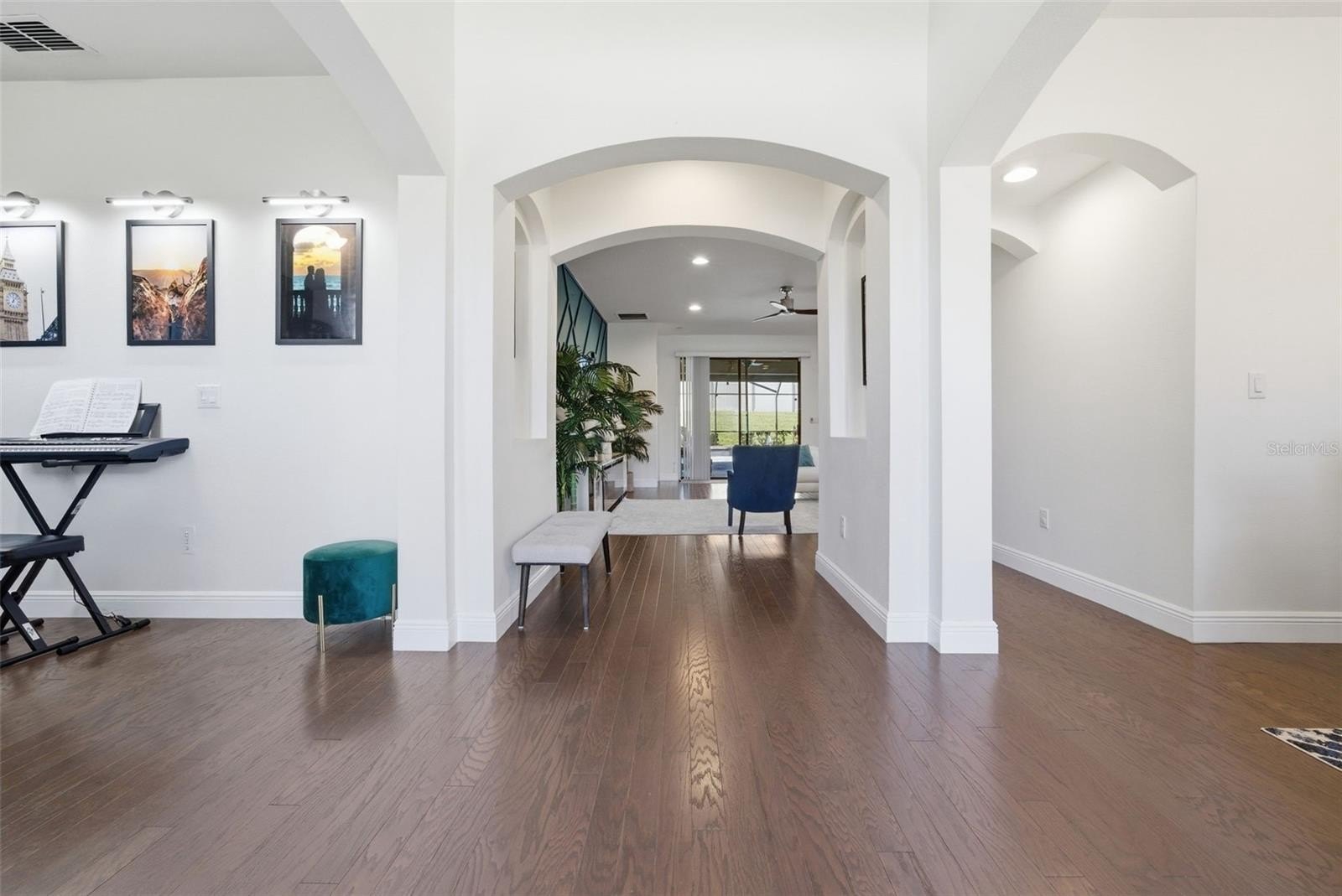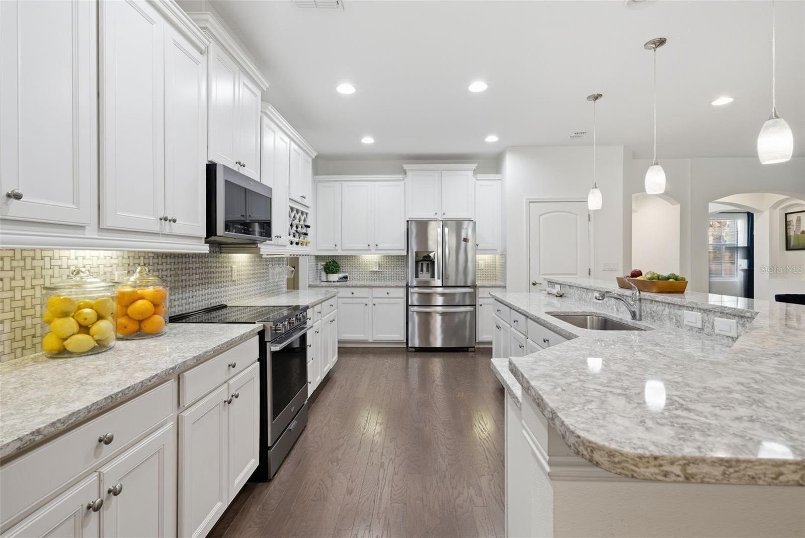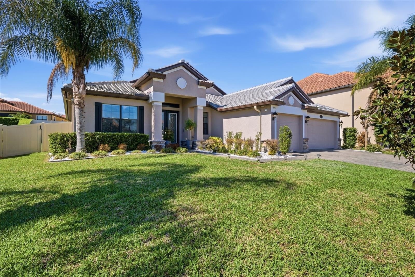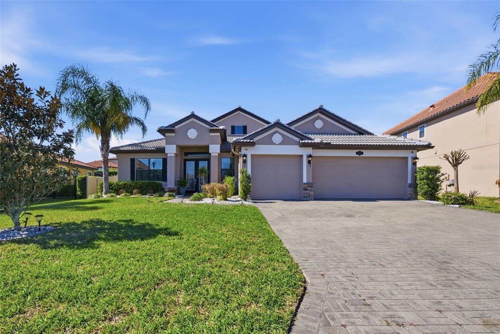 One or more photo(s) has been virtually staged. Welcome to Terralargo a gated community, conveniently located just minutes from Lakeland Square Mall. This 5-bedroom, 4-bathroom, 3-car garage home offers a functional layout and numerous upgrades, featuring a paver driveway, mature landscaping, and a newer barrel tile roof tile. Double glass entry doors open to high ceilings and wood flooring throughout the main living areas, with a formal dining room, private den/office, and an open-concept living space filled with natural light. The kitchen includes a large center island, quartz countertops, ample cabinetry, and updated appliances (2021), ideal for everyday living and entertaining. The spacious primary suite features a tray ceiling and en-suite bath with dual sinks, a garden tub, and a separate shower, while additional highlights include generously sized secondary bedrooms, a full pool bath, a separate laundry room, and an upstairs bonus room with a full bath. Outdoor living is enhanced by a covered and screened lanai with a custom pool and spa, creating a private setting for relaxation and gatherings. Recent updates include 2021 kitchen appliances, lighting, and ceiling fans; 2022 primary closet system; 2023 flooring, baseboards, interior paint, kitchen backsplash, and 3.5-ton downstairs HVAC; 2024 gutters, feature walls, and office lighting; 2025 landscaping, driveway sealing, and security system; and 2026 vinyl privacy fence, exterior paint, and refreshed primary suite. Residents enjoy resort-style amenities, including a heated beach entry pool, spa, 24-hour fitness center, clubhouse, and sports courts (tennis, pickleball, basketball), conveniently located between Tampa and Orlando. Schedule a showing today.