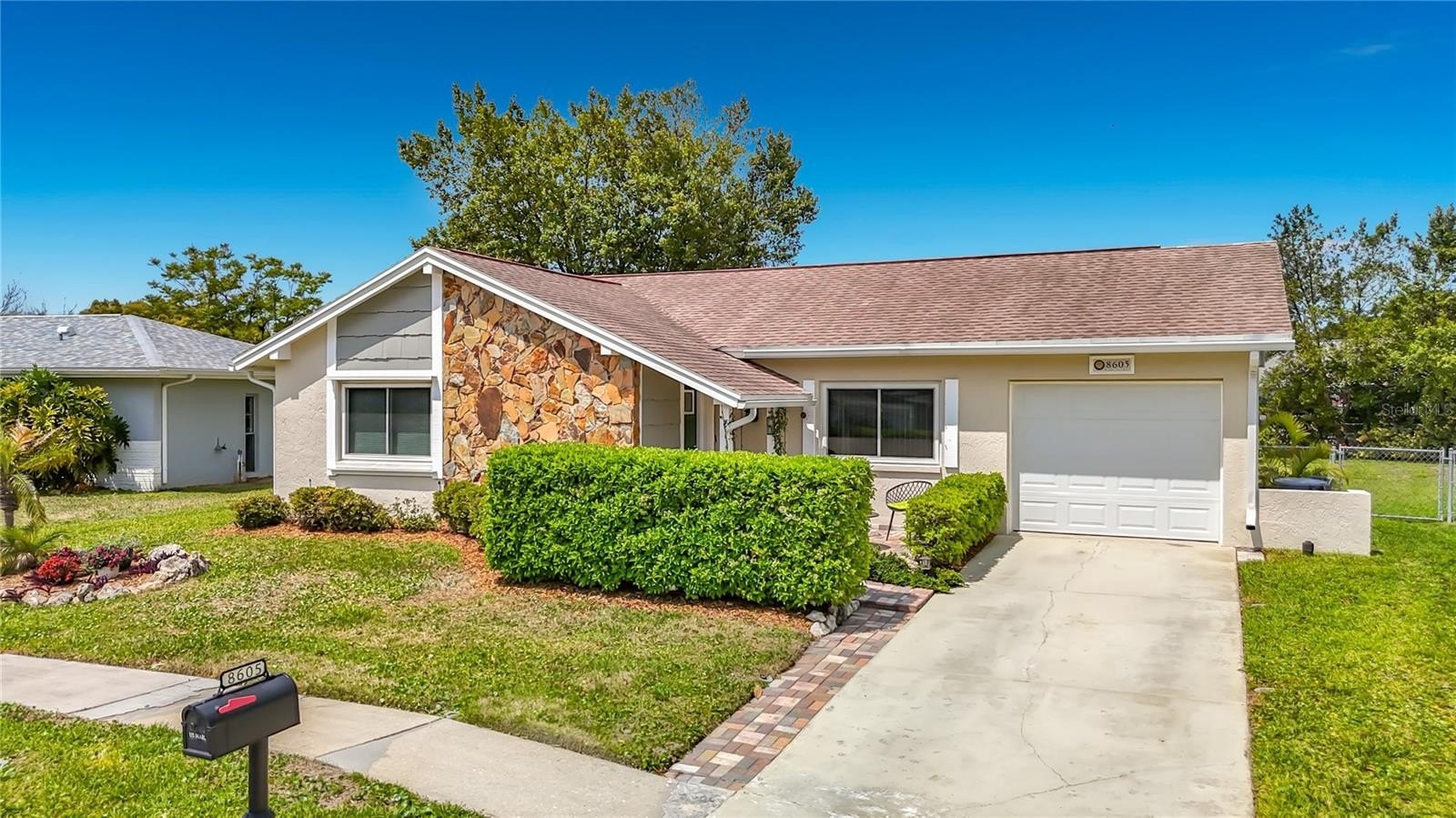 This 3 bedroom, two bath home is a fantastic find where you can live the Florida Lifestyle with financial peace of mind knowing this is NOT a flood zones, there are NO CDD fees, and extremely low HOA fees. This lovely home has it all: a modern kitchen with quartz counter tops and integrated sink, luxury vinyl plank flooring, the combination of a private front courtyard and screened lanai overlooking the large fenced back yard. Beacon Woods East is a designated Bird Sanctuary with ample sidewalks to enjoy walking and biking. The Clubhouse offers a huge salt water pool, tennis courts and scheduled activities. All of this within a short distance of the Suncoast Highway, giving you quick access to the Tampa Airport, world class beaches and many attractions such as Busch Gardens and Adventure Island.