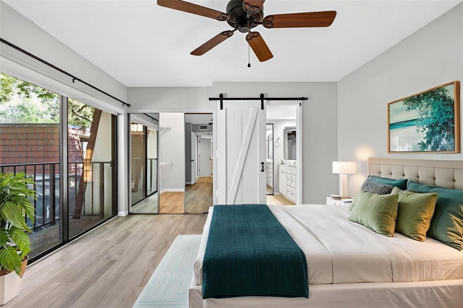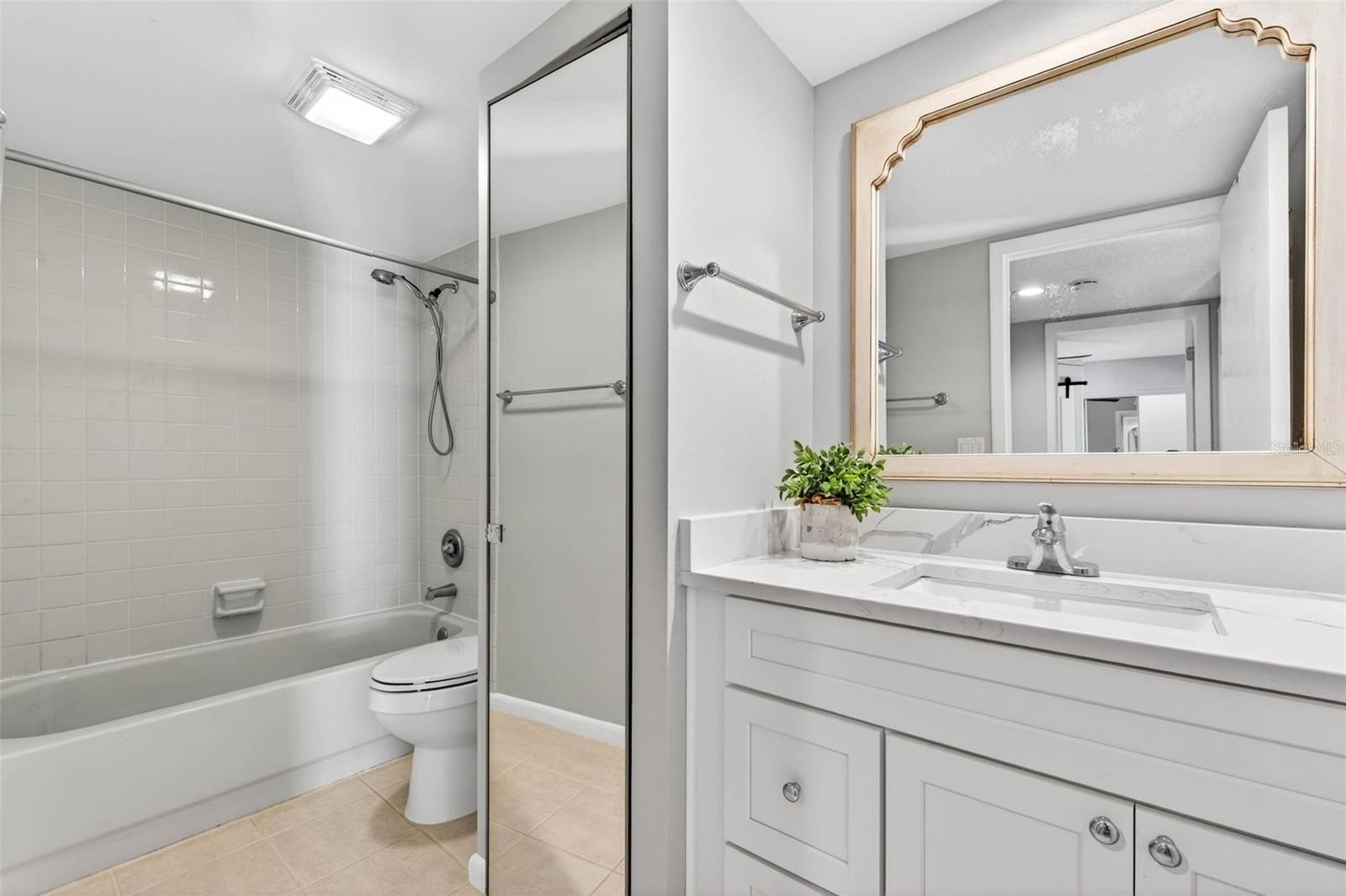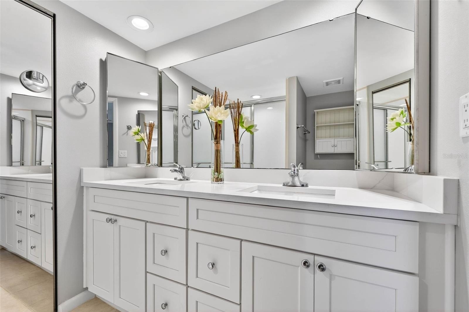 Upstairs, both bedrooms are generously sized and offer updated en-suite bathrooms, providing privacy and comfort. The primary suite features a large walk-in closet and a beautifully remodeled bath with modern finishes. Sliding glass doors leading to the balcony enhance natural light and contribute to the home’s airy, open feel.