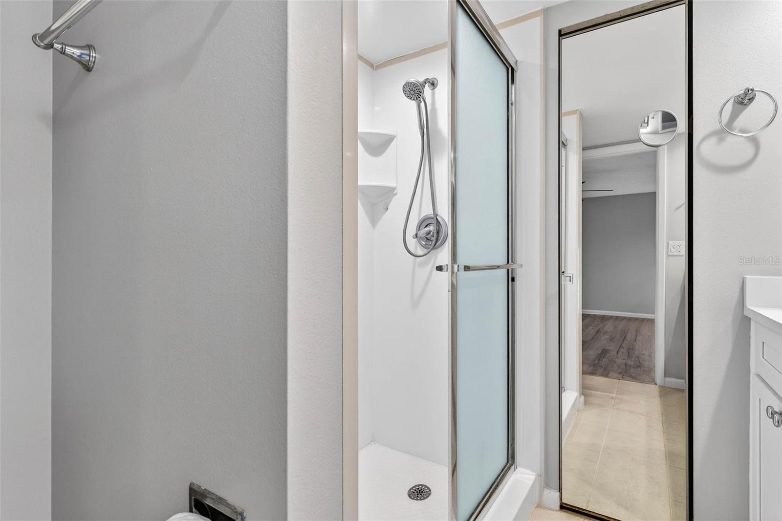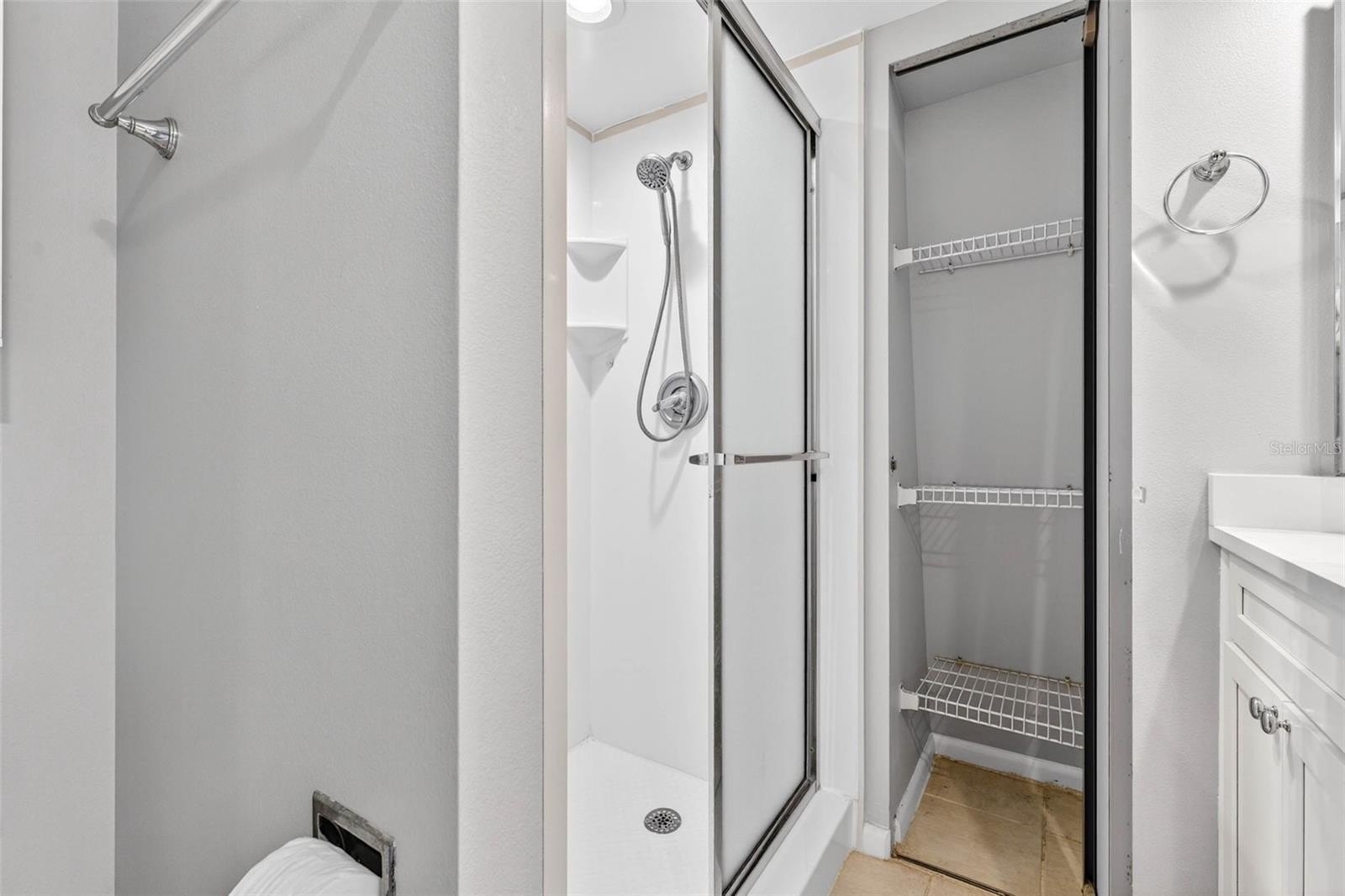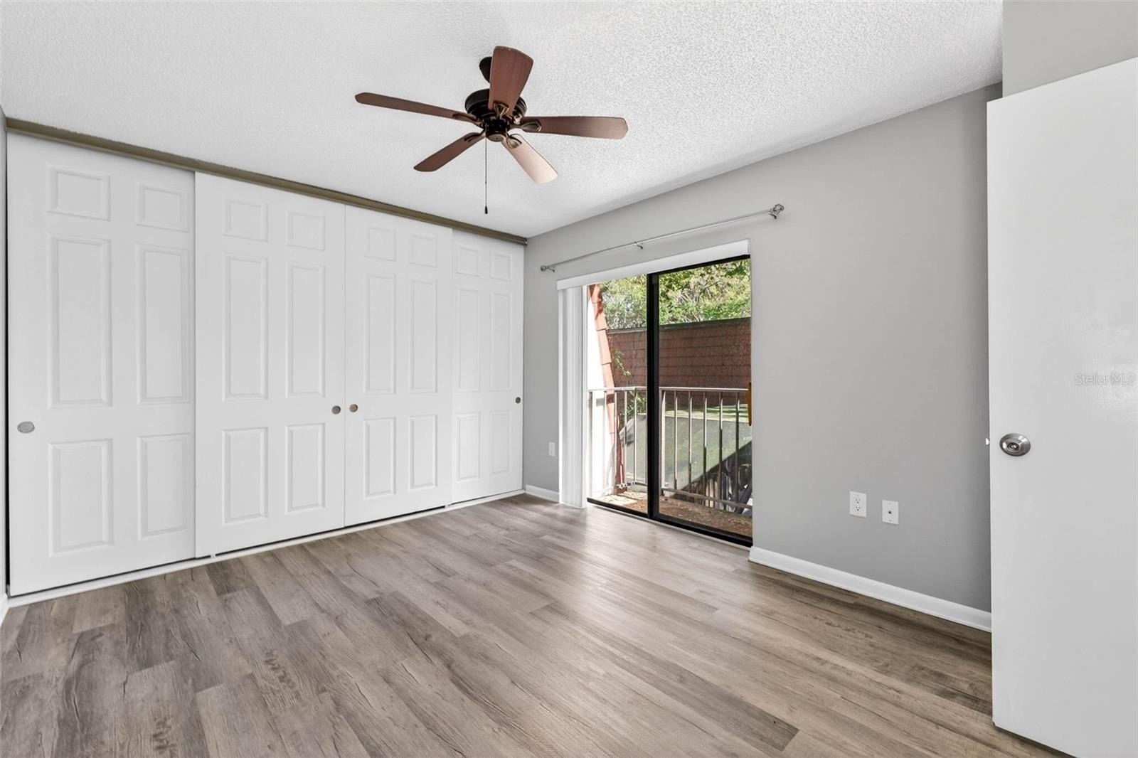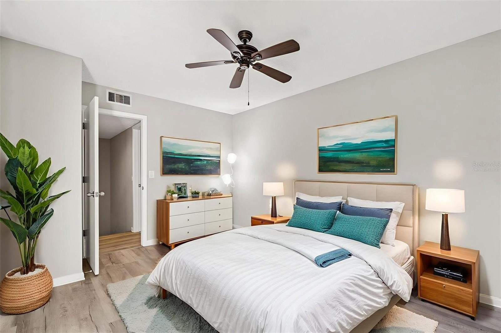 Upstairs, both bedrooms are generously sized and offer updated en-suite bathrooms, providing privacy and comfort. The primary suite features a large walk-in closet and a beautifully remodeled bath with modern finishes. Sliding glass doors leading to the balcony enhance natural light and contribute to the home’s airy, open feel.