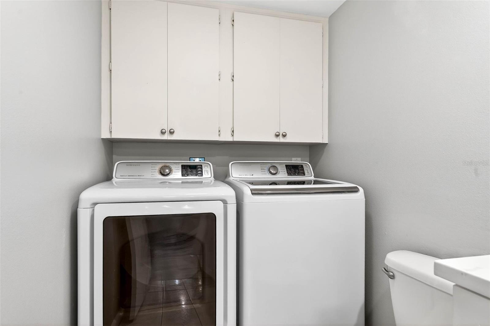 The first floor also includes a convenient half bath and a dedicated laundry area with newer washer and dryer included, along with additional storage for added practicality.