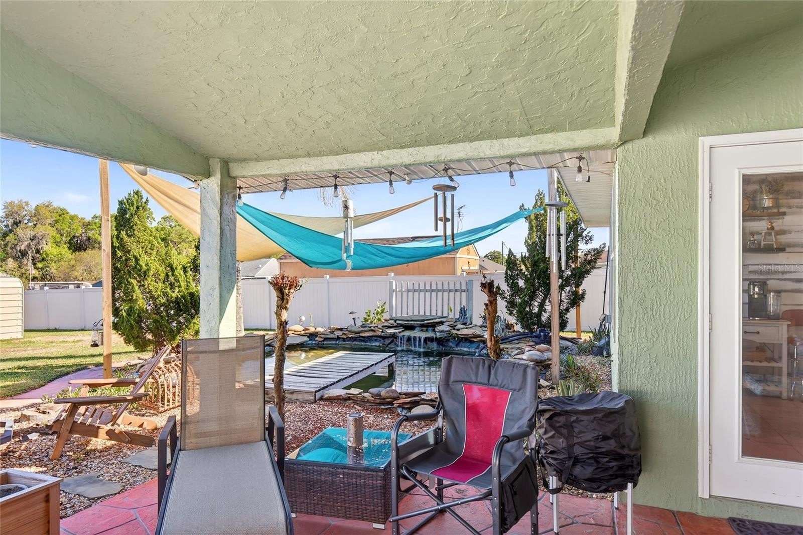 ---EXTERIOR FEATURES: 288 sq ft covered back porch/patio. Large Koi/Fish pond with pump & waterfall. WORKSHOP with electric. Storage shed with slab floor. Full PRIVACY FENCE.