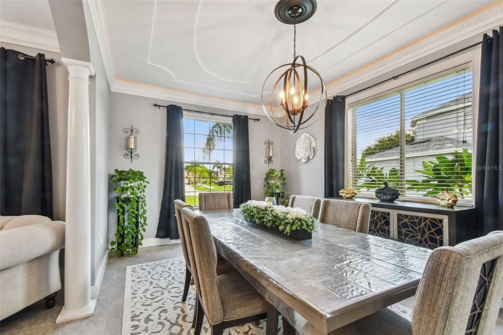 Chandelier and view of the golf course through the backyard. There is crown molding and window frames throughout the formal dining and living
