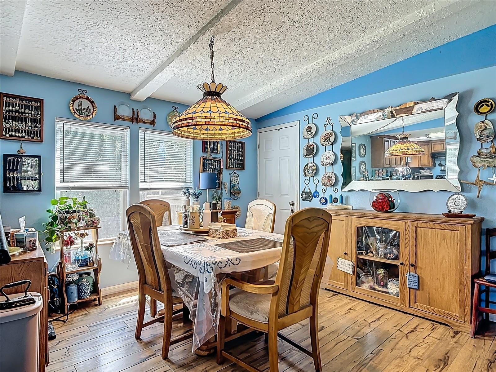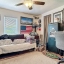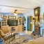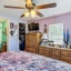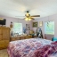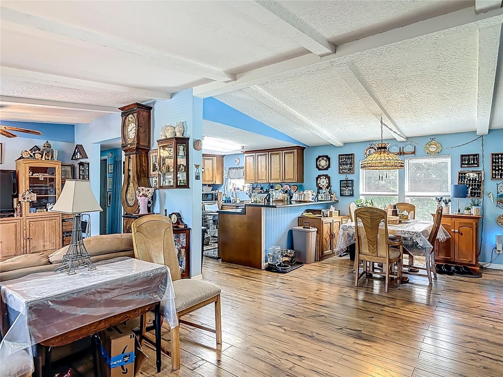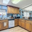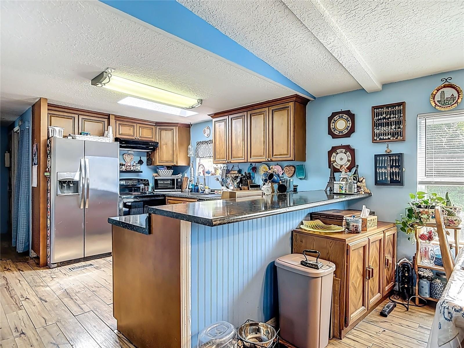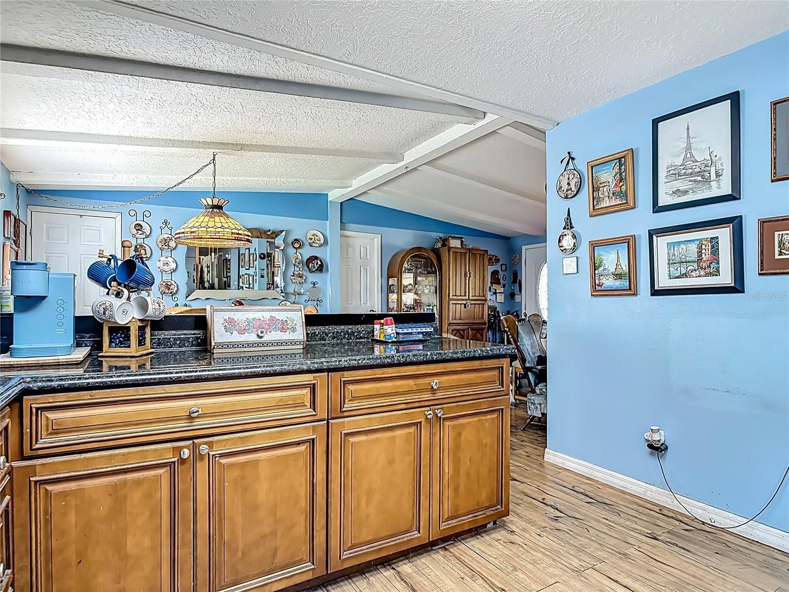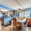 The home features 3 bedrooms and 2 bathrooms with open-concept layout connecting the kitchen, dining, and living area. The kitchen offers warm wood cabinetry, ample granite countertops, and bar seating for up to five. All bedrooms include walk-in closets, and both bathrooms are spacious with ample storage. A separate laundry area and multiple storage closets.