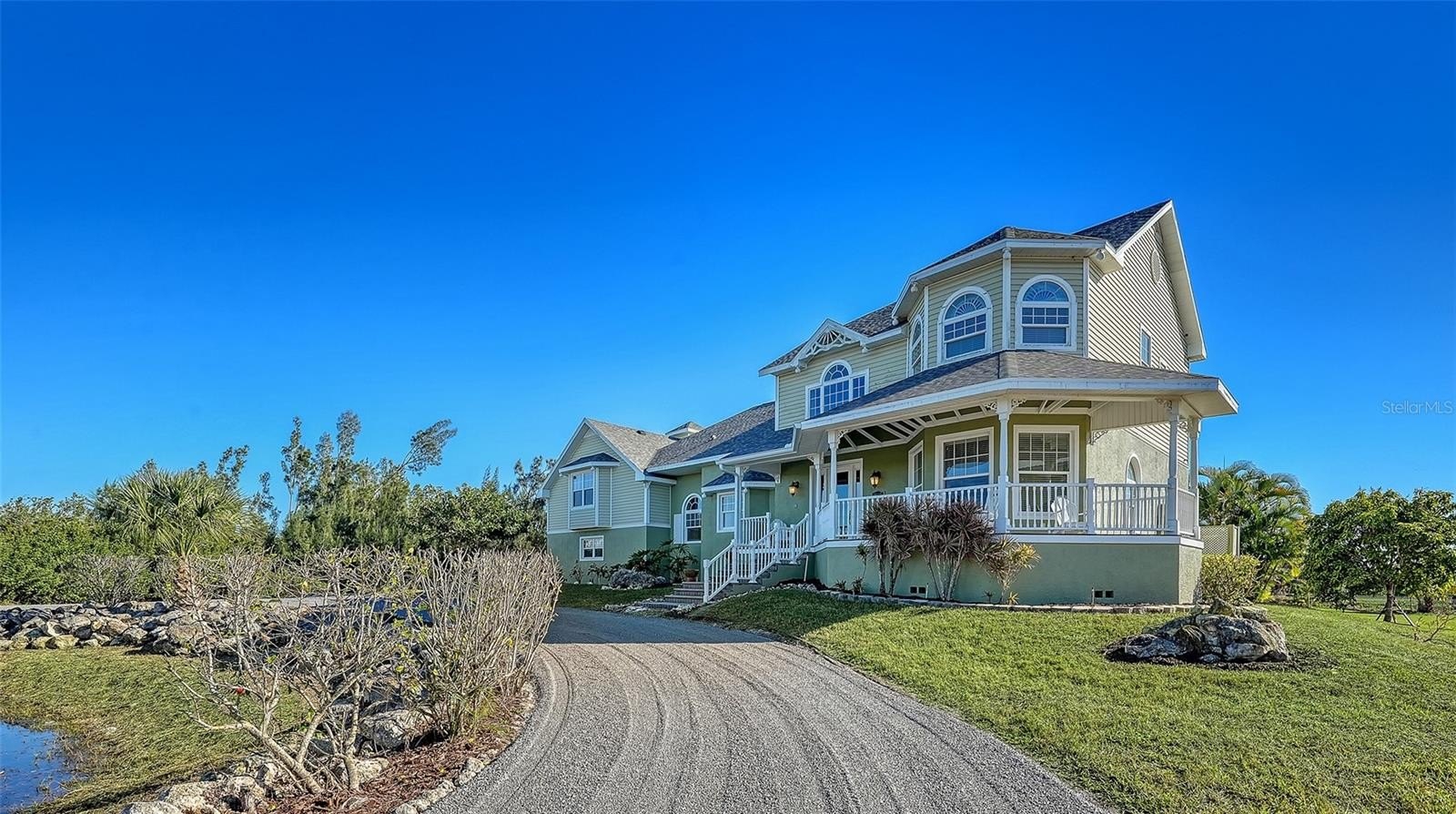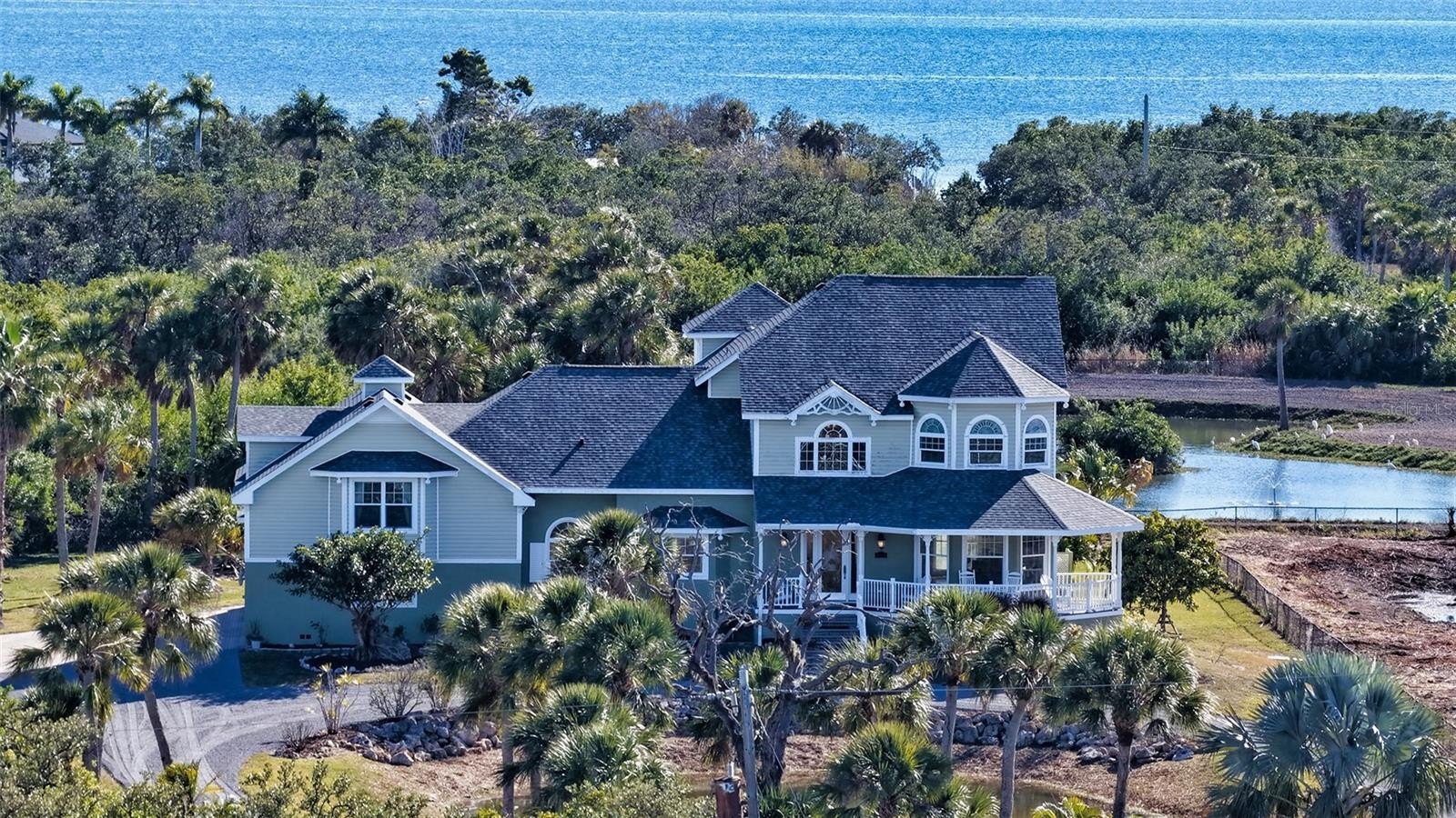 Terra Ceia, also known as Heavenly Earth, is the name of the State Archaeological Site of the Madeira Bickel Mound. This remarkable custom-built home, which has remained high and dry despite the 2024 storms, offers 4,055 square feet of air-conditioned space and 5,641 square feet of wraparound porches, screened lanai, and three open-air decks. It is perfectly situated on 1.66 acres of private uplands with a fenced yard. A decorative electric gate opens on your command, inviting you to stay and observe the natural bird habitat in an artesian pond. A private elevator takes you to the main levels of this spacious and open home, featuring soaring ceilings, hardwood floors, all-wood cabinets, a gas fireplace, granite countertops, and arched entries. The grand foyer with a wraparound staircase will also take you to all the well-used spaces in this home, which include two offices and a morning room. The three spacious bedrooms are all en suite, with the master suite offering a large jetted tub, a large separate walk-in shower with its own water heater, double sinks, a dressing vanity, and a spacious closet. A fabulous air-conditioned observatory with a wet bar, open deck, offers a 180-degree view of nature and Terra Ceia Bay. Enjoy the convenience of a community boat ramp. You will appreciate the side entry oversized garage with ample storage space. Located in a quiet yet convenient area, you will experience the Old Florida feeling of relaxation as you explore this 4,200-acre protected land surrounding the island. Recent updates include(Roof and gutters 2025, exterior painted, electric gate motor replaced)