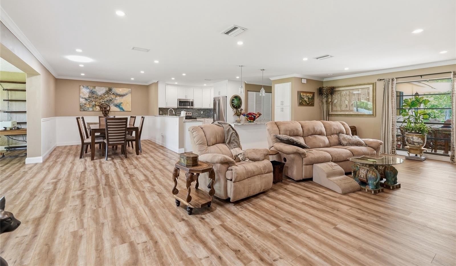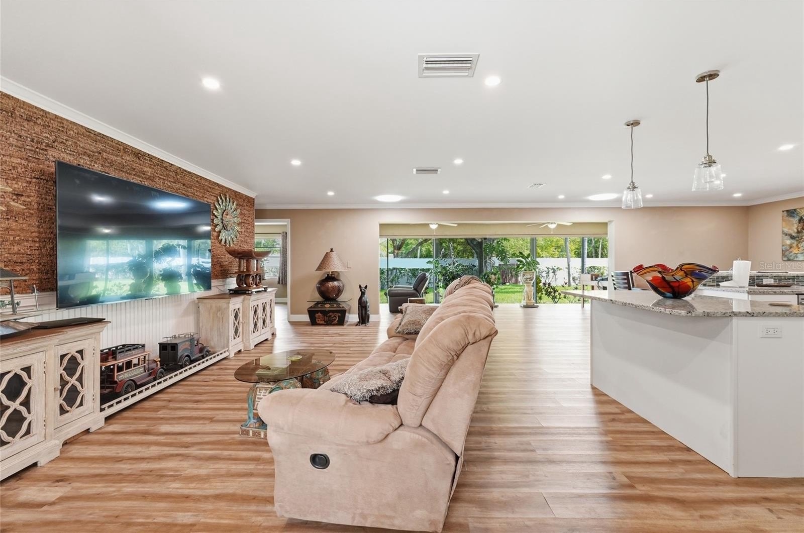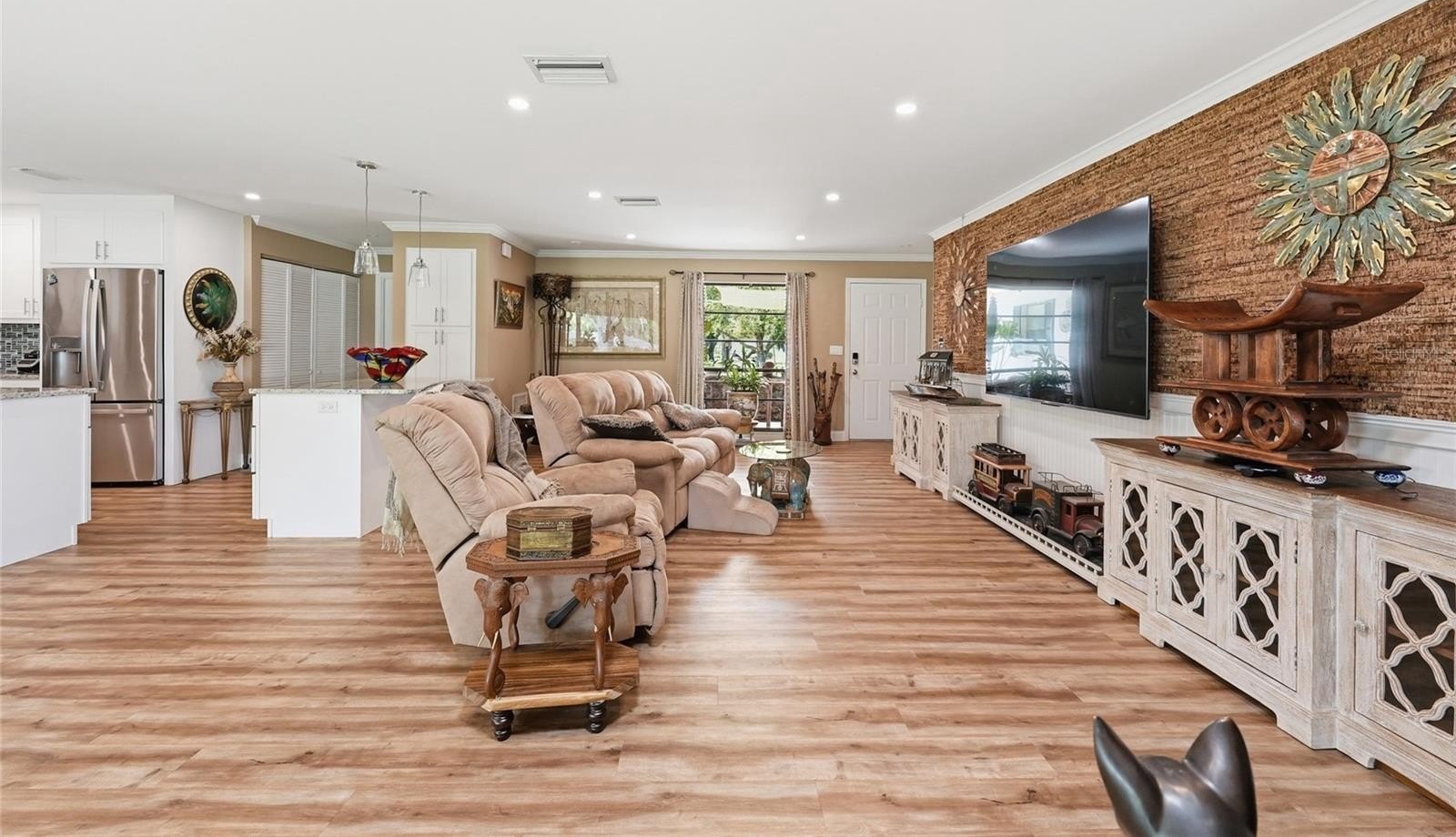 The redesigned chef’s kitchen is a standout feature, showcasing white shaker-style cabinetry, Brazilian granite countertops, stainless steel appliances, under-cabinet lighting, a stylish tile backsplash and a prep island with convenient breakfast bar. The versatile air-conditioned Florida room expands the living space and is highlighted by a wall of sliding glass doors, providing a bright and inviting atmosphere. The spacious primary suite features dual closets, a beautifully updated walk-in shower, and a vanity with stone countertop and modern plumbing fixtures. Two additional guest bedrooms provide ample space for visiting friends and family. Additional features include luxury plank vinyl flooring throughout, recessed lighting, and a unique custom cork accent wall. Peace of mind comes with major updates already completed, including a newer roof (2022), BRAND-NEW HVAC (2025) and water heater (2019).