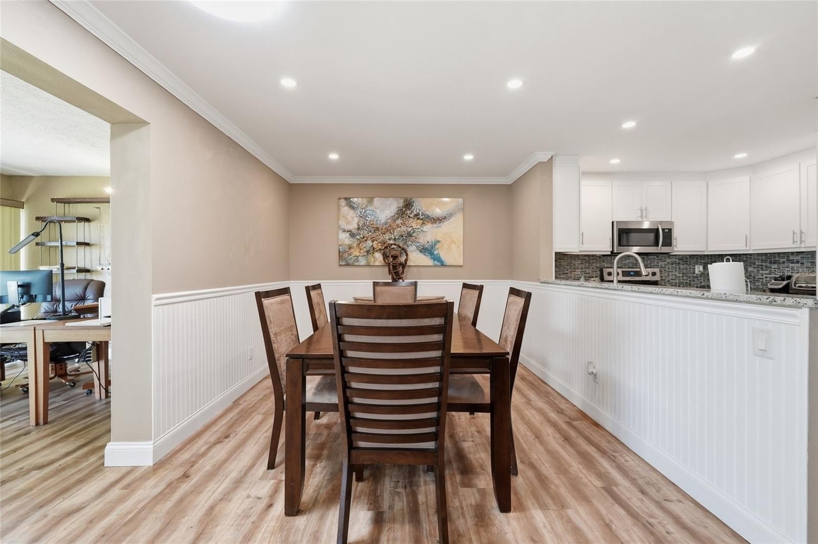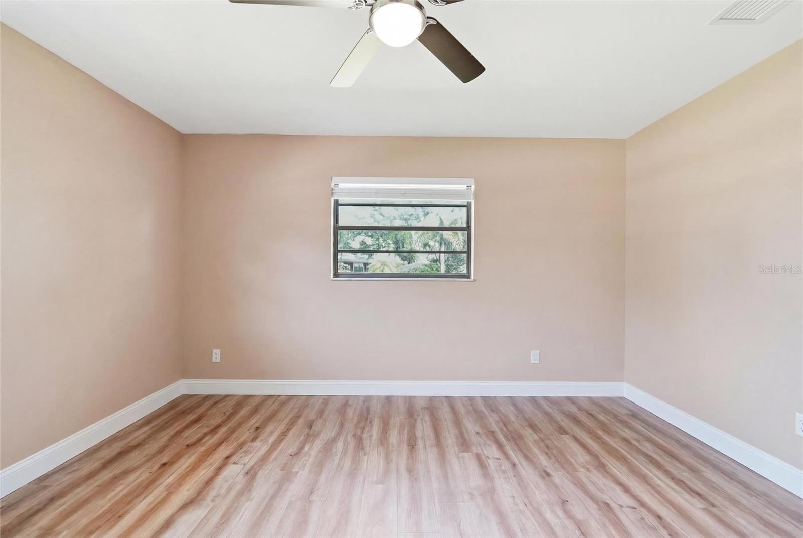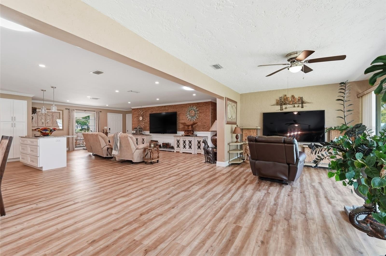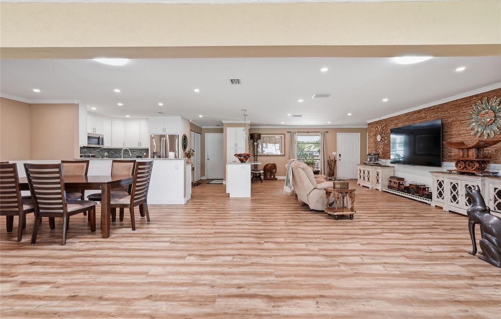The redesigned chef’s kitchen is a standout feature, showcasing white shaker-style cabinetry, Brazilian granite countertops, stainless steel appliances, under-cabinet lighting, a stylish tile backsplash and a prep island with convenient breakfast bar. The versatile air-conditioned Florida room expands the living space and is highlighted by a wall of sliding glass doors, providing a bright and inviting atmosphere. The spacious primary suite features dual closets, a beautifully updated walk-in shower, and a vanity with stone countertop and modern plumbing fixtures. Two additional guest bedrooms provide ample space for visiting friends and family. Additional features include luxury plank vinyl flooring throughout, recessed lighting, and a unique custom cork accent wall. Peace of mind comes with major updates already completed, including a newer roof (2022), BRAND-NEW HVAC (2025) and water heater (2019).