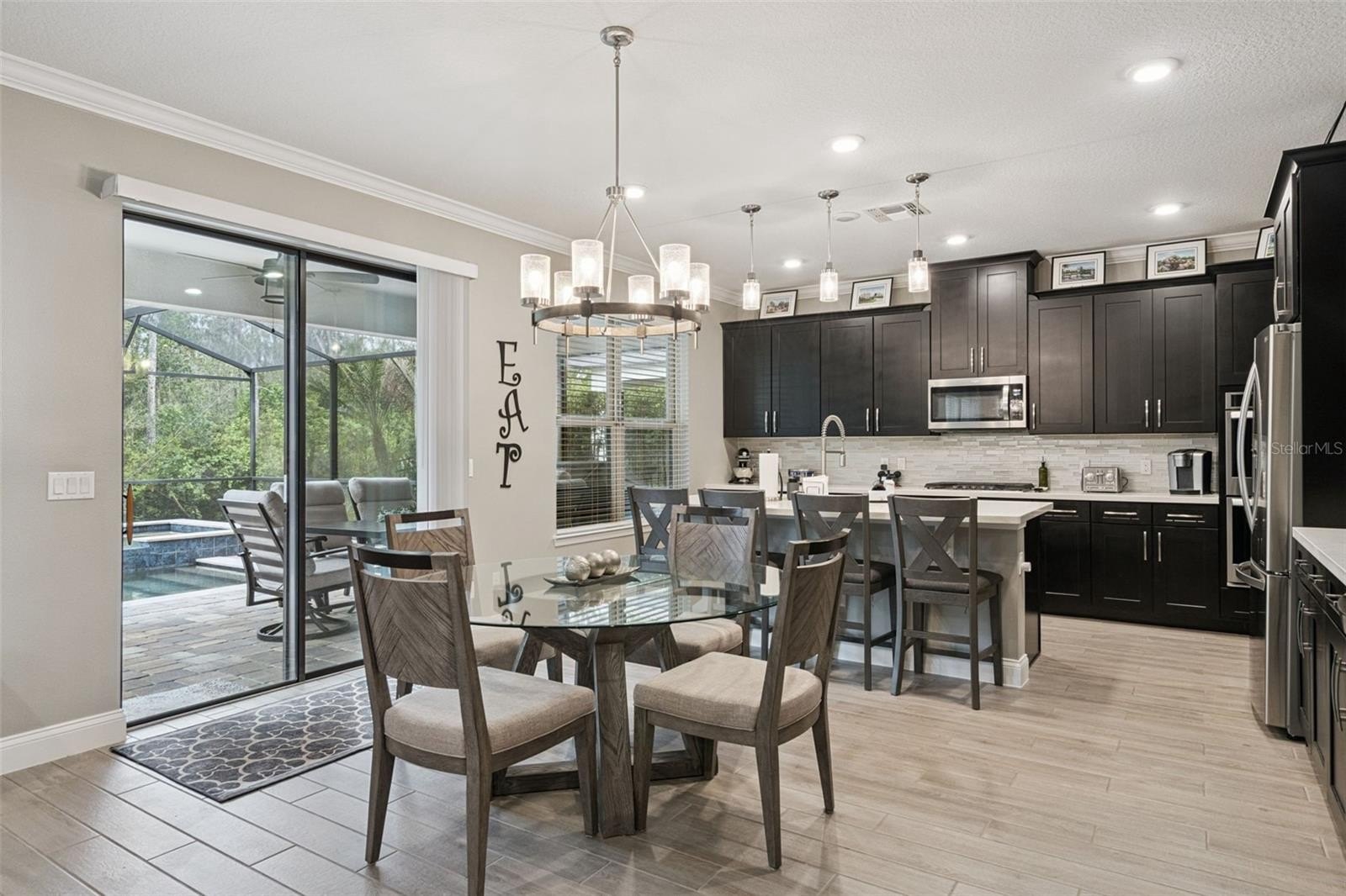 From the charming front porch to the grand foyer with tray ceiling, every detail welcomes you in. The first floor flows effortlessly with warm wood-look porcelain tile, crown molding, and natural light dancing through the spacious family room. Sliding glass doors reveal your own private oasis where a sparkling pool and spa, lush landscaping, and serene conservation views create a peaceful escape that feels worlds away from the everyday.