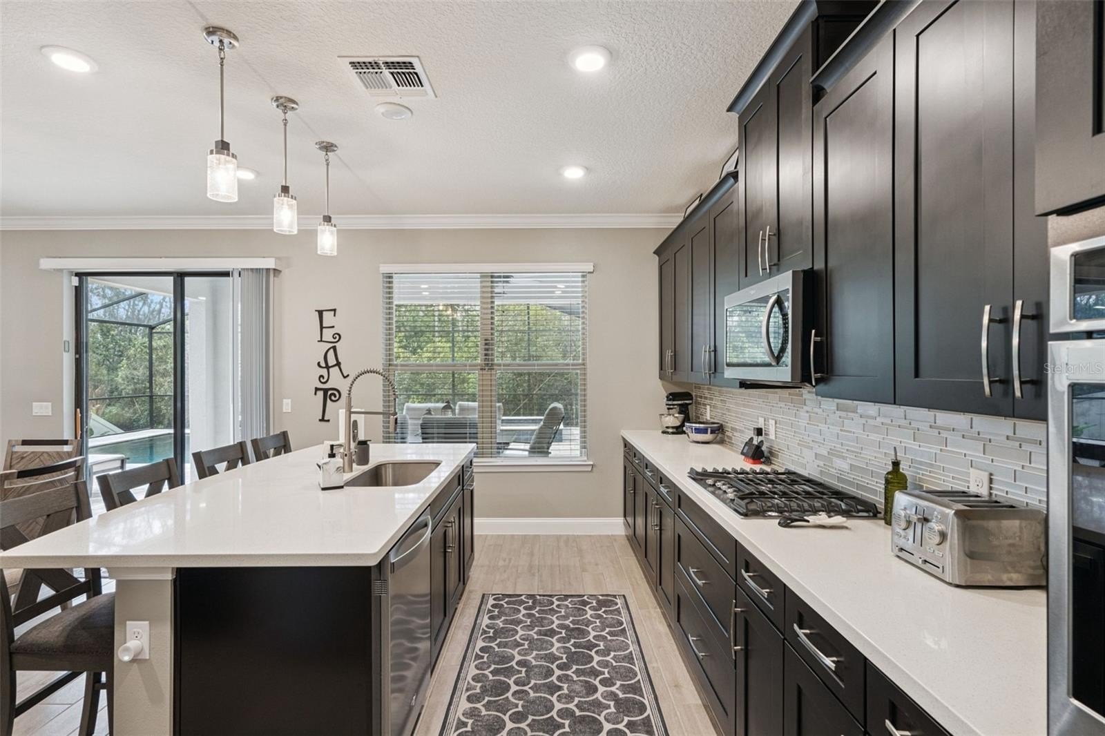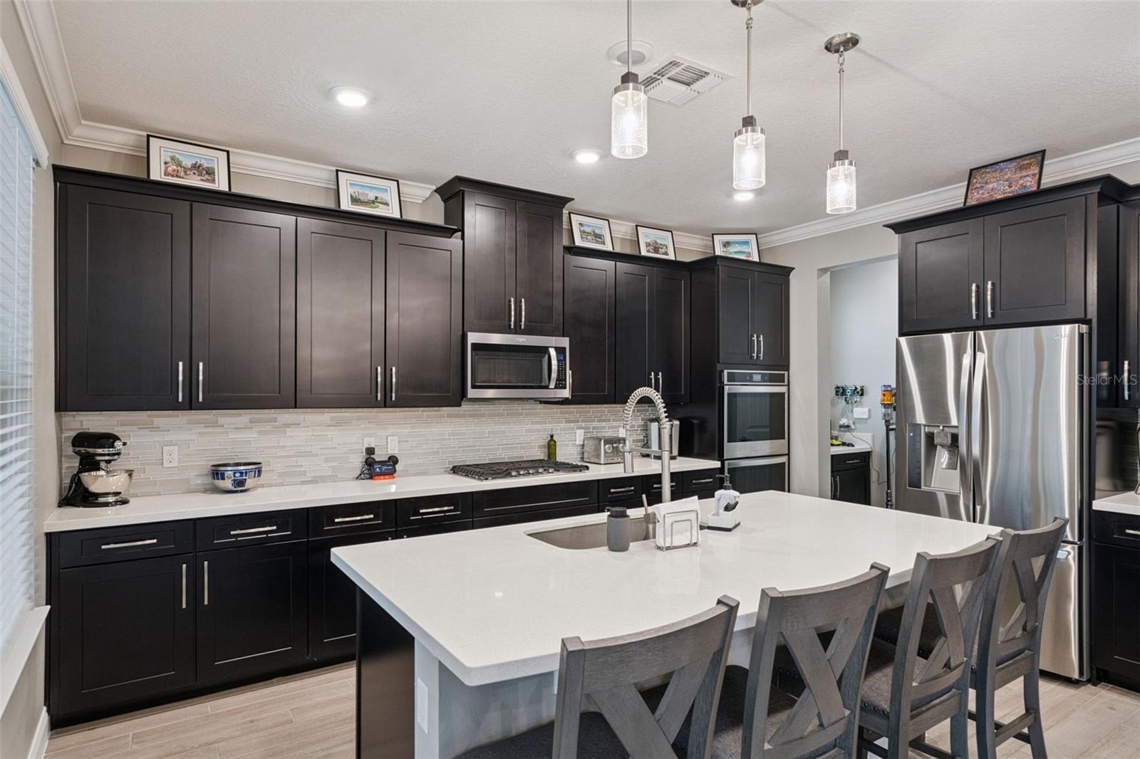 Also on the first floor, you’ll find a bedroom and full bath, perfect for guests, multigenerational living, or a private retreat. A versatile flex space with a coffered ceiling invites you to dine or dream, whether it becomes a home office, library, formal dining room, music room, or cozy reading nook—let your imagination go wild! The kitchen is the heart of the home, featuring upgraded cabinetry, quartz countertops, a gas cooktop, built-in microwave, and a spacious island with pendant lighting. An additional bank of cabinets offers the perfect spot for entertaining, prepping, or creating your own coffee or wine bar.