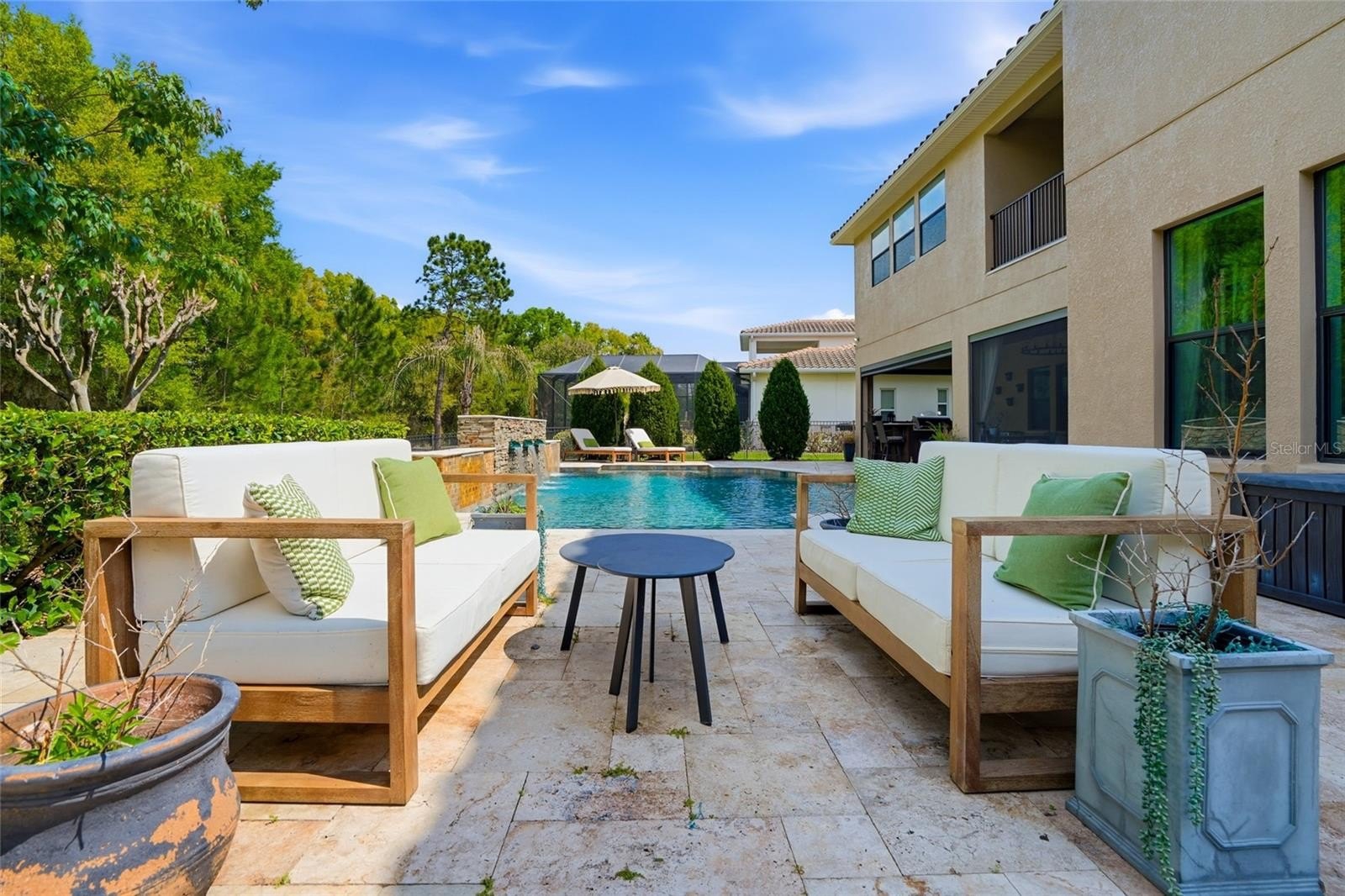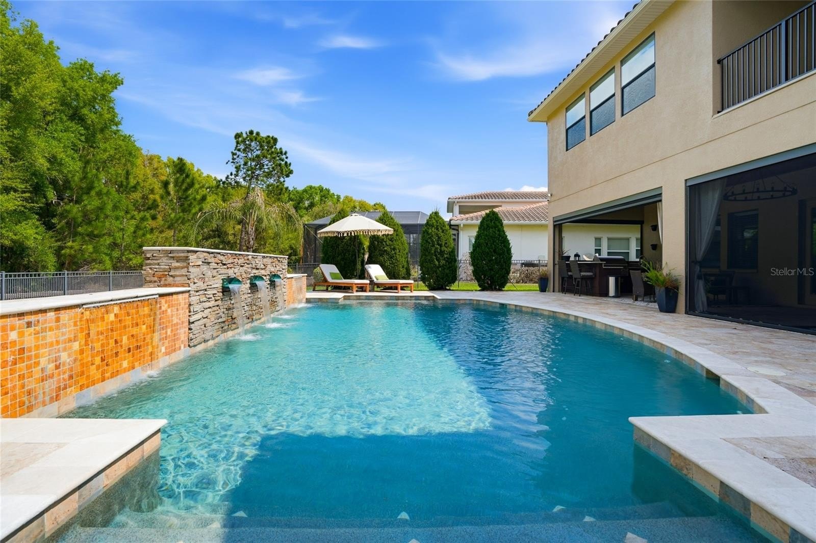 Step outside to experience true Florida luxury. A lanai overlooks your private outdoor oasis, complete with a saltwater pool elegant water features, expansive travertine decking. All while backing to serene conservation views for ultimate privacy.