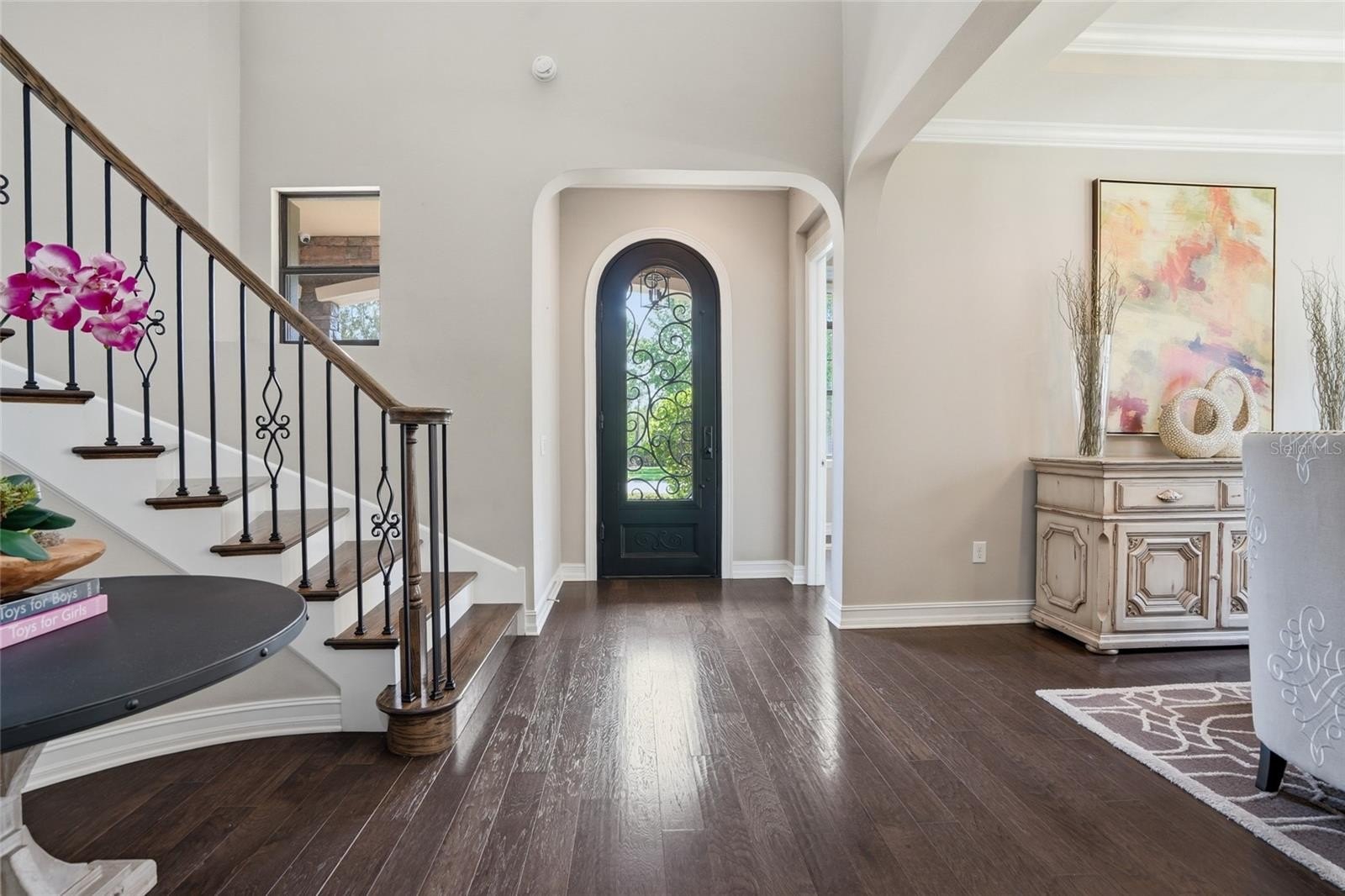 Spanning over 5,600 square feet, this impressive home welcomes you with a grand two-story foyer and sweeping semi-circular staircase, setting the tone for the elegance found throughout. This expansive open-concept layout, where natural light highlights upgraded flooring, designer finishes, and a sophisticated, cohesive design.