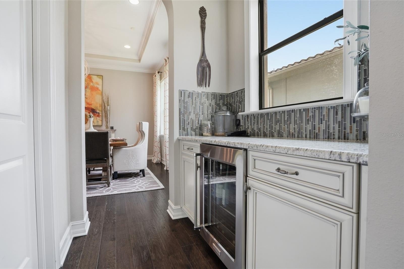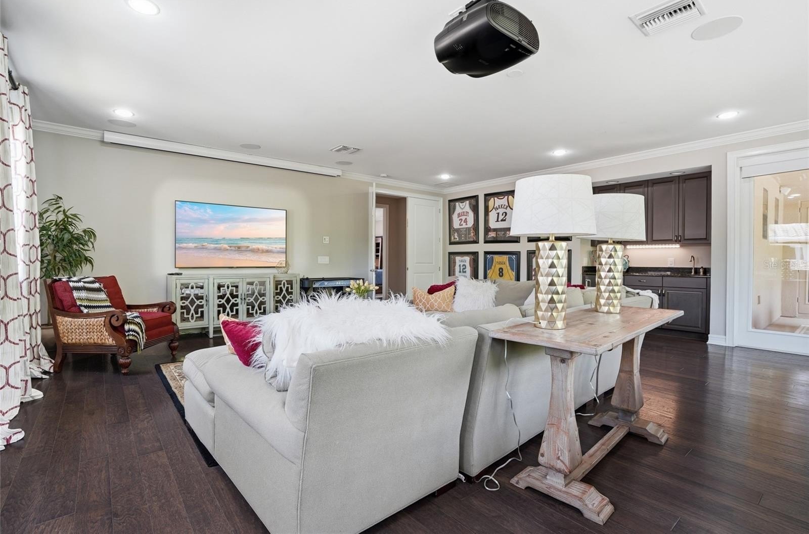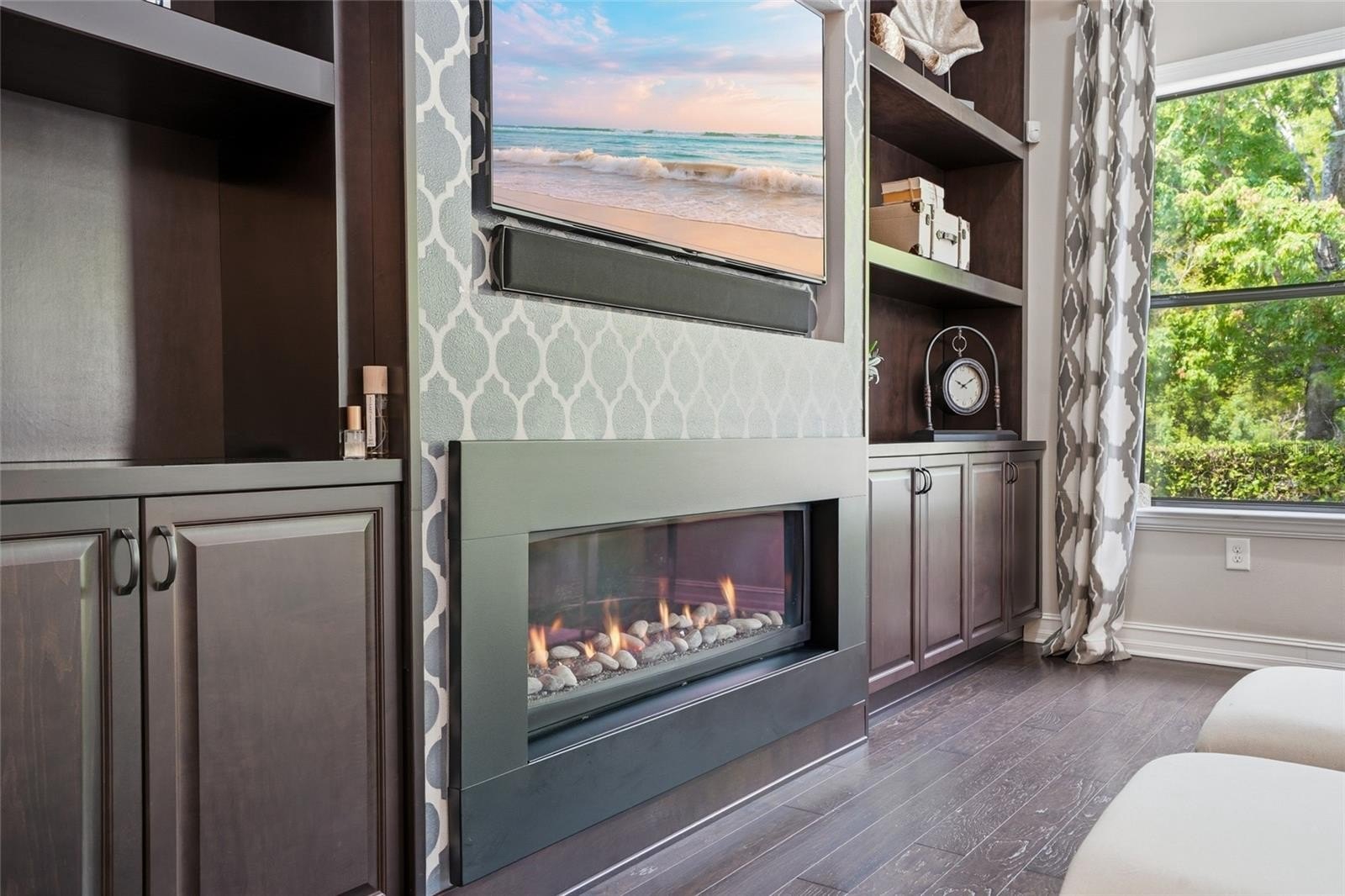 At the heart of the home, the gourmet kitchen is both functional and striking featuring an oversized island, premium cabinetry, granite countertops, Samsung stainless steel appliances, a 5-burner gas cooktop, and a beautifully appointed butler’s pantry with wine bar. The kitchen flows effortlessly into the spacious 18x20 family room, creating the perfect setting for everyday living and entertaining.