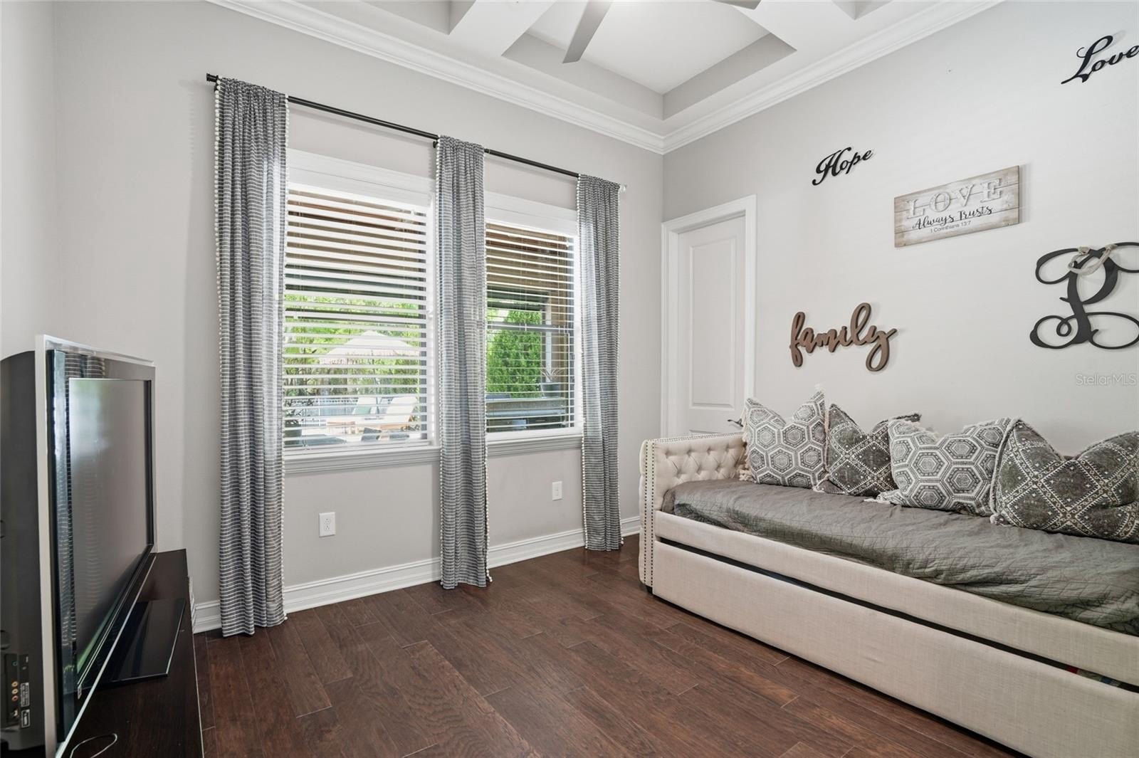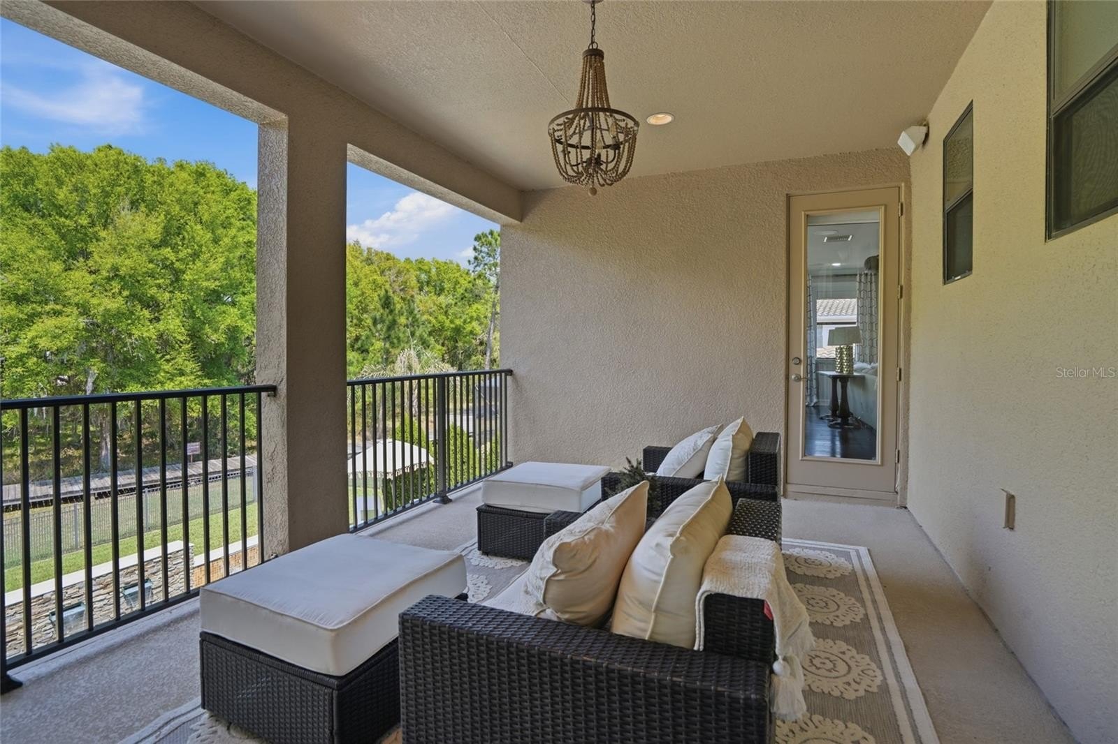 The home offers 6 bedrooms, 4.5 bathrooms, and a 3-car garage, providing ample space for family and guests. Upstairs, the luxurious owner’s retreat spans over 600 square feet, featuring a spacious 20x18 bedroom, a spa-inspired bath with a standalone soaking tub, oversized walk-in shower with dual showerheads, and two separate California-style walk-in closets connected by a private dressing room. A covered balcony just off the suite offers peaceful views of the resort style pool and surrounding nature.