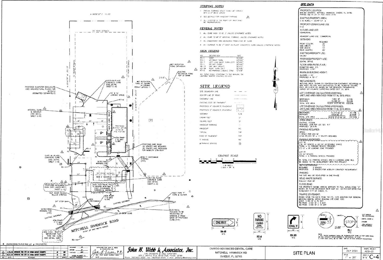 Maximum FAR 0.50. Direct approved driveway access onto Mitchell Hammock Road. Traffic count 38,745 AADT (2025). All utilities in place: City of Oviedo municipal water and sewer; Duke Energy electric. Site partially improved with commercial asphalt surface. Previously approved by City of Oviedo for 2,190 SF dental office; full engineering and SJRWMD stormwater permit completed — available to buyer upon request. 2021 approvals have lapsed; re-application required. Property falls within FEMA Flood Zone A, FIRM Map No. 12117C0190F, effective 9/28/2007; prior stormwater design addressed this designation.