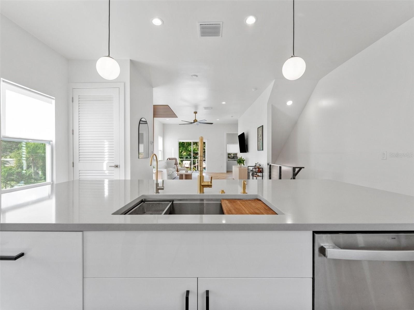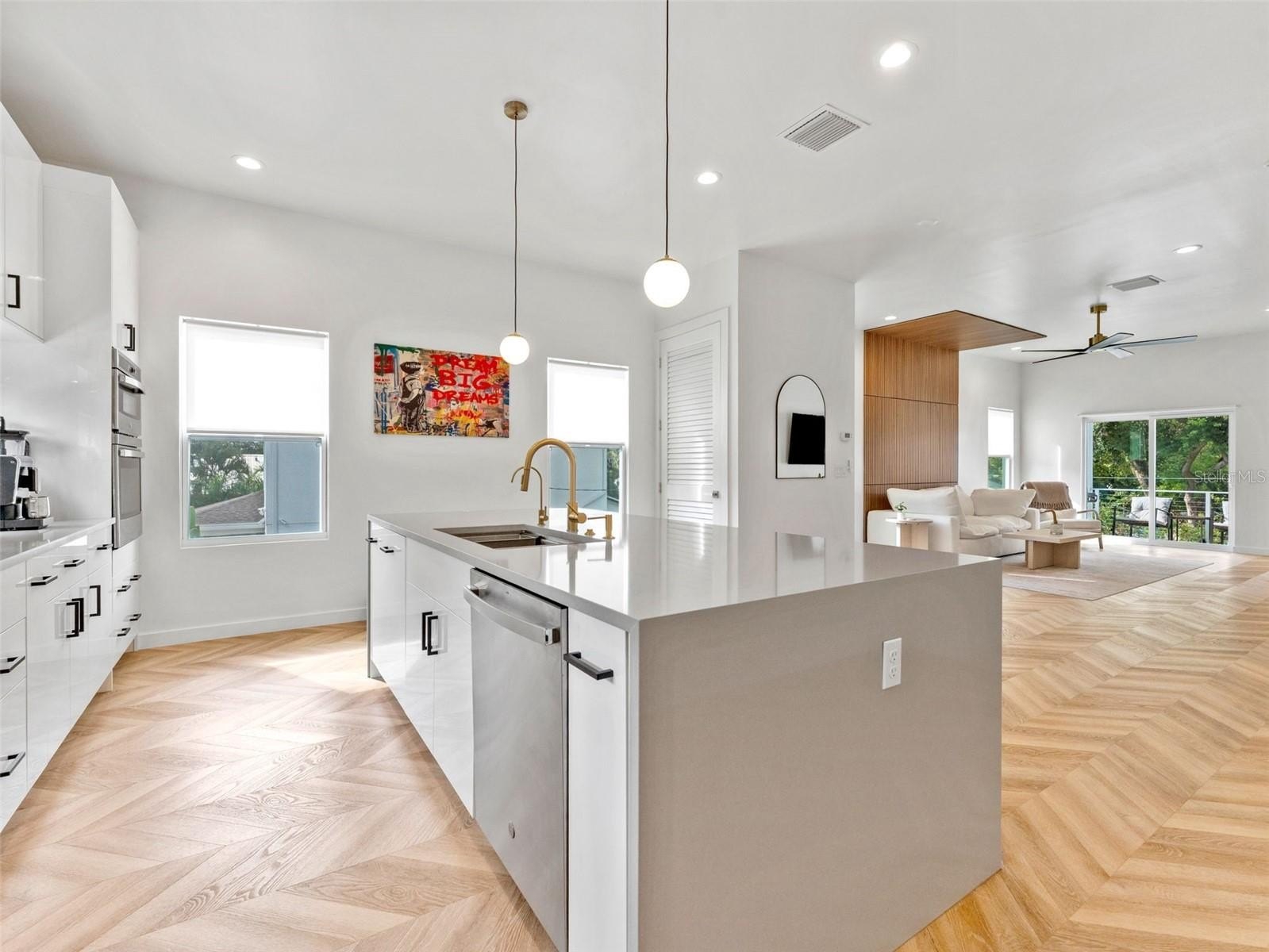The second floor showcases an open-concept living space with a seamless flow between the kitchen and living room, plus a private balcony. The kitchen is built for both style and function with quartz countertops, a 10-foot island, flat-panel cabinetry, and abundant natural light.