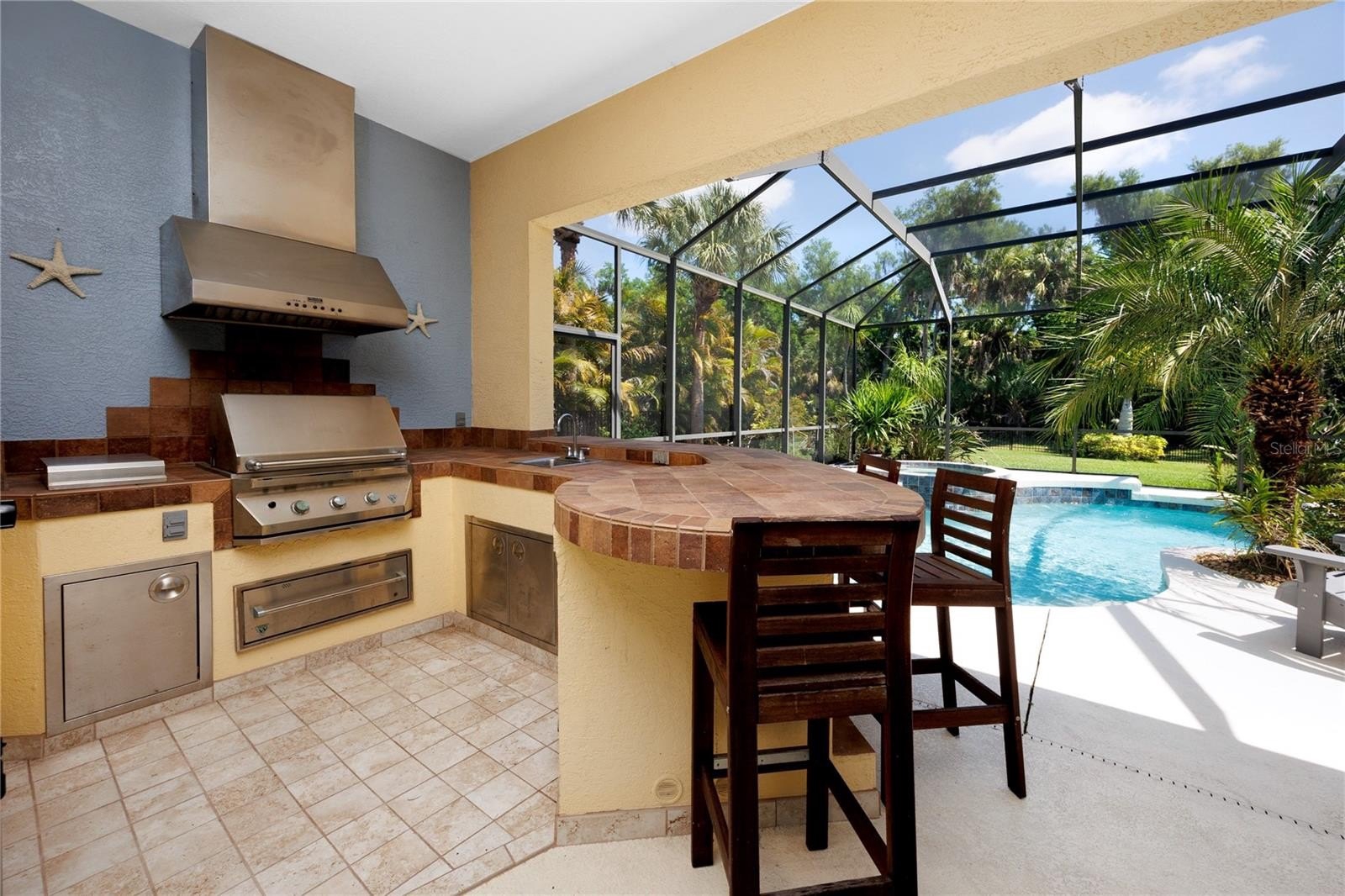 The outdoor kitchen is thoughtfully designed for entertaining on any scale and includes a gas grill, warming drawer, sink, refrigerator, tile bar, and integrated surround sound speakers that extend throughout the home, delivering a seamless indoor and outdoor entertainment experience.