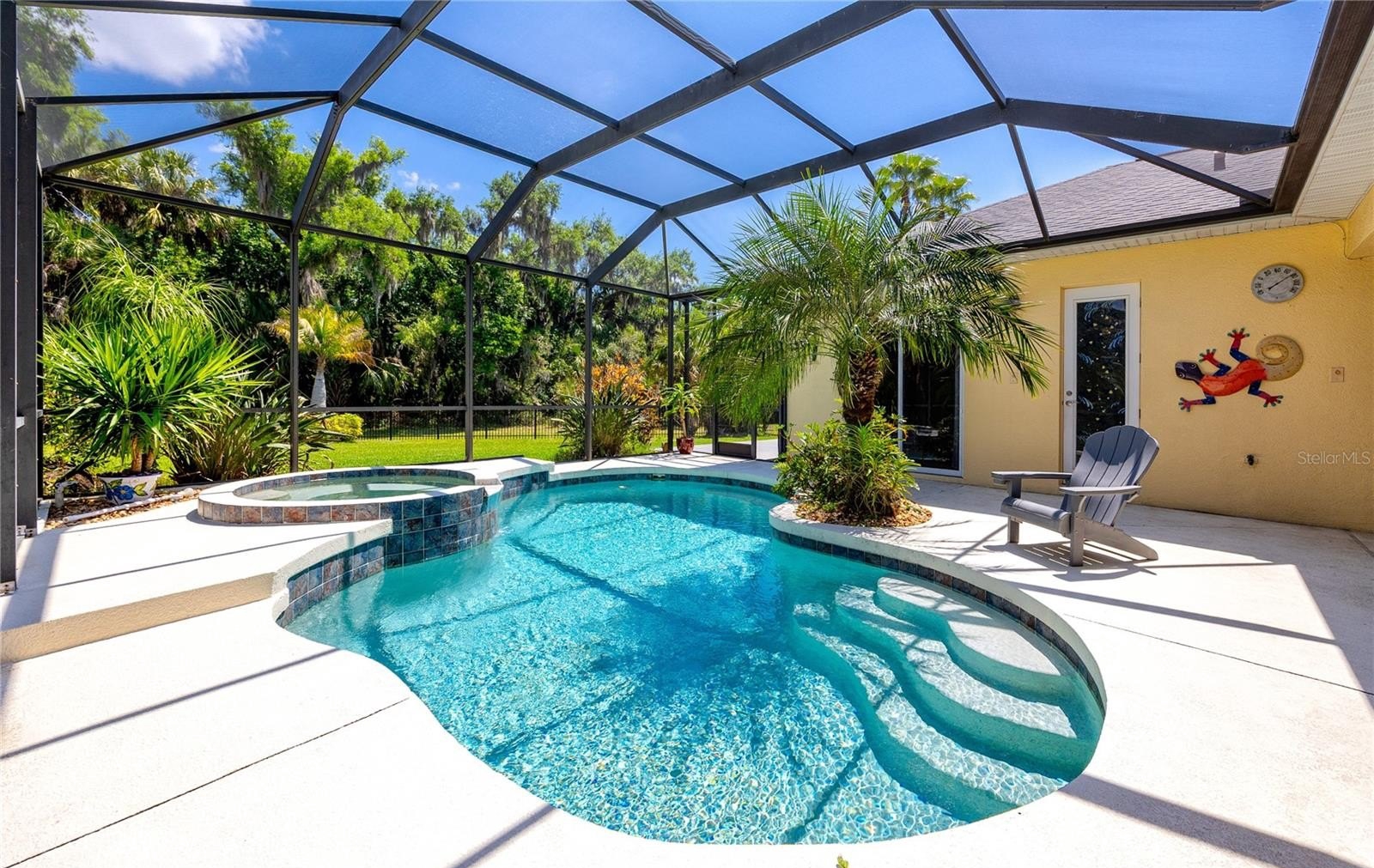 Designed for seamless indoor-outdoor living, the home opens effortlessly to a screened lanai featuring a heated saltwater pool and spa, along with a fully equipped outdoor kitchen, creating a true resort-style environment ideal for both entertaining and everyday relaxation. The fenced backyard, tropical landscaping, landscape lighting, and rain gutters complete the home’s meticulously maintained exterior.