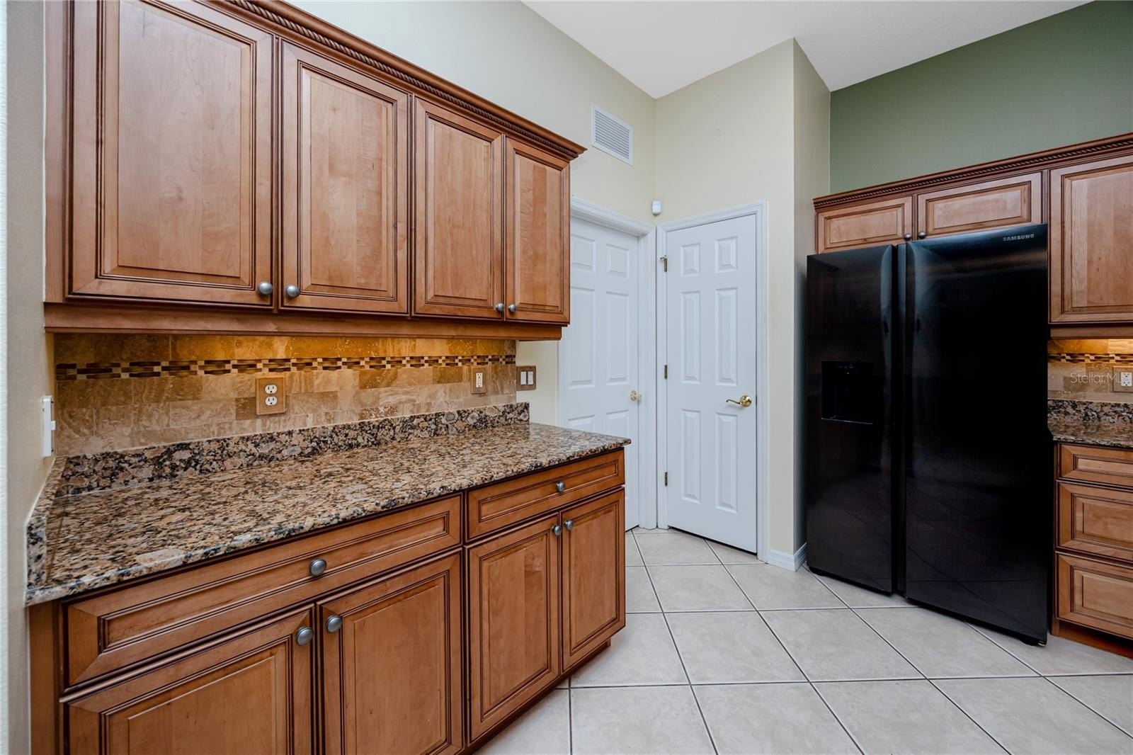 Inside, the chef’s kitchen is both elegant and functional, showcasing upgraded Samsung appliances, a custom designer backsplash, and striking granite countertops featuring lighter tones along the perimeter complemented by a dramatic onyx island that serves as a stunning focal point.