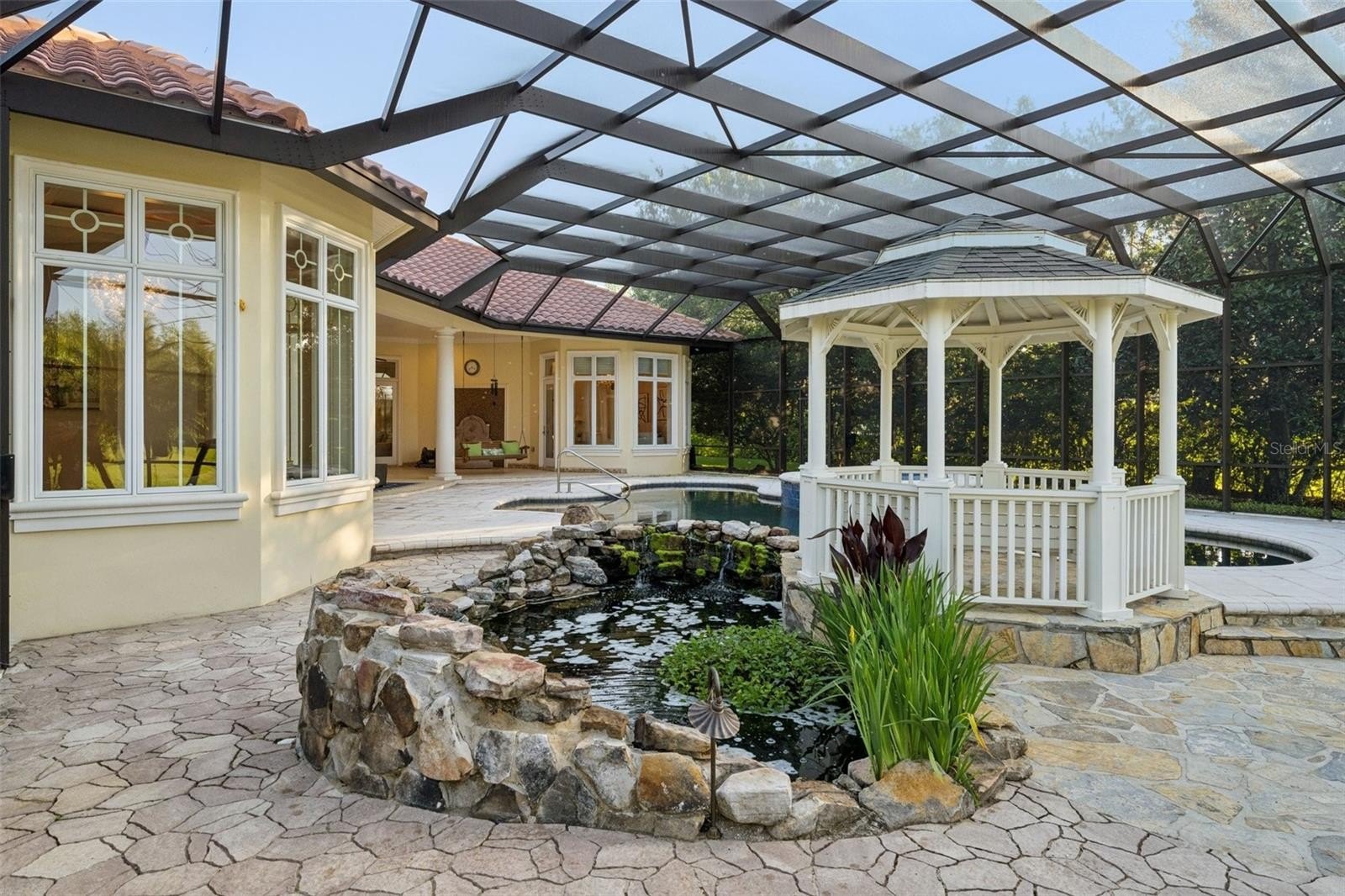 Outdoors is where this home truly stands out. The screened lanai is designed for year-round enjoyment, featuring a heated saltwater pool and spa, a tranquil koi pond, and a beautiful gazebo. The outdoor kitchen—complete with a gas grill, vent hood, and prep space—makes entertaining effortless. Just beyond, a dedicated fire pit area with a pizza oven creates a relaxed, inviting space for gathering with family and friends.